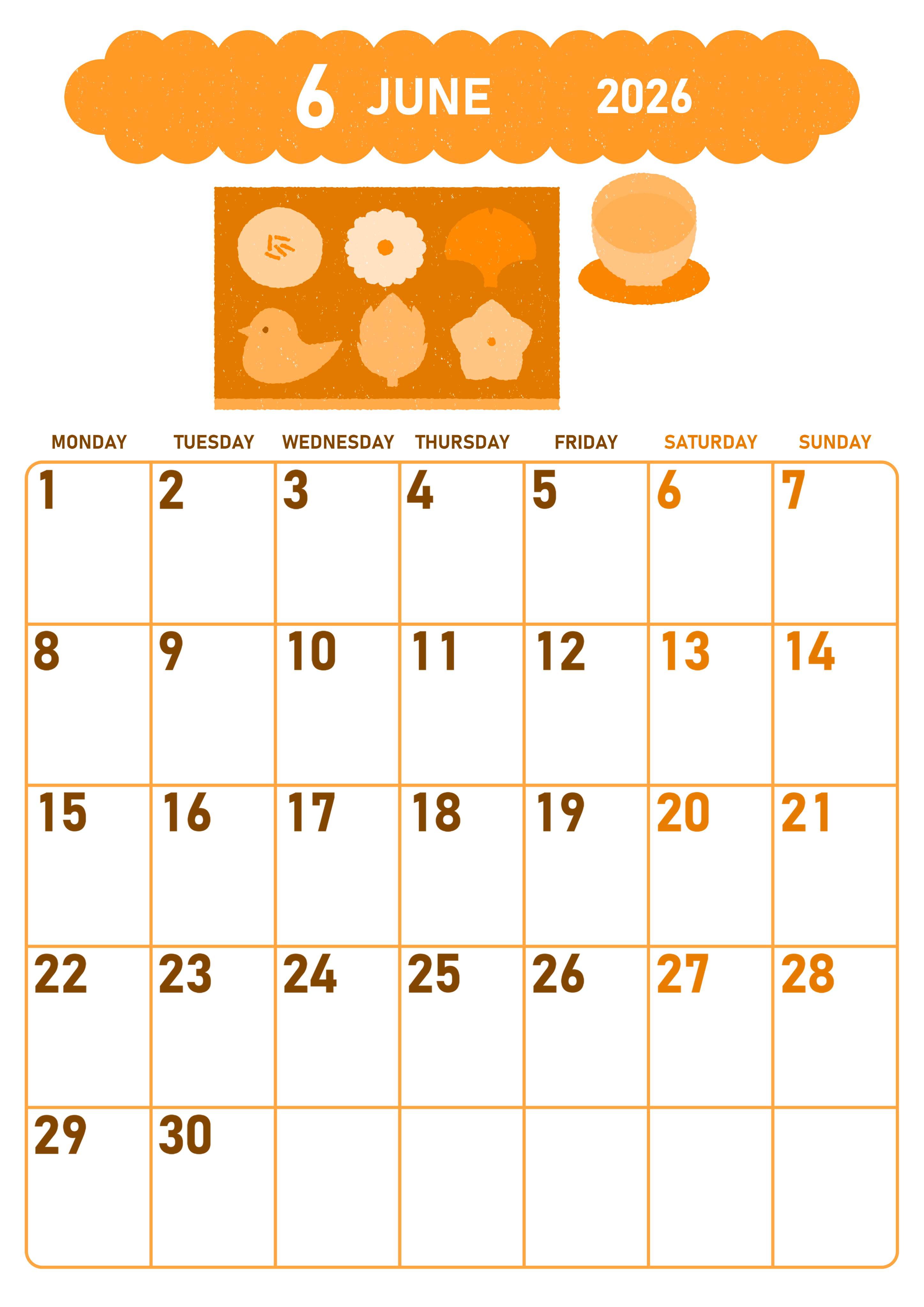 2026年6月縦型月曜始まりの無料テンプレートオレンジのカレンダーです。月曜始まりオレンジのカレンダーに馴染みがあるという人におすすめしたい和菓子イラストがポイントになっているかわいいフォーマットの素材です。(2026-01070611)