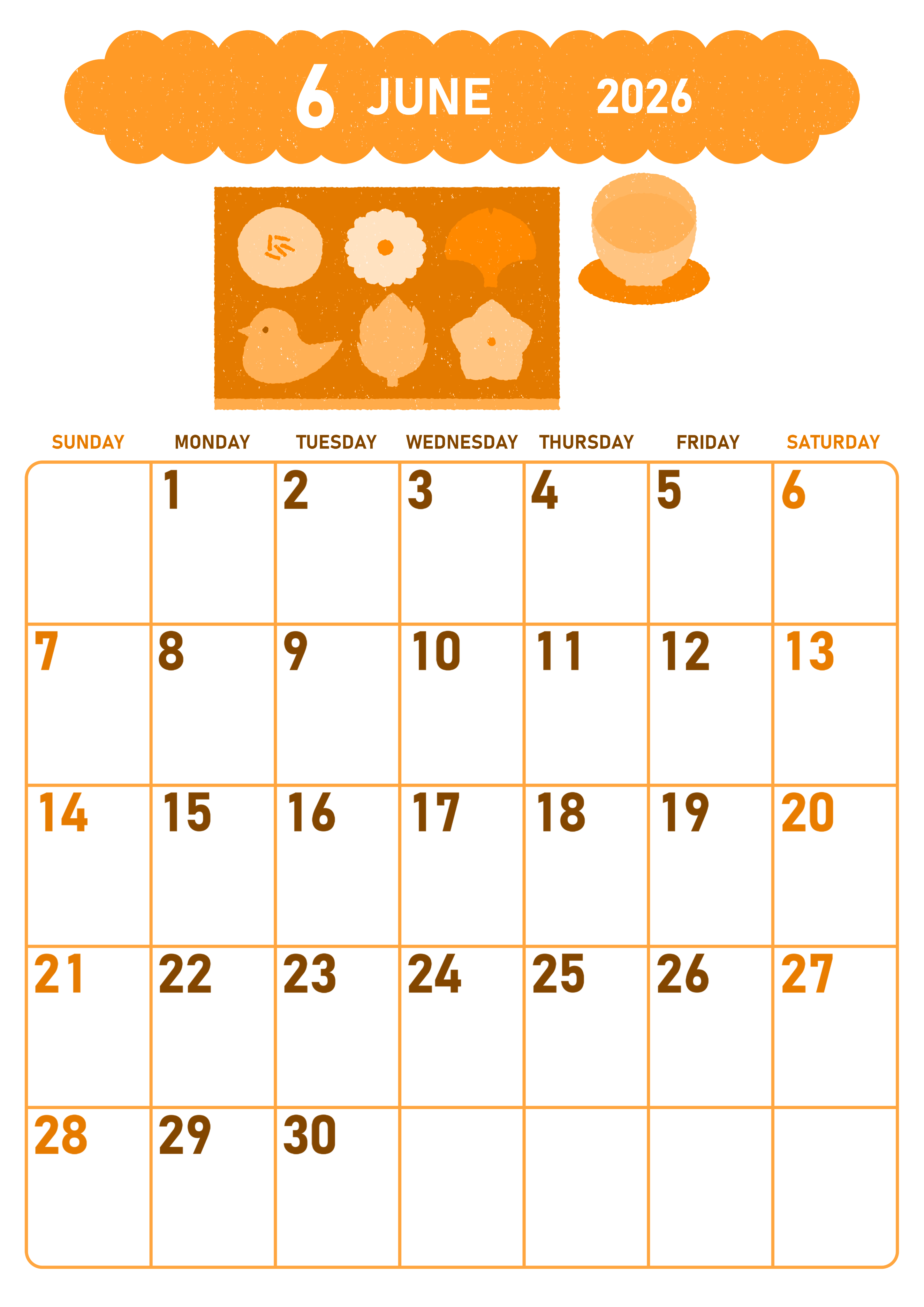 2026年6月縦型日曜始まりの無料テンプレートオレンジのカレンダーです。和菓子のイラストがおいしそうでよだれがでそうな見ていて想像力を掻き立てられるようなかわいいイラストオレンジのカレンダーとなっています。(2026-01070610)
