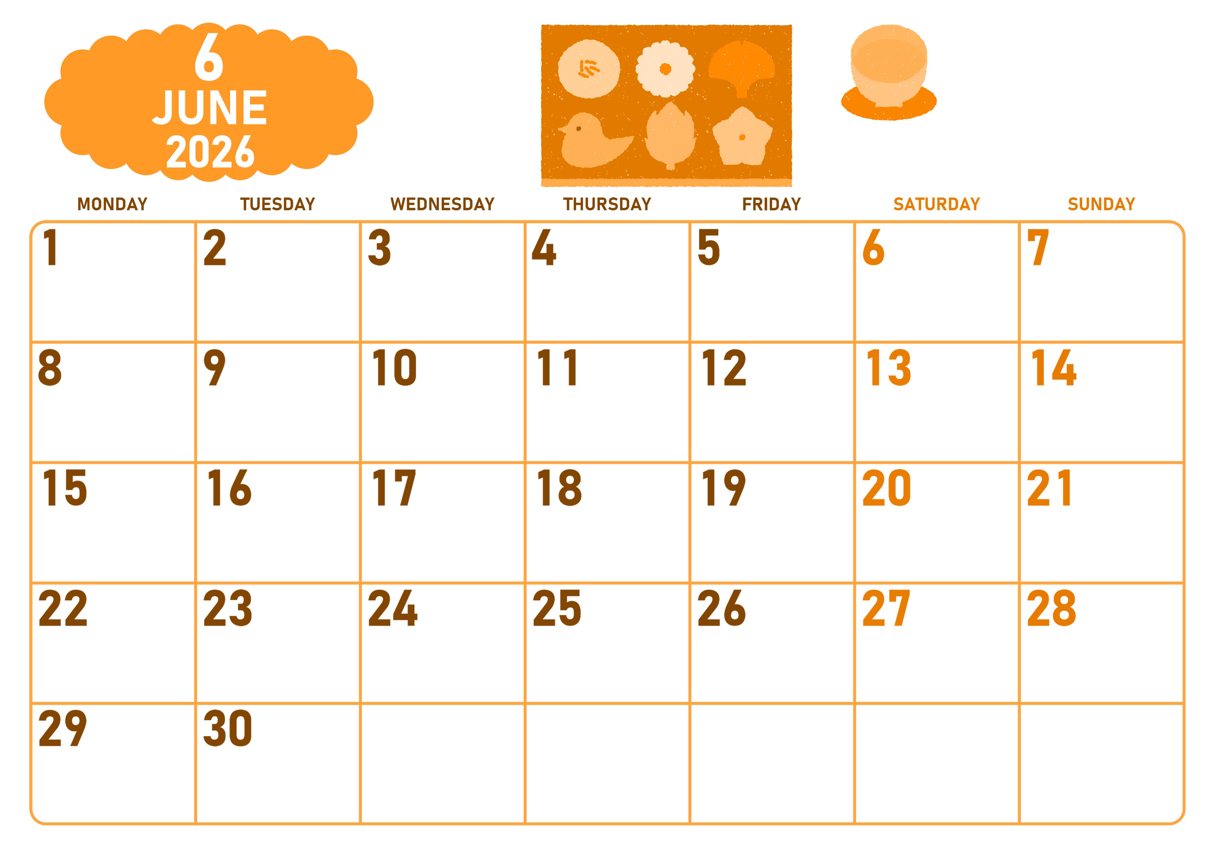 2026年・無料のカレンダーテンプレート 2026年6月横型月曜始まり 和菓子イラストのかわいいA4無料オレンジのカレンダー(2026-01070601) 素材状デザイン王 2025年4月7日 2026年6月横型月曜始まりの無料テンプレートオレンジのカレンダーです。月曜始まりで曜日の文字が色分けされているので見やすくて便利なオレンジのカレンダーです。和菓子と緑茶のイラストもかわいいです。(2026-01070601) 6月 横型のカレンダー 月曜始まり オレンジ カレンダーデザイン-0107