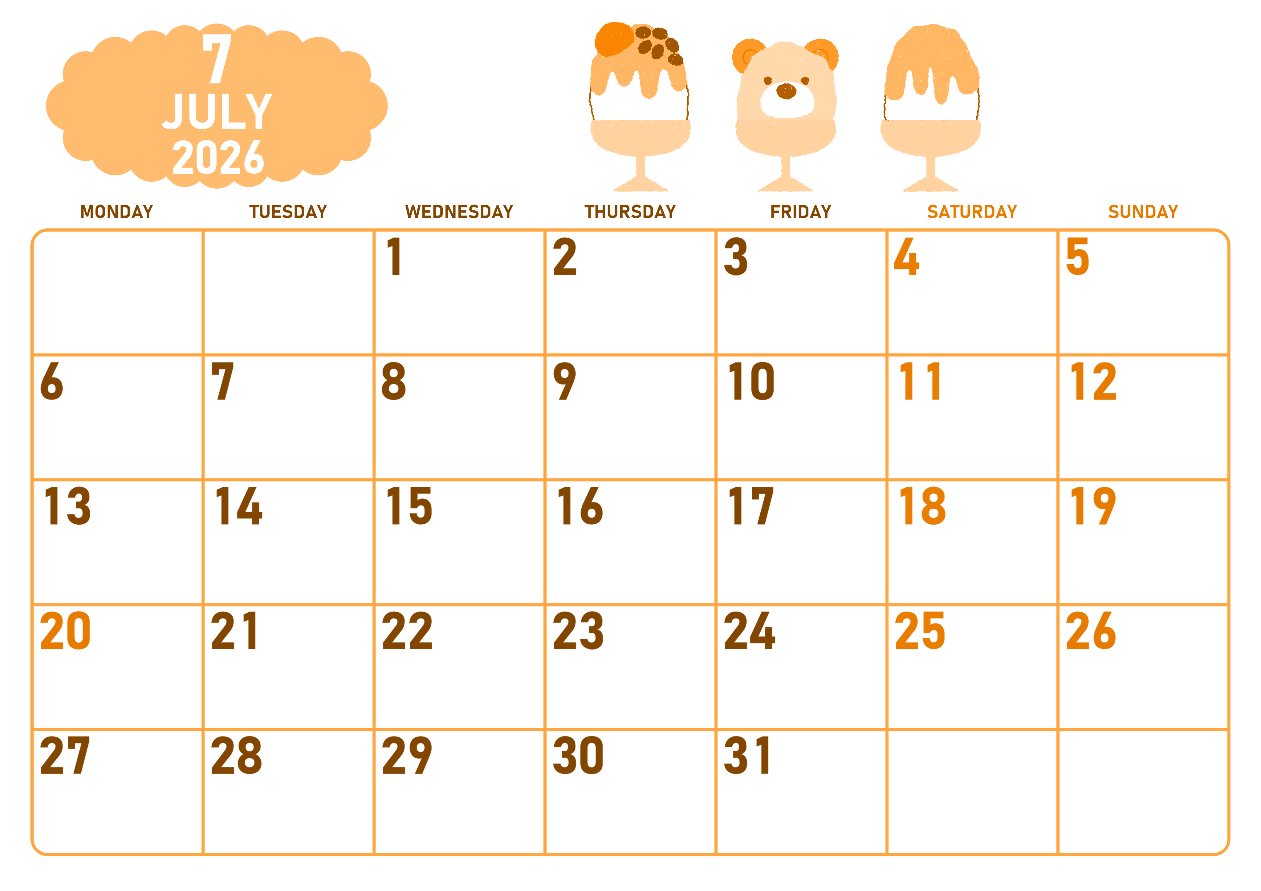 2026年7月横型月曜始まりの無料テンプレートオレンジのカレンダーです。月曜始まりで罫線が引かれているのでプランニングに役立つオレンジのカレンダーです。イラストは3つのかき氷を起用していて中央のデザインがクマで遊び心もあってかわいいです。(2026-01070701)