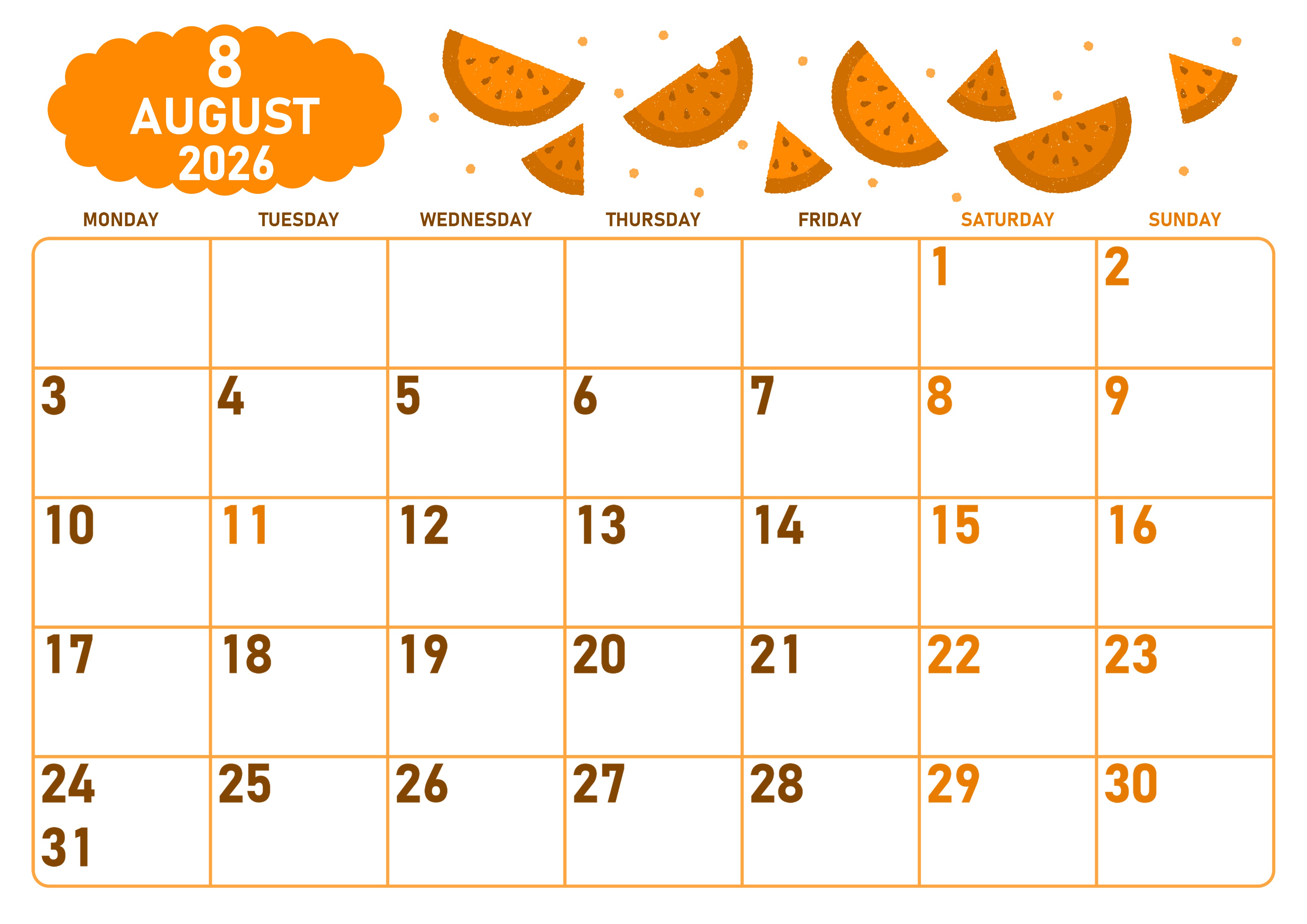 2026年8月横型月曜始まりの無料テンプレートオレンジのカレンダーです。夏の季節の果物といえばスイカです。かわいいイラストの中に一口かじられたスイカがいるので探してみて下さい。月曜始まりでA4サイズのオレンジのカレンダーです。(2026-01070801)
