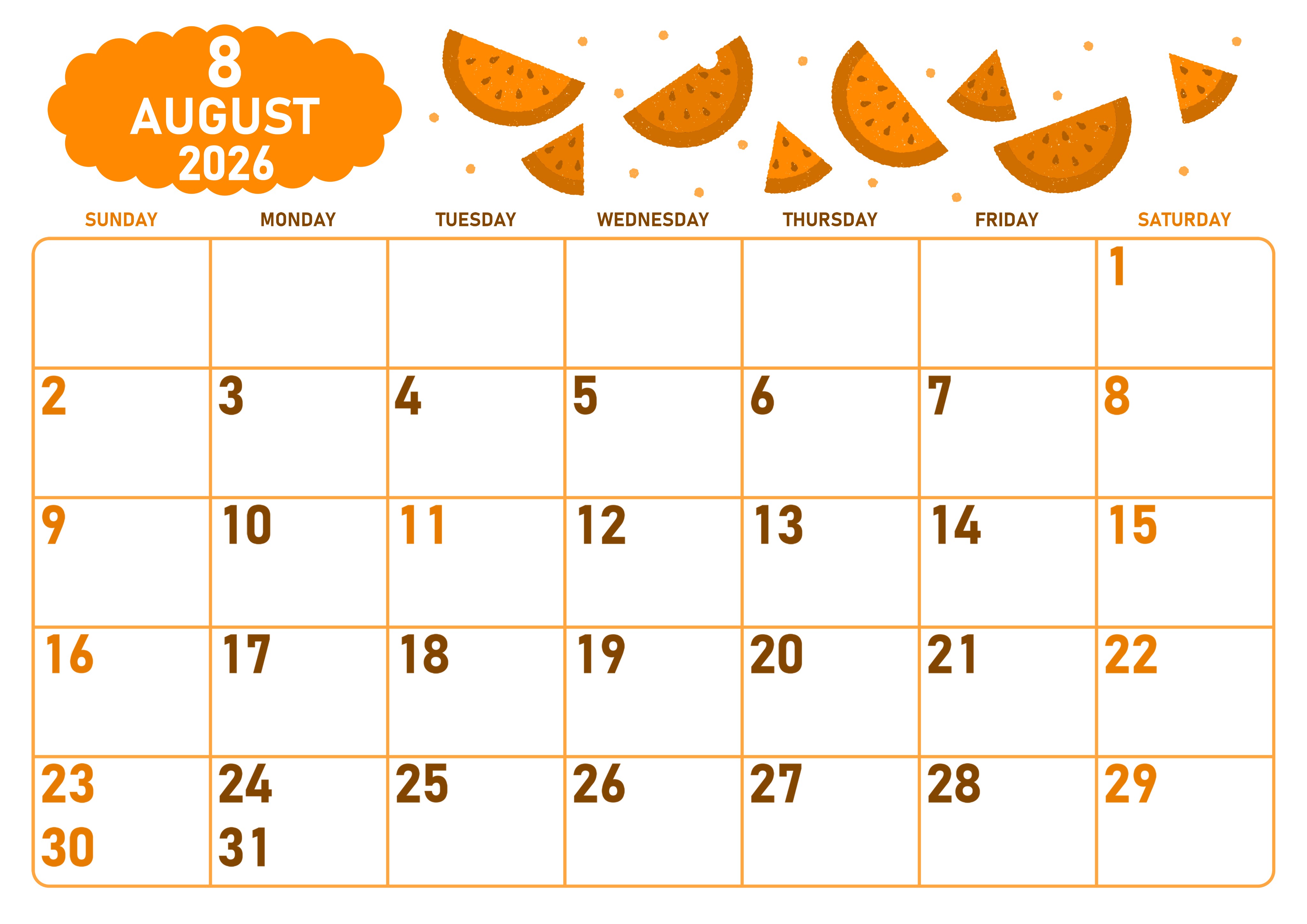 2026年8月横型日曜始まりの無料テンプレートオレンジのカレンダーです。季節の果物であるスイカを散りばめている遊び心が伝わってくるかわいいポップなデザインのイラストオレンジのカレンダーを用意しました。(2026-01070800)