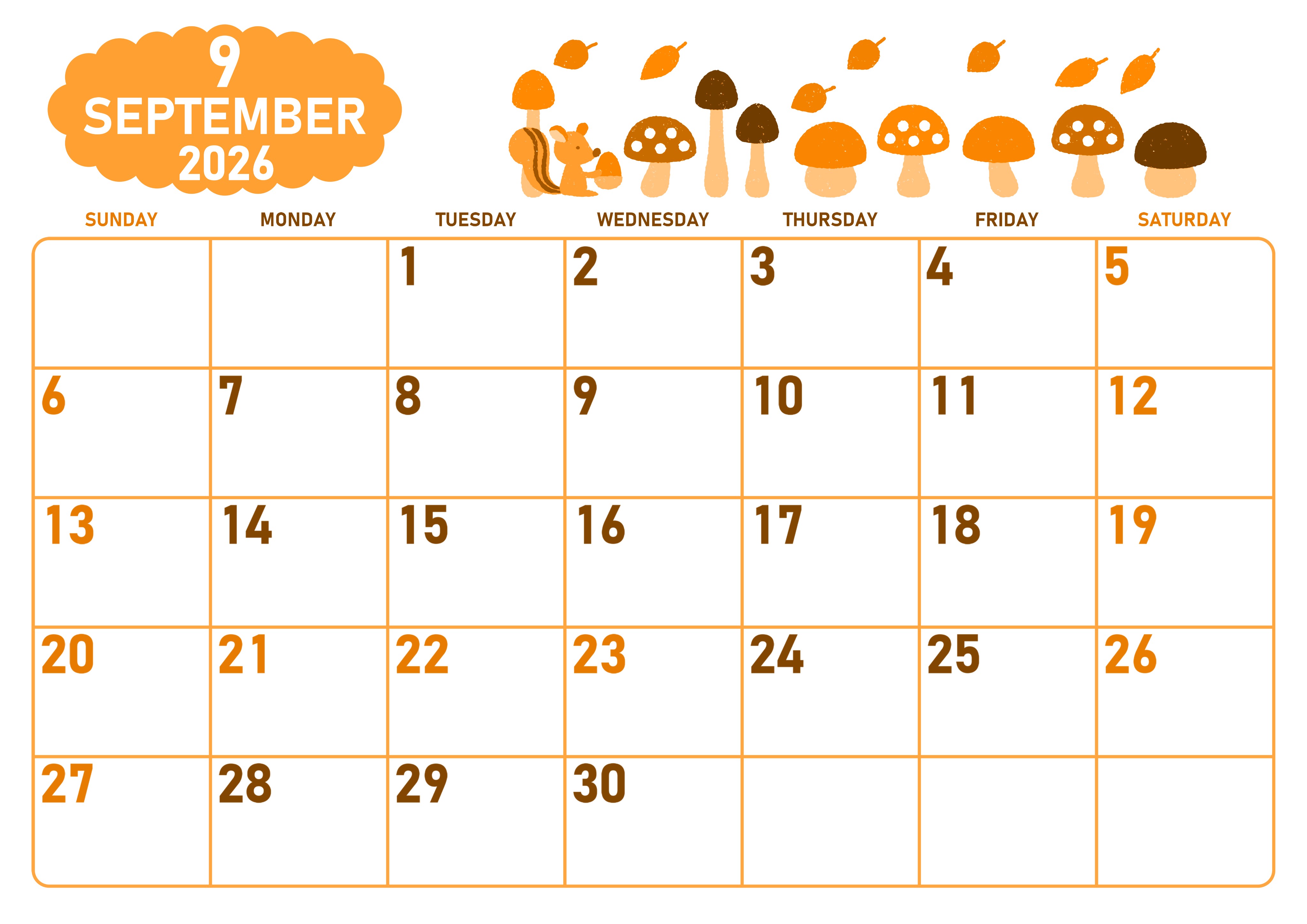 2026年9月横型日曜始まり 秋の季節イラストがかわいいA4無料オレンジのカレンダー(2026-01070900)