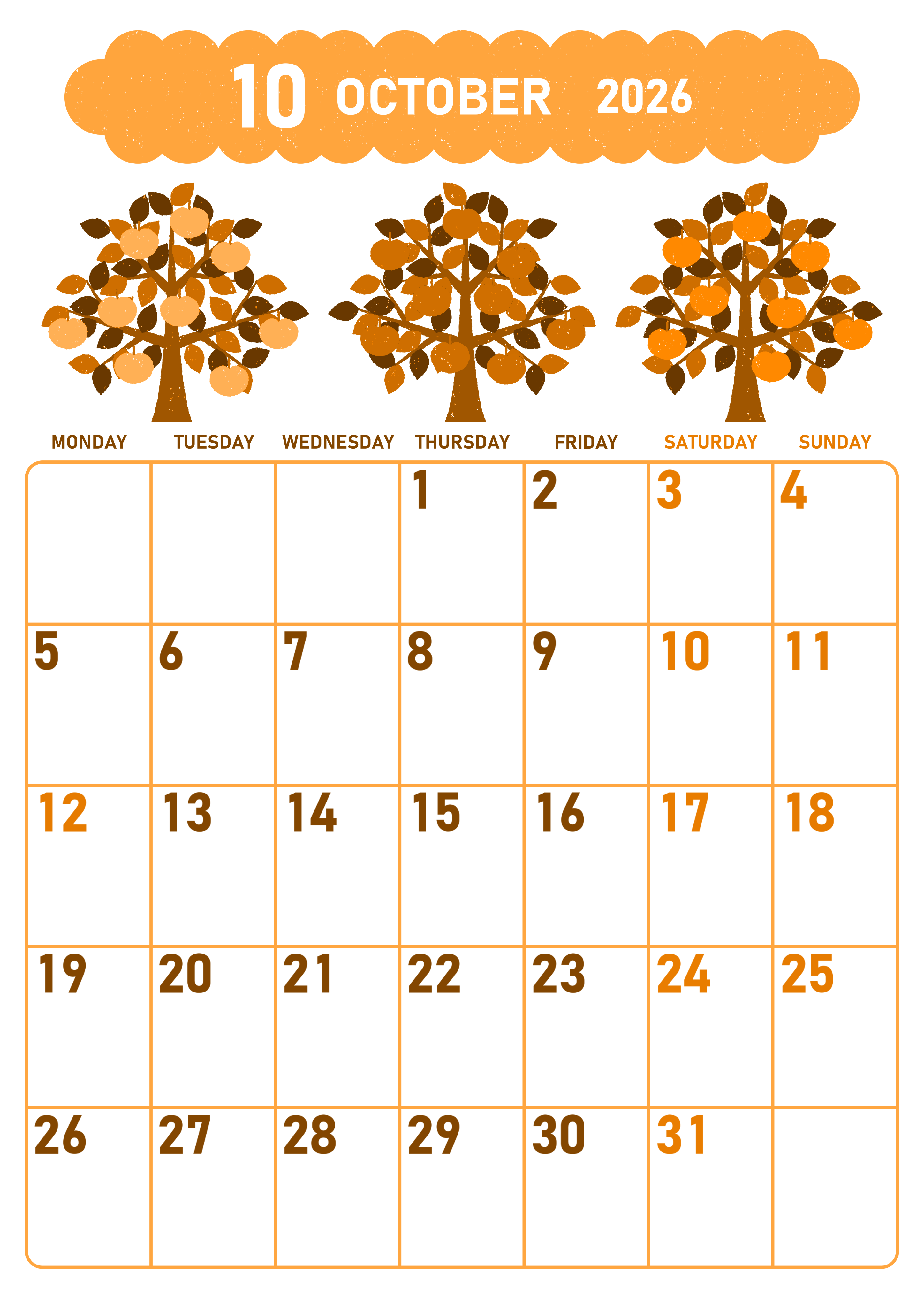 2026年・無料のカレンダーテンプレート 2026年10月縦型月曜始まり リンゴの木イラストのかわいいA4無料オレンジのカレンダー(2026-01071011) 素材状デザイン王 2025年4月7日 2026年10月縦型月曜始まりの無料テンプレートオレンジのカレンダーです。リンゴの木を並べて描いたかわいいイラストに仕上がっています。文字フォントも太めのゴシック体なのでかわいいが溢れています。(2026-01071011) 10月 縦型のカレンダー 月曜始まり オレンジ カレンダーデザイン-0107