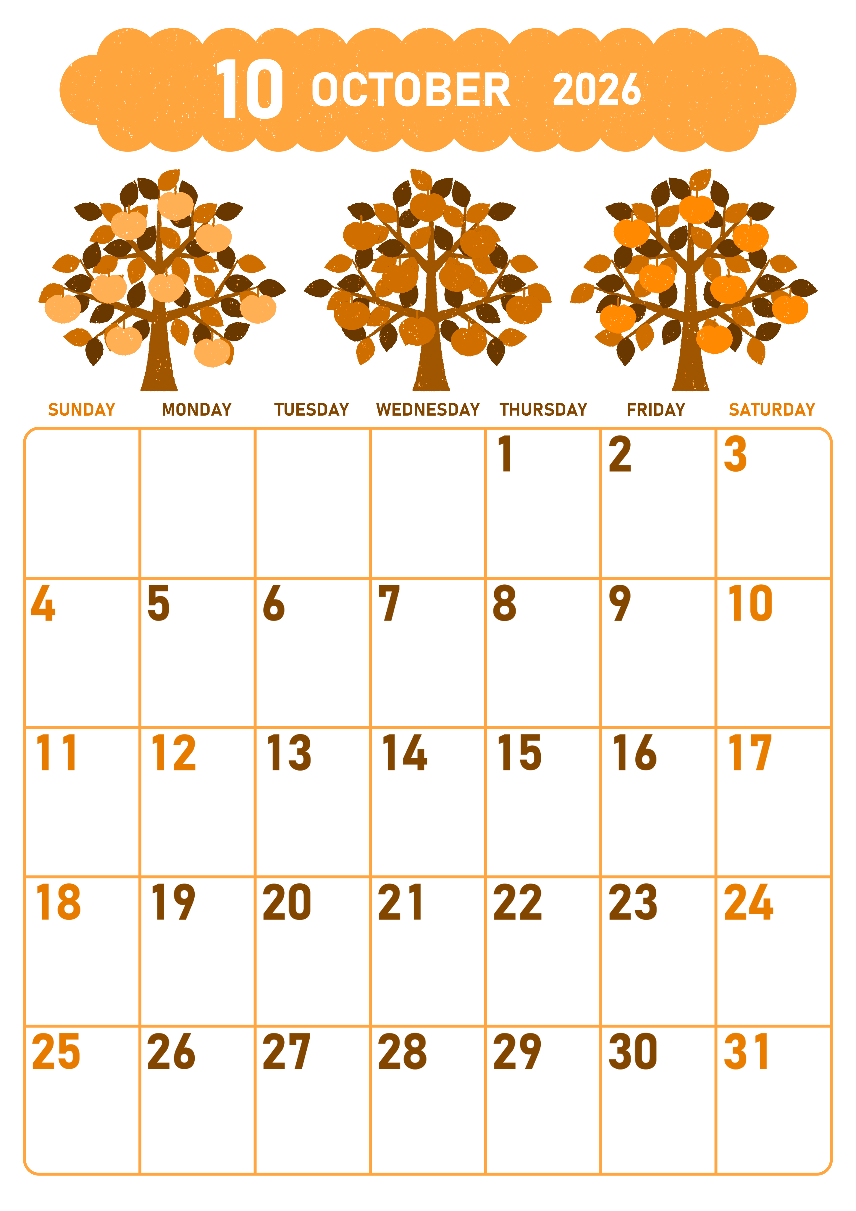 2026年10月縦型日曜始まりの無料テンプレートオレンジのカレンダーです。リンゴの木のイラストがかわいいです。罫線が引かれていて余白もたっぷりで曜日で文字色分けがされているので利便性も高いです。(2026-01071010)