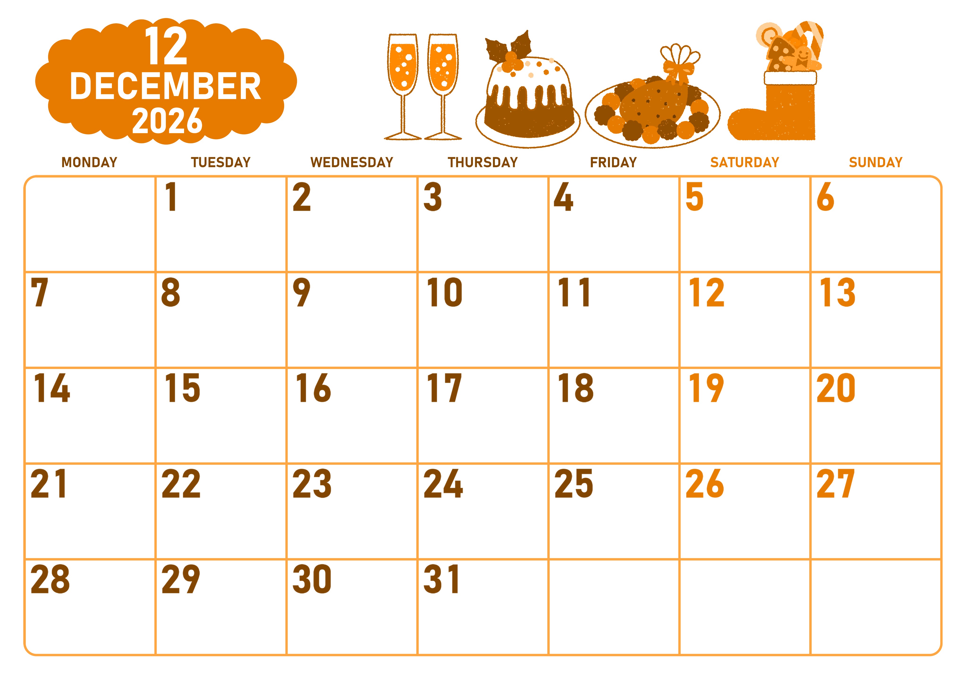 2026年12月横型月曜始まりの無料テンプレートオレンジのカレンダーです。クリスマスイブに食べたくなるような御馳走のイラストが目を引くかわいい素材です。月曜始まりタイプが好きな人へおすすめです。(2026-01071201)