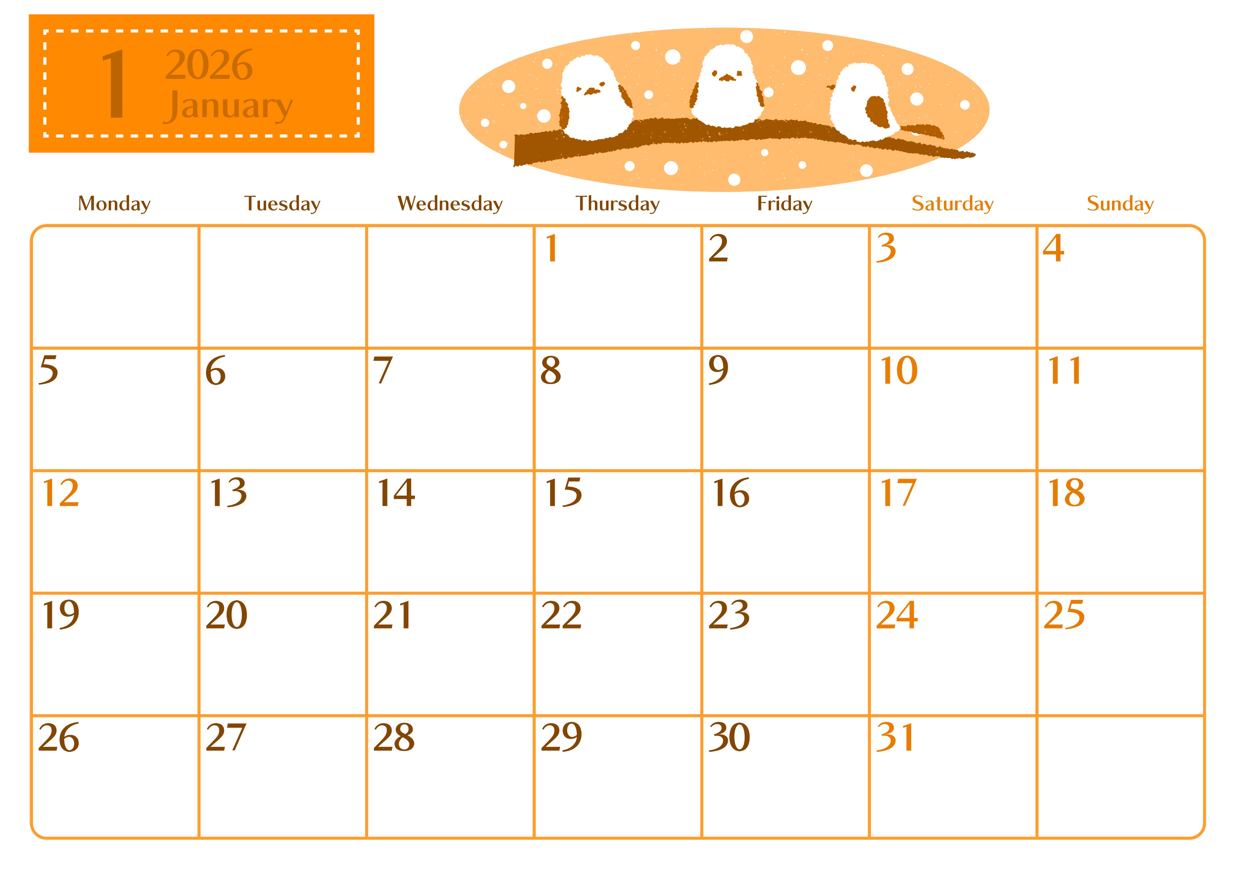 2026年・無料のカレンダーテンプレート 2026年1月横型月曜始まり イラストのおしゃれA4無料オレンジのカレンダー(2026-01080101) 素材状デザイン王 2025年4月7日 2026年1月横型月曜始まりの無料テンプレートオレンジのカレンダーです。新年、気持ちを改めて計画を立てるのにおすすめの無料素材となっています。(2026-01080101) 1月 横型のカレンダー 月曜始まり オレンジ カレンダーデザイン-0108
