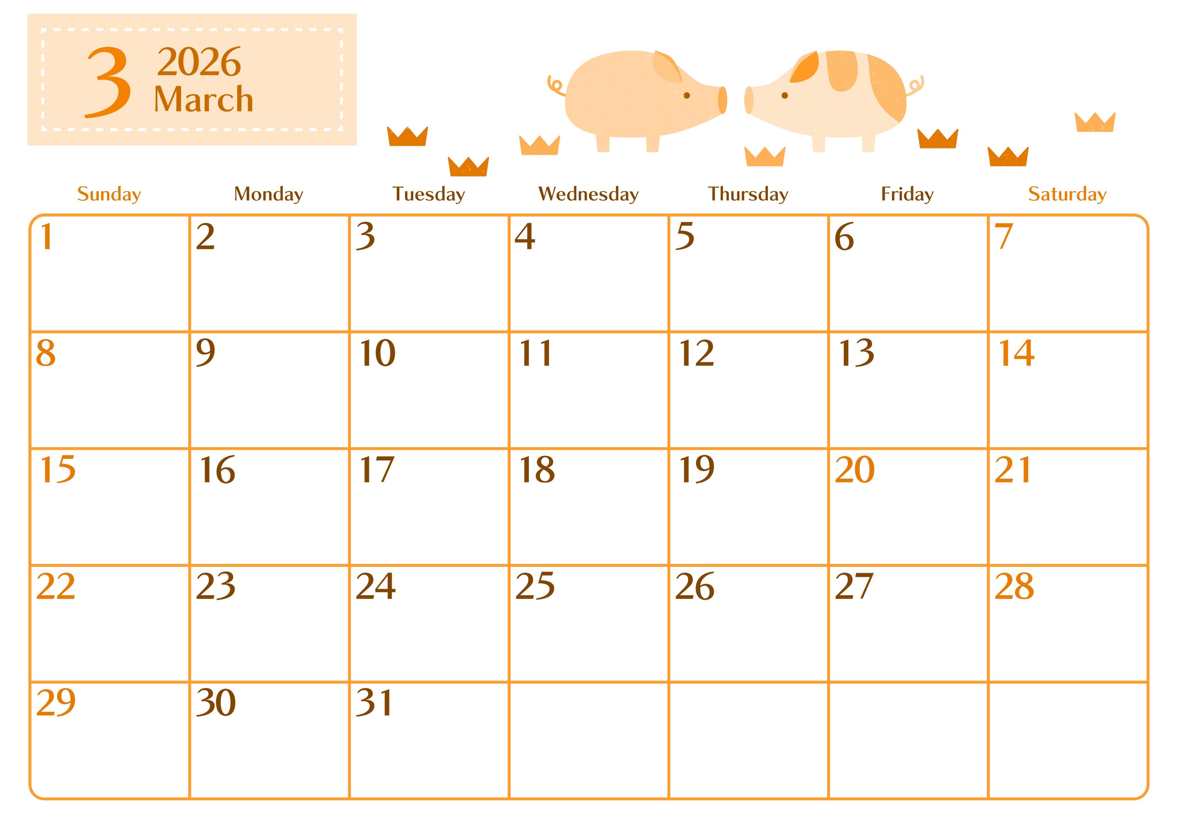 2026年3月横型日曜始まりの無料テンプレートオレンジのカレンダーです。子豚のカップルが仲良くしているおしゃれなアニマルテイストのオレンジのカレンダーです。曜日によって文字の色分けがされているので役に立ちます。(2026-01080300)