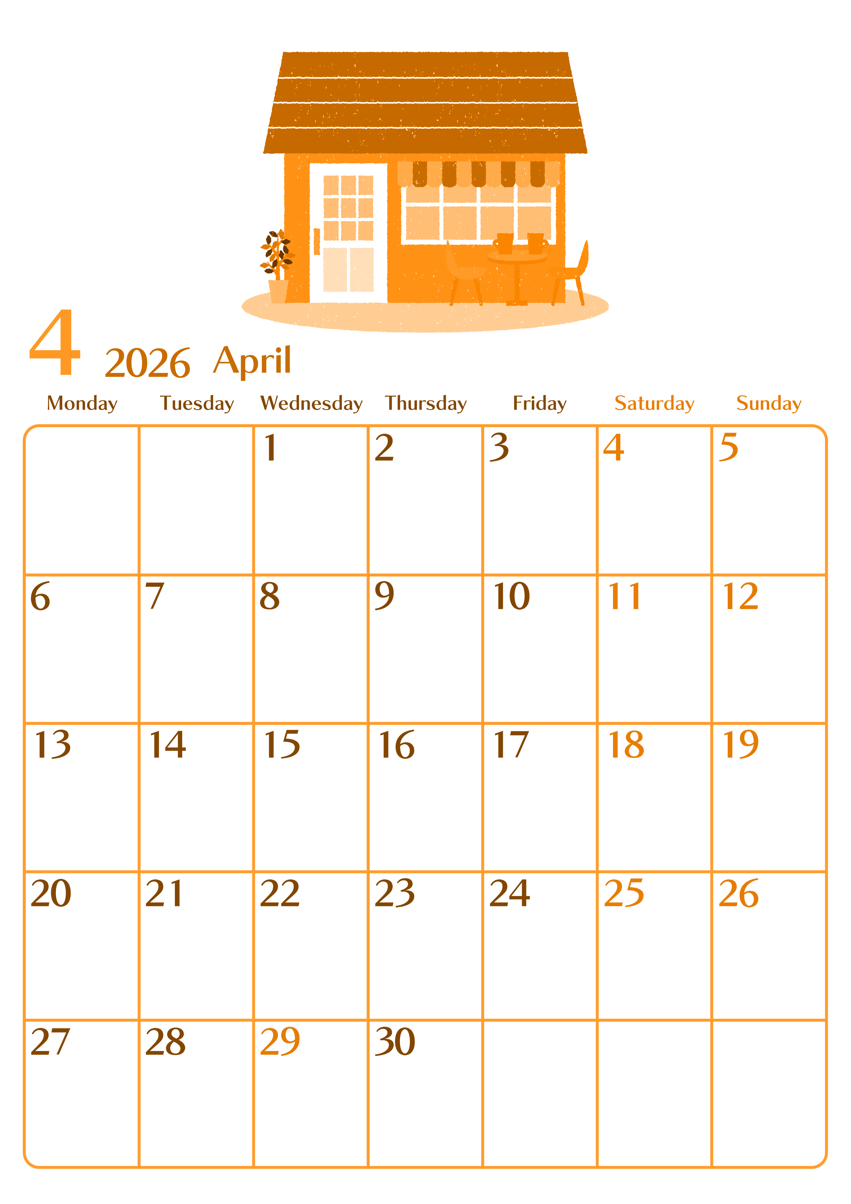 2026年4月縦型月曜始まりの無料テンプレートオレンジのカレンダーです。縦型レイアウトのオレンジのカレンダーなので壁に画鋲で貼ってスケジュールを見える化するために便利です。新生活を思わせるお家のイラストもシンプルでおしゃれなワンポイントです。(2026-01080411)