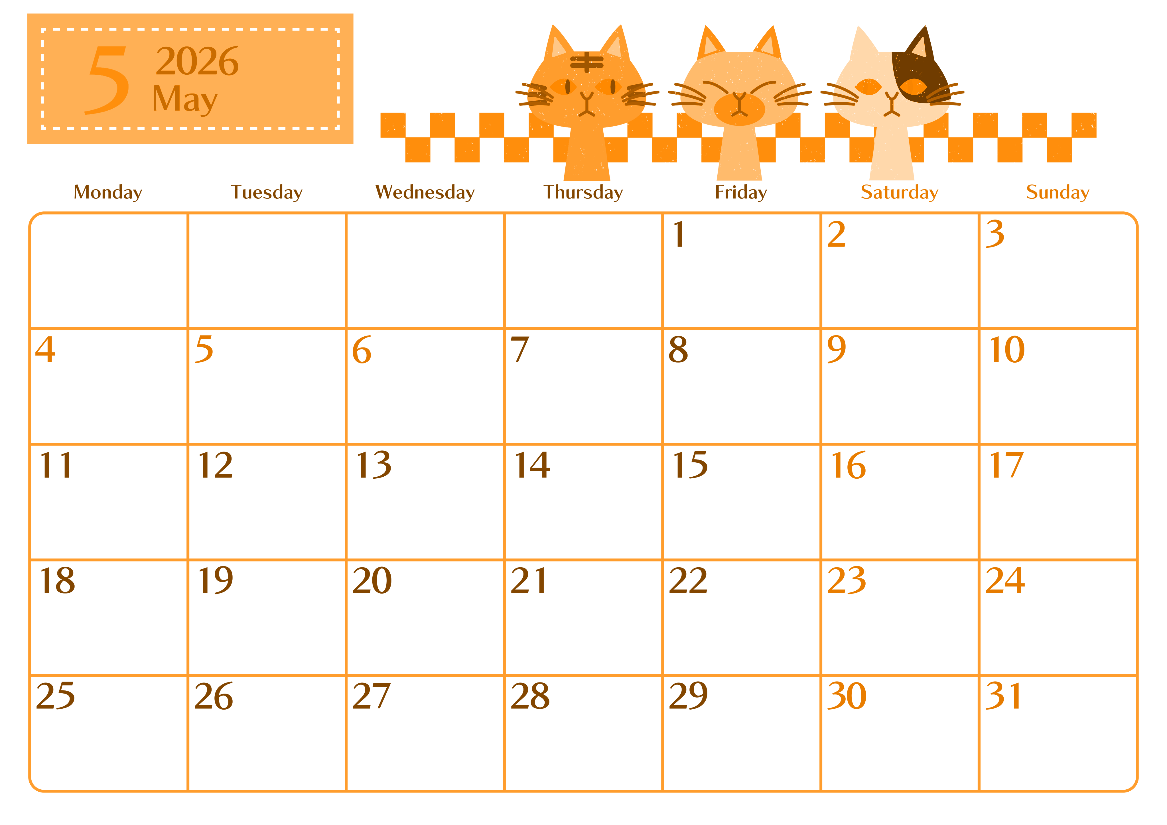 2026年5月横型月曜始まりの無料テンプレートオレンジのカレンダーです。3匹の個性的な猫がお互いの様子をうかがっているコミカルでありおしゃれなイラストが目を引くフリー素材です。ダウンロードは無料なのでおすすめです。(2026-01080501)
