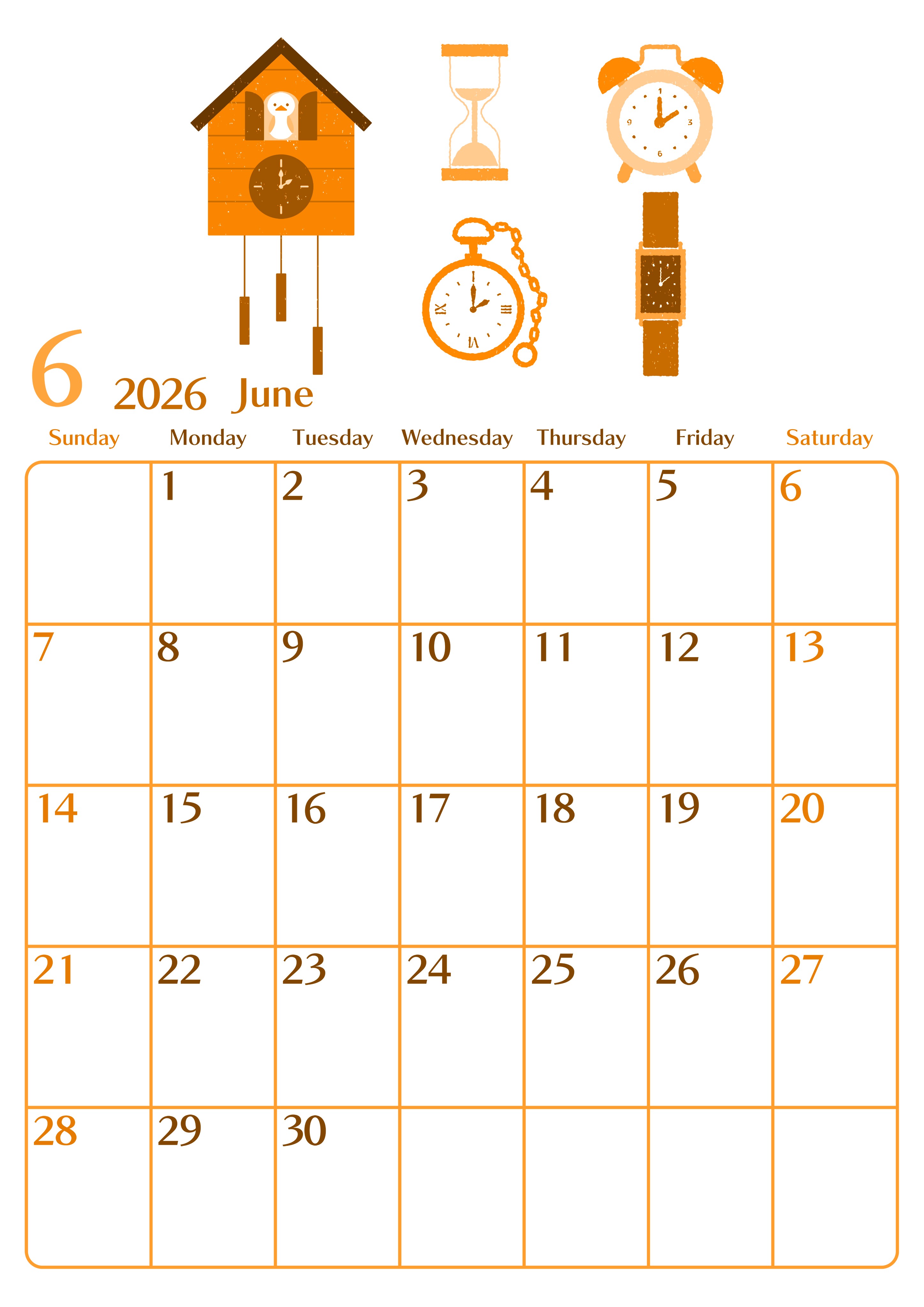 2026年6月縦型日曜始まりの無料テンプレートオレンジのカレンダーです。砂時計や腕時計や掛け時計、あなたはどのタイプの時計が好きですか?おしゃれで縦型イラスト付きのオレンジのカレンダーなので壁に貼って使うのをおすすめします。(2026-01080610)