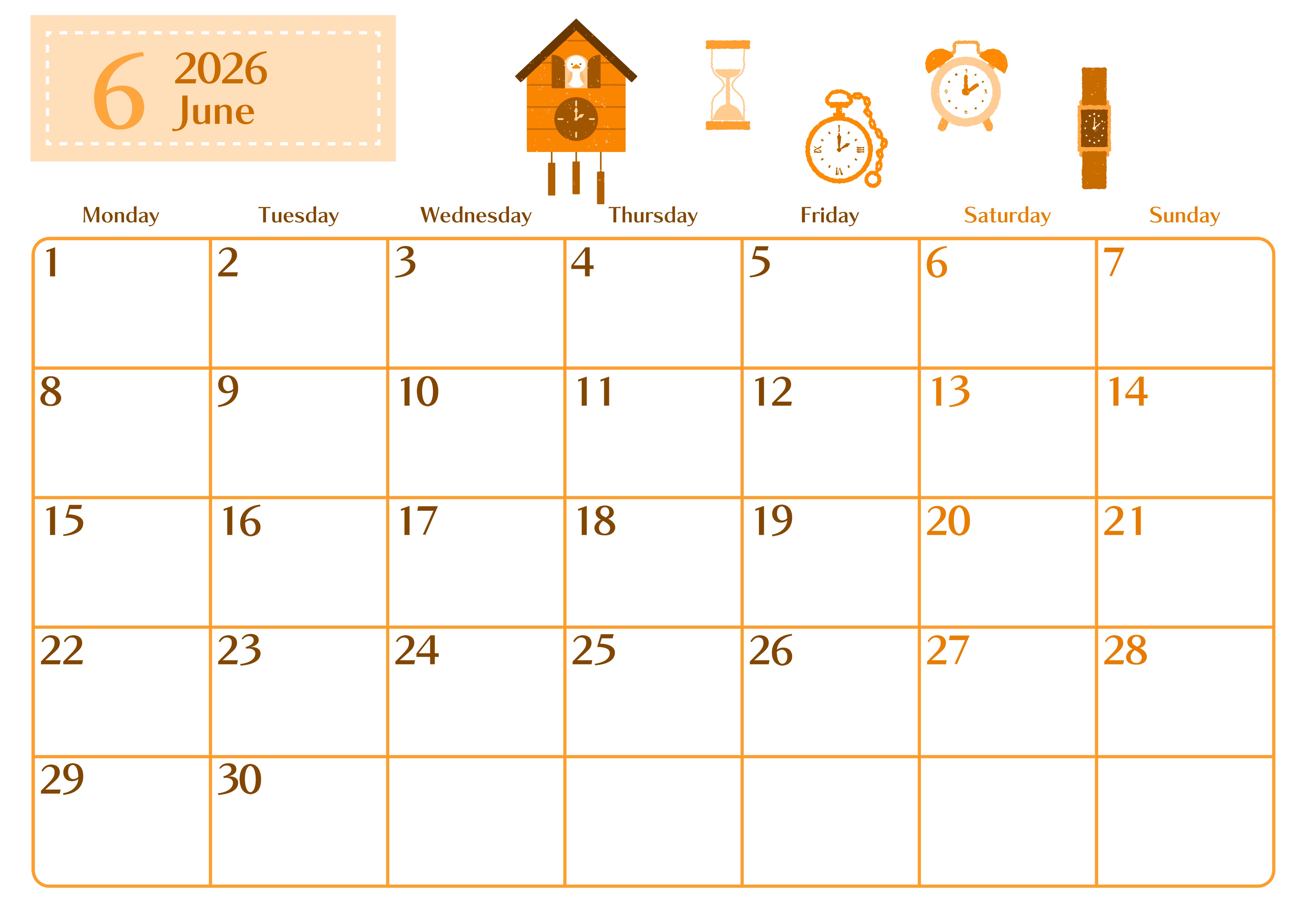 2026年6月横型月曜始まりの無料テンプレートオレンジのカレンダーです。多種多様な時計のイラストがほどこされたおしゃれなオレンジのカレンダーを使うと時間の大切さを意識するようになり一分一秒を大切に過ごせるかもしれません。(2026-01080601)