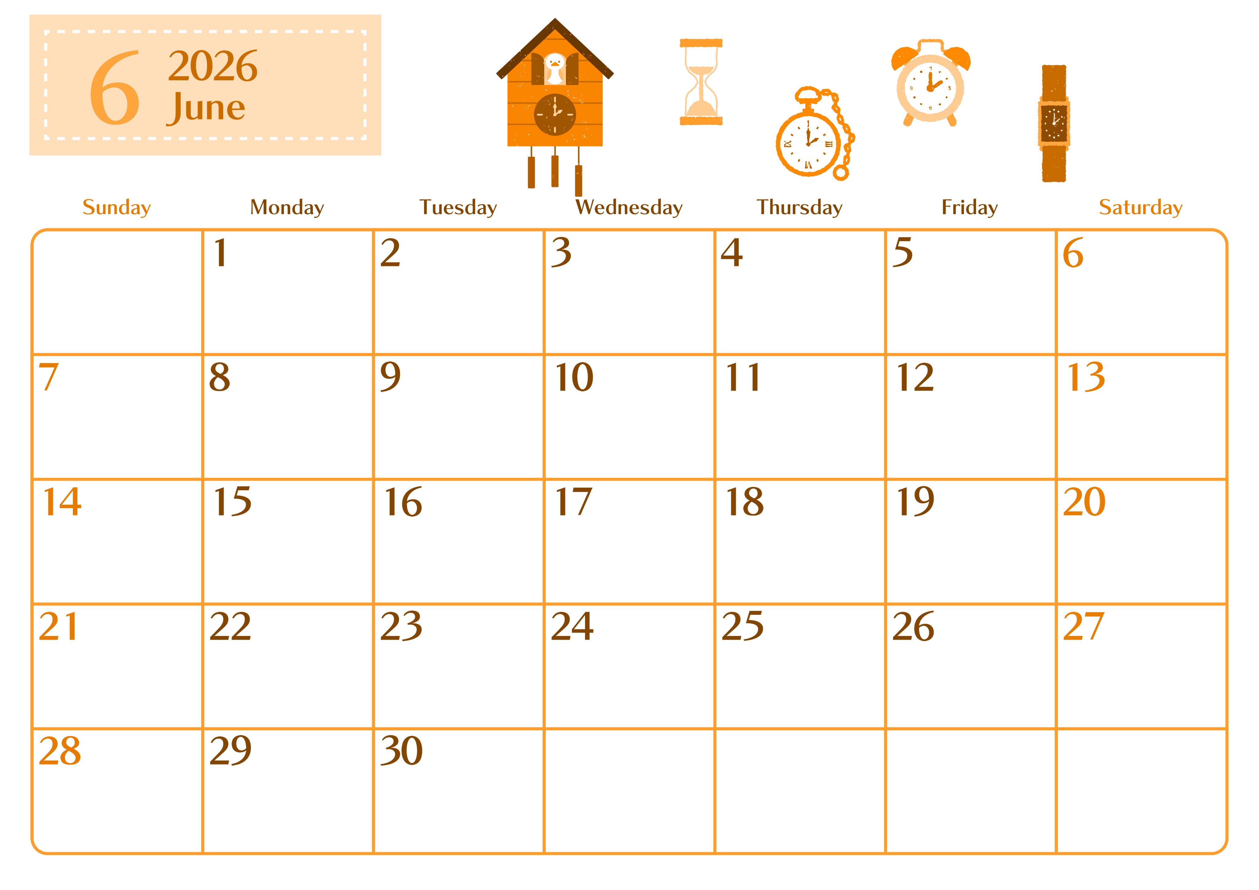 2026年6月横型日曜始まりの無料テンプレートオレンジのカレンダーです。いろいろな形状の時計のイラストがちりばめられていてスタイリッシュでおしゃれなイラストのオレンジのカレンダーが毎日を丁寧な生活に招き入れてくれます。(2026-01080600)