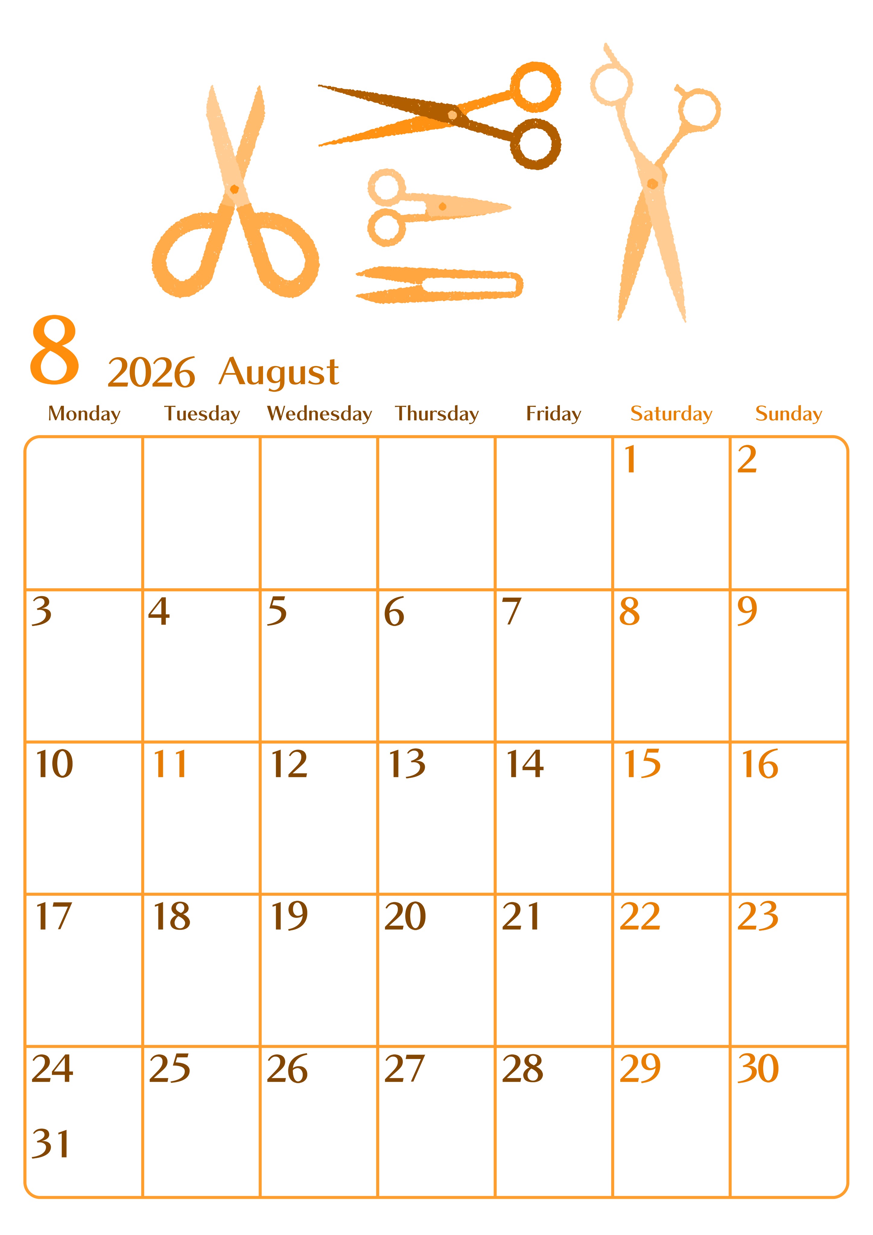 2026年8月縦型月曜始まりの無料テンプレートオレンジのカレンダーです。月曜始まりなのでサラリーマンや学生さんにとって使いやすいオレンジのカレンダーです。ハサミのイラストもおしゃれでありながらも目立ちすぎないので使いやすいです。(2026-01080811)
