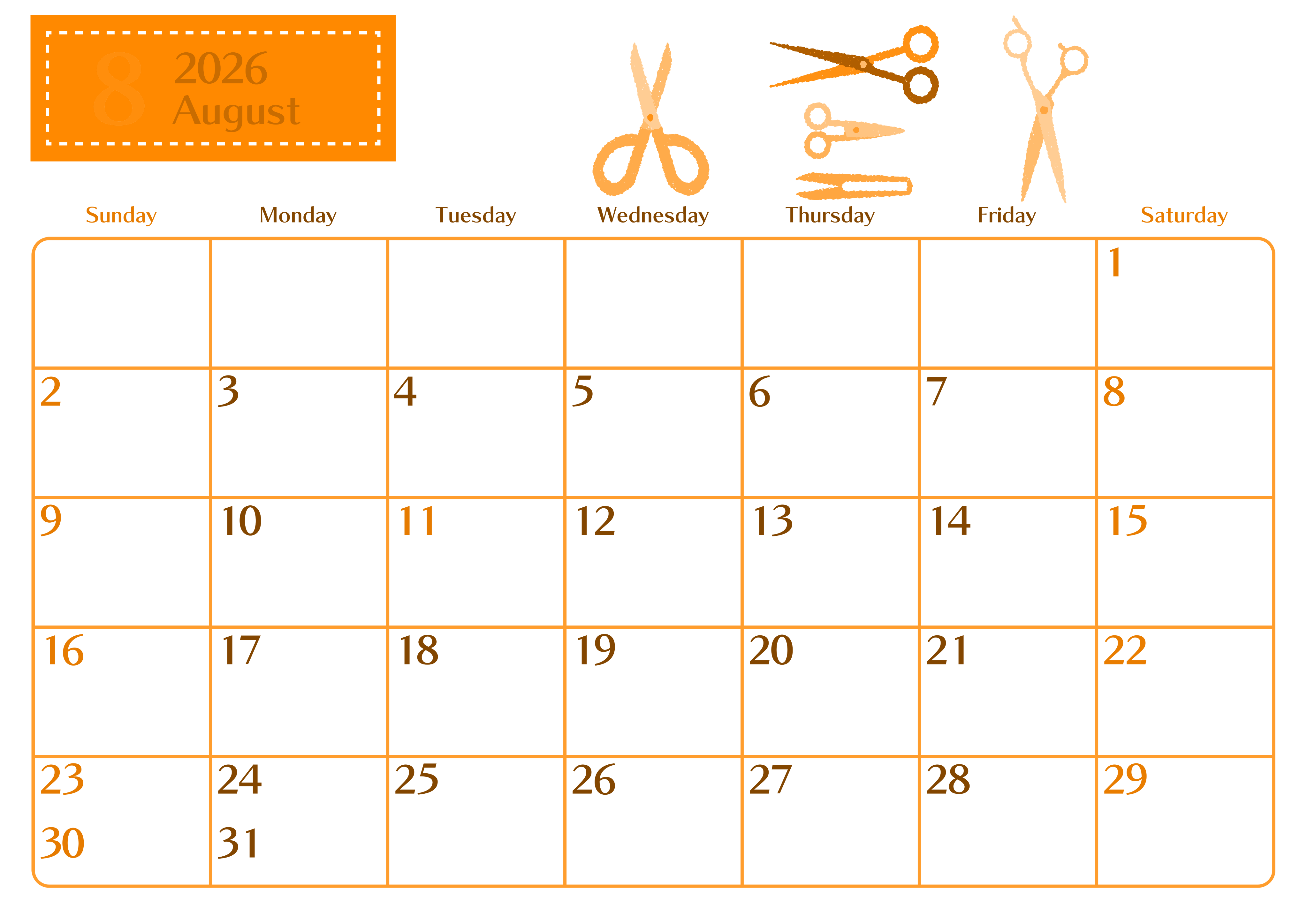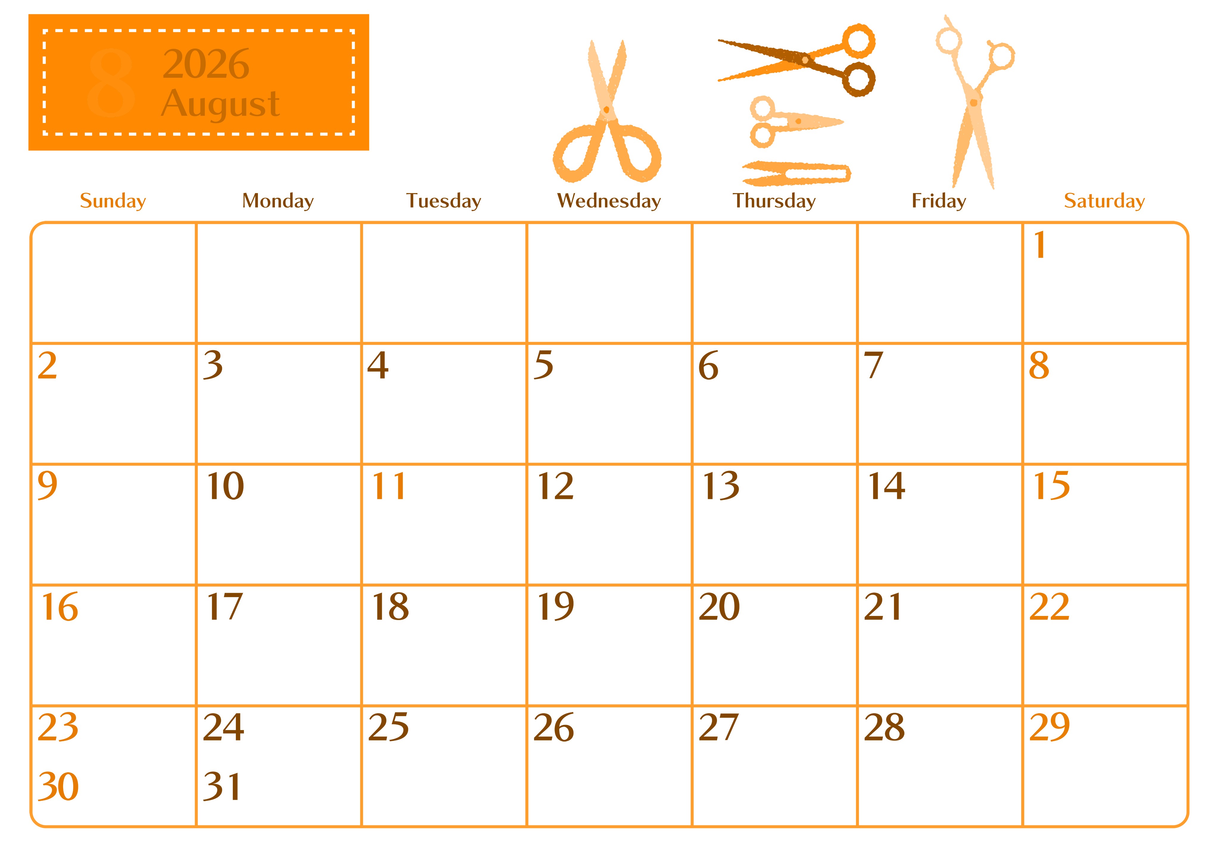 2026年・無料のカレンダーテンプレート 2026年8月横型日曜始まり ハサミイラストのおしゃれA4無料オレンジのカレンダー(2026-01080800) 素材状デザイン王 2025年4月7日 2026年8月横型日曜始まりの無料テンプレートオレンジのカレンダーです。いろいろなタイプのハサミのイラストがちりばめられていて文房具好きにはたまらないおしゃれなデザインのフリー素材となっています。(2026-01080800) 8月 横型のカレンダー 日曜始まり オレンジ カレンダーデザイン-0108