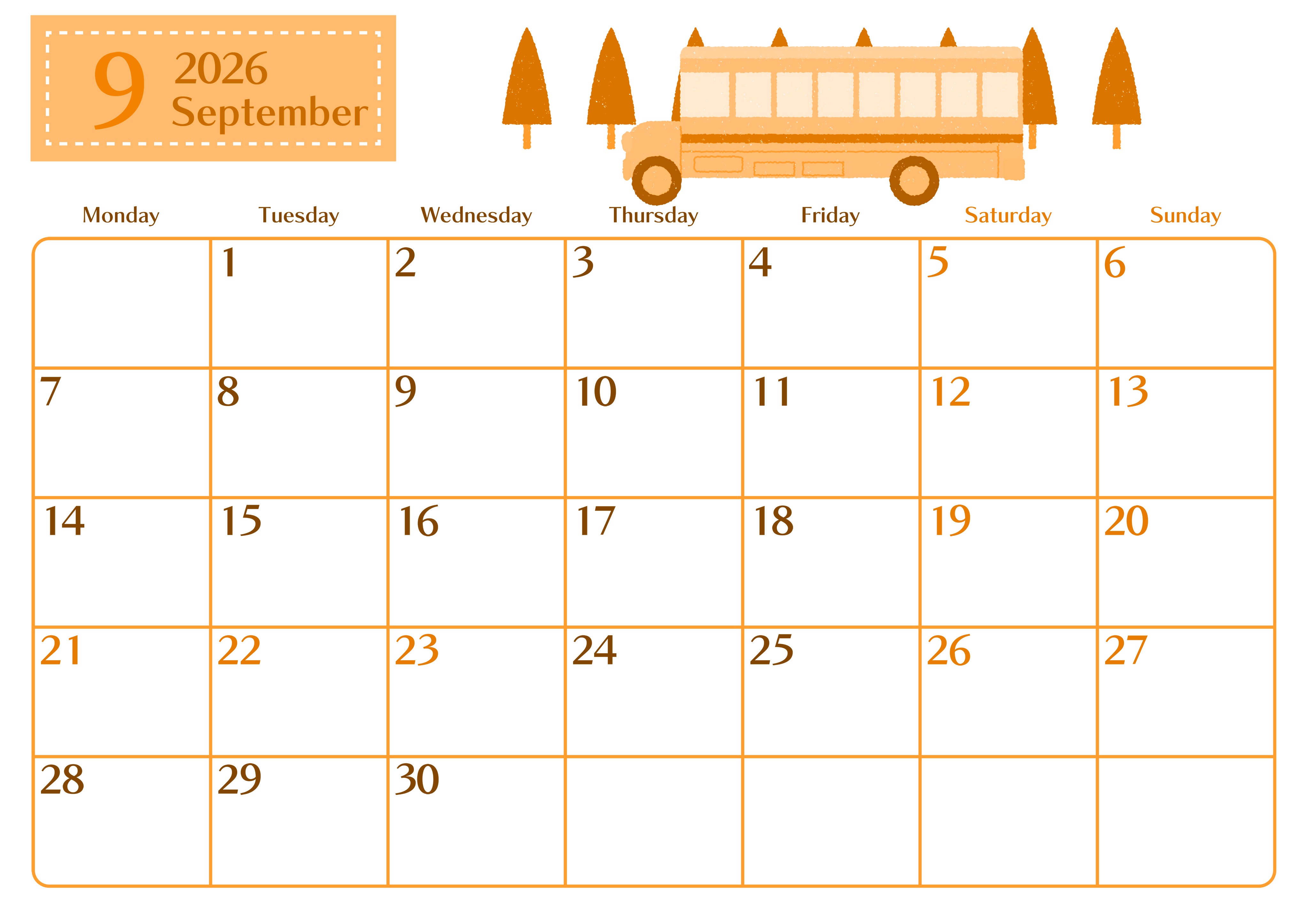 2026年9月横型月曜始まりの無料テンプレートオレンジのカレンダーです。バスが街路樹を通りすぎるように走る様子のイラストがシンプルおしゃれで使うのが気持ち良くなるようなフリー素材となっていて月曜始まりなので便利です。(2026-01080901)