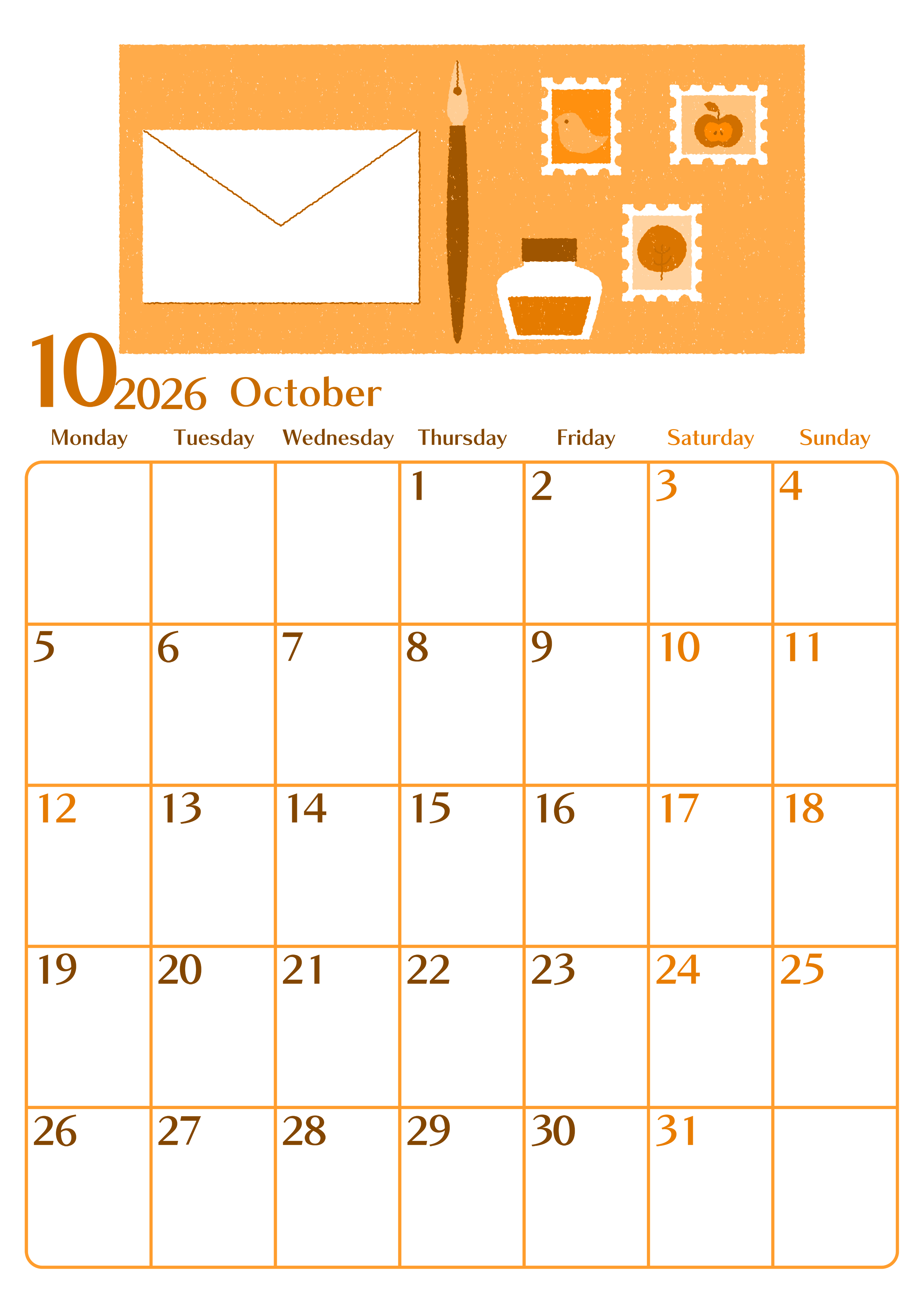 2026年10月縦型月曜始まりの無料テンプレートオレンジのカレンダーです。手紙をはじめとするお手紙グッズをテーマにしたイラストがスタイリッシュでおしゃれな縦型オレンジのカレンダーとなっています。曜日ごとに文字の色が違うので見やすいです。(2026-01081011)