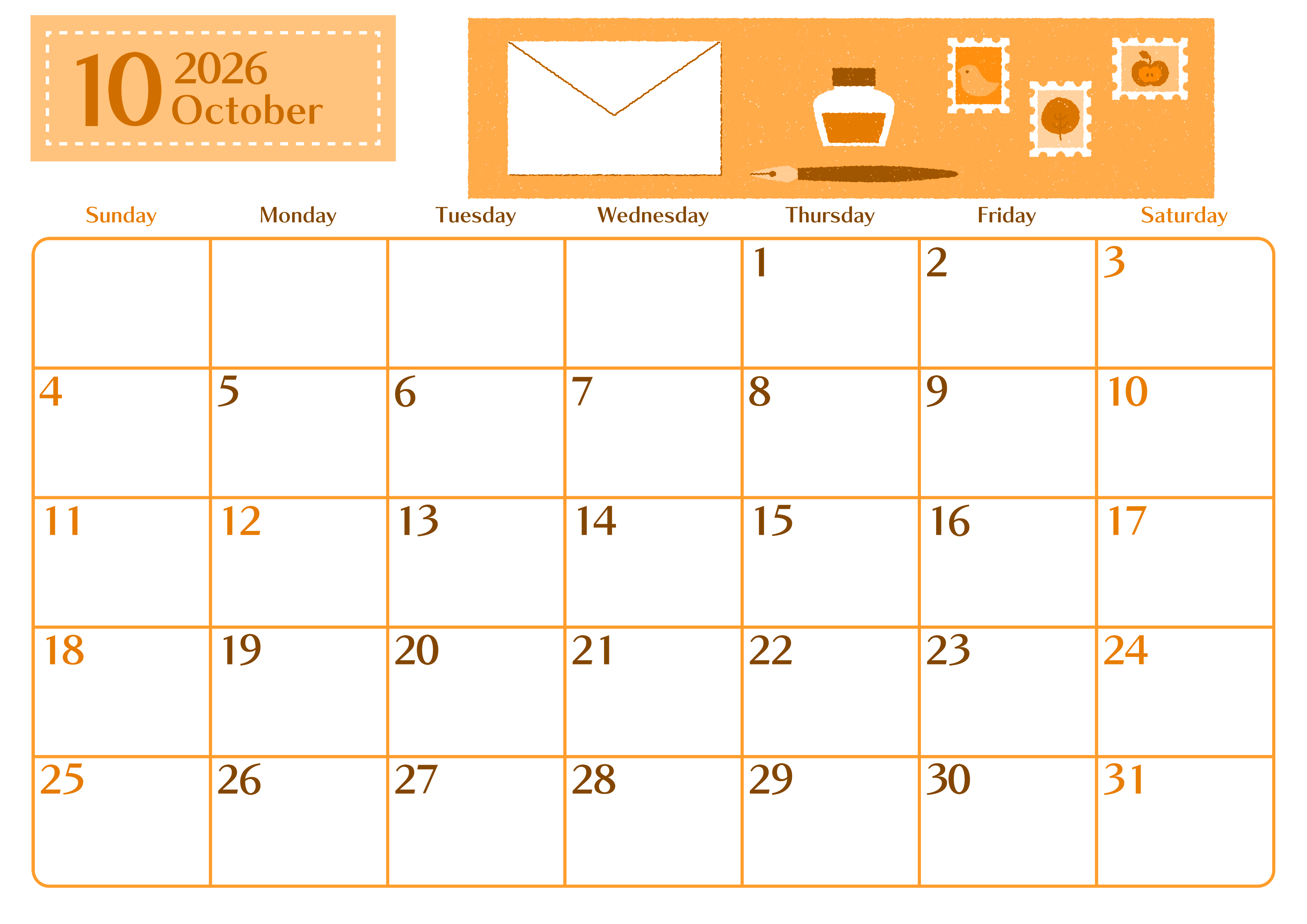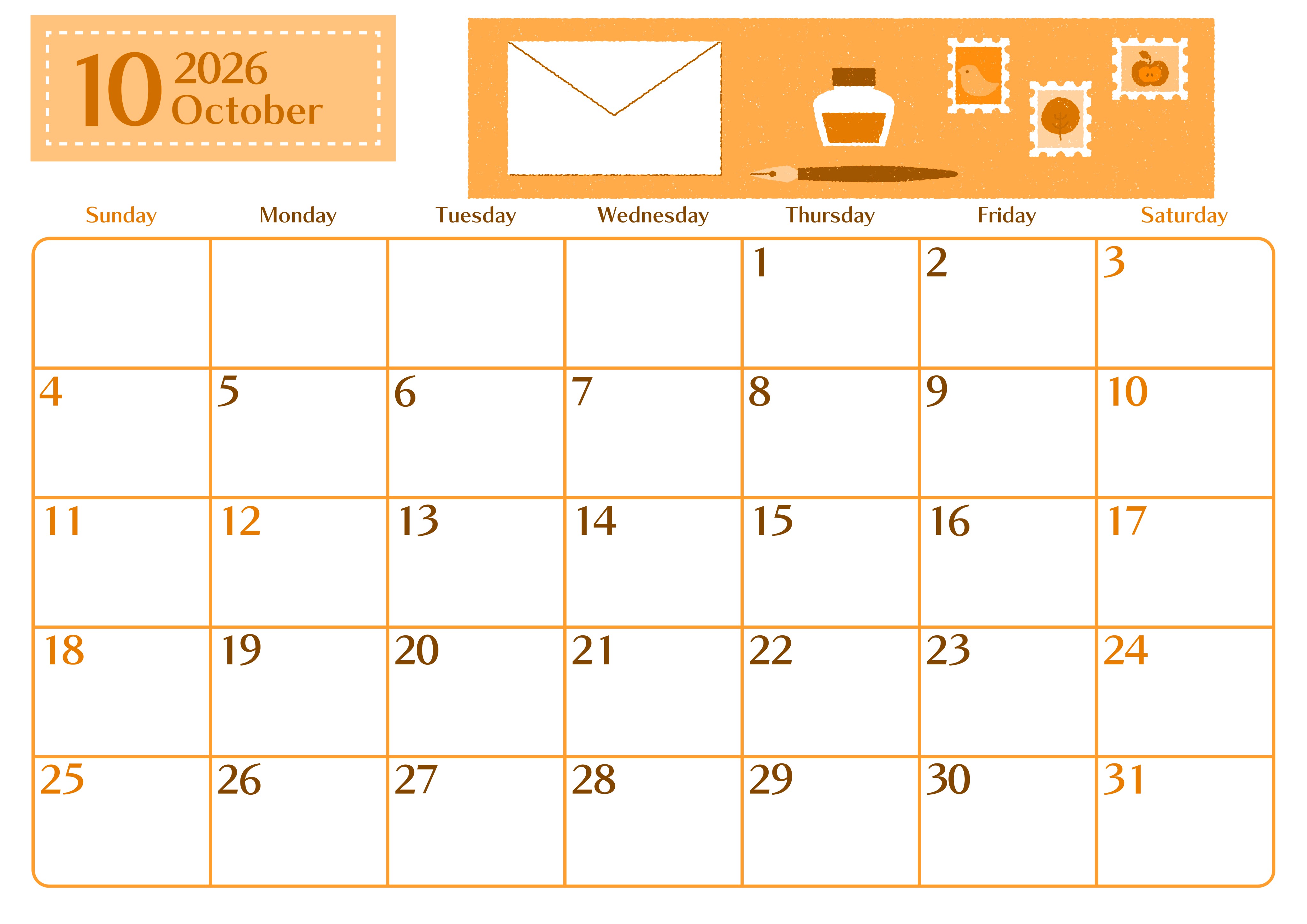 2026年10月横型日曜始まりの無料テンプレートオレンジのカレンダーです。手紙や万年筆や切手のイラストがステーショナリー好きの心に刺さるおしゃれな世界観のオレンジのカレンダーを用意しました。(2026-01081000)
