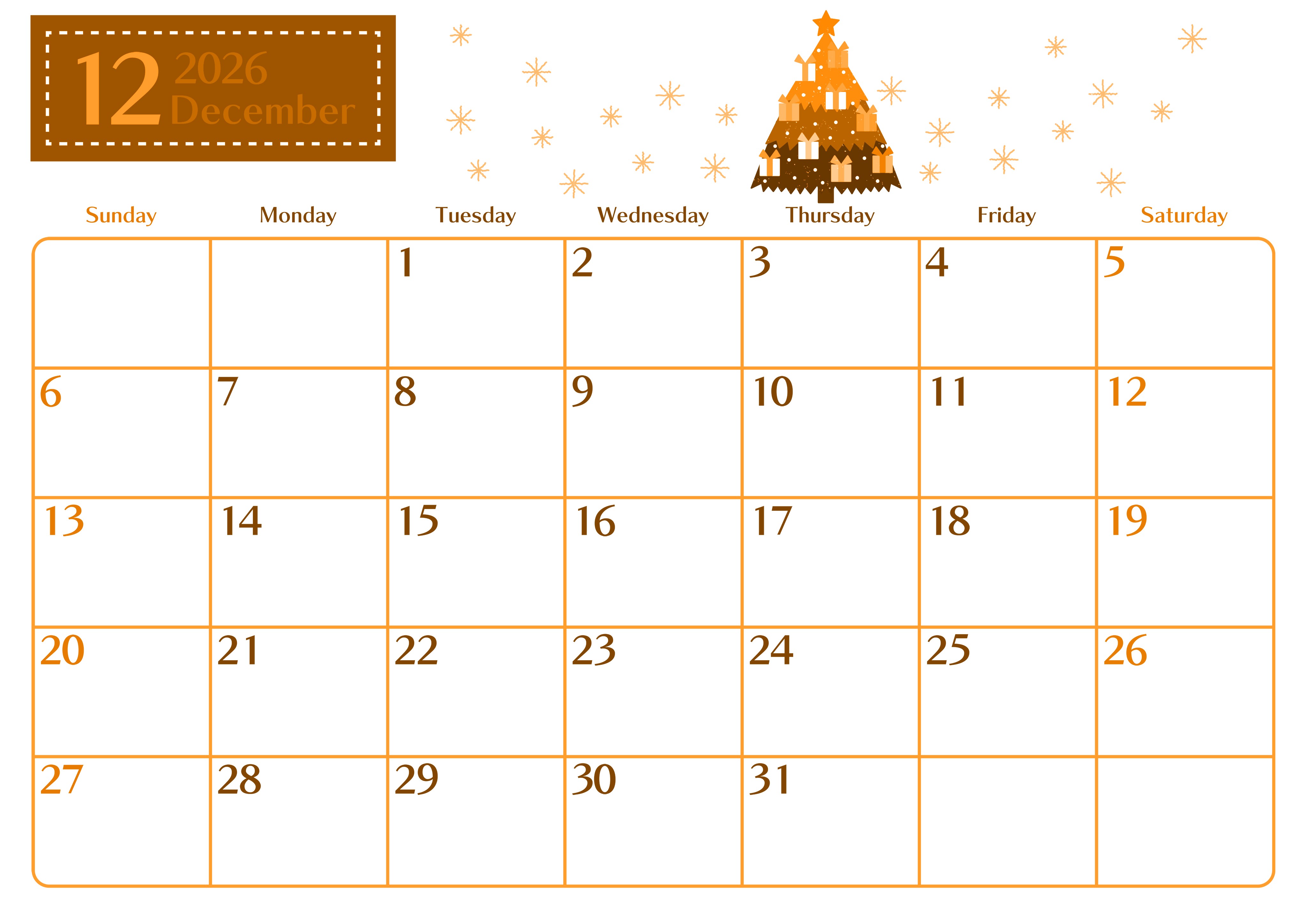 2026年・無料のカレンダーテンプレート 2026年12月横型日曜始まり クリスマスツリーイラストのおしゃれA4無料オレンジのカレンダー(2026-01081200) 素材状デザイン王 2025年4月7日 2026年12月横型日曜始まりの無料テンプレートオレンジのカレンダーです。クリスマスツリーに数多くのプレゼントが吊り下げられている様子を描いているイラストがおしゃれで心躍る作品となっています。(2026-01081200) 12月 横型のカレンダー 日曜始まり オレンジ カレンダーデザイン-0108