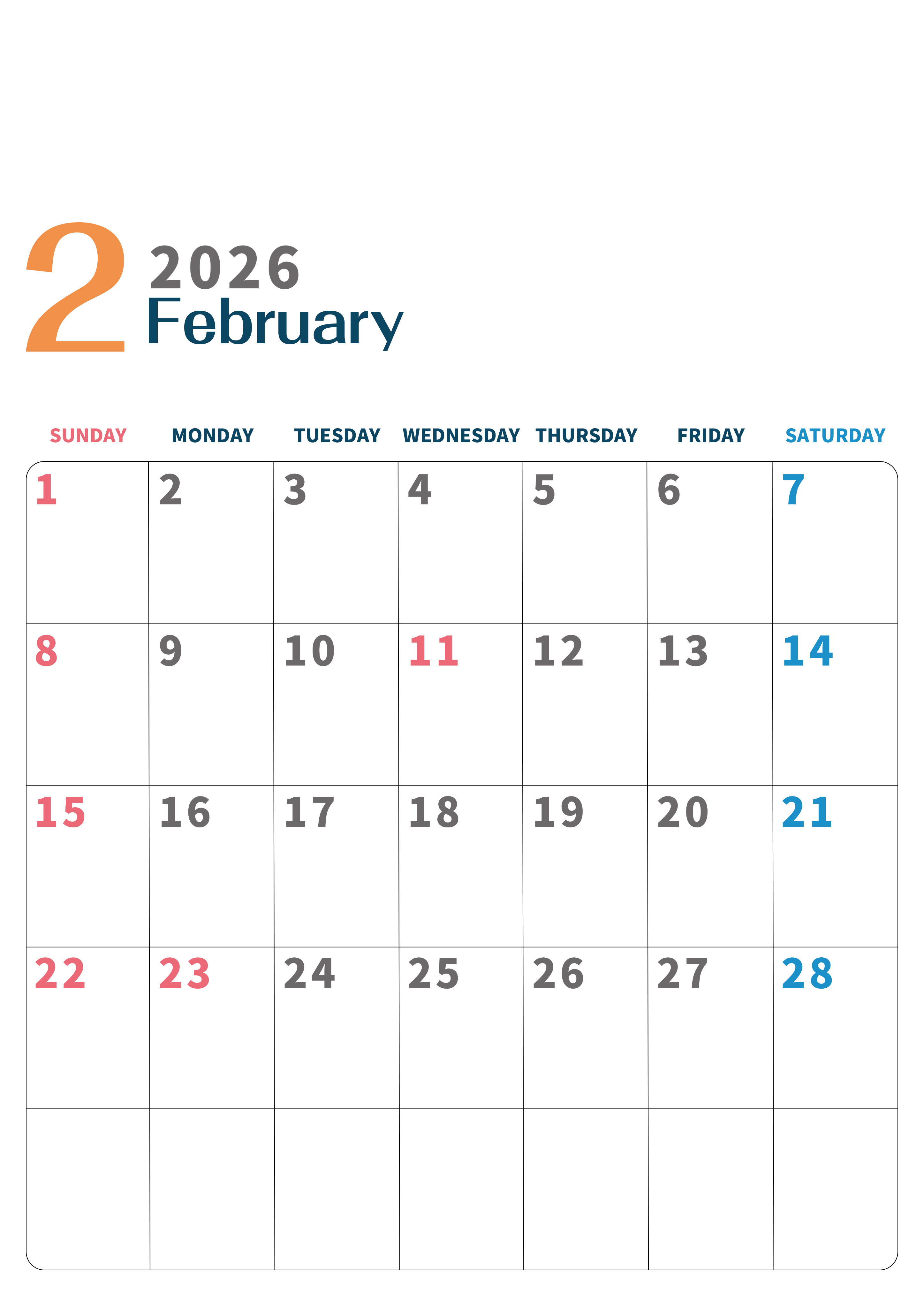 2026年・無料のカレンダーテンプレート 2026年2月縦型日曜始まり 書き込みしやすい文字が大きなA4無料シンプルなカレンダー(2026-01090210) 素材状デザイン王 2025年4月8日 2026年2月縦型日曜始まりの書き込みしやすい文字が大きなA4無料シンプルなカレンダーです。見やすいのでダウンロード利用をおすすめします。スケジュールを管理しやすいです。(2026-01090210) シンプル 2月 縦型のカレンダー 日曜始まり カレンダーデザイン-0109