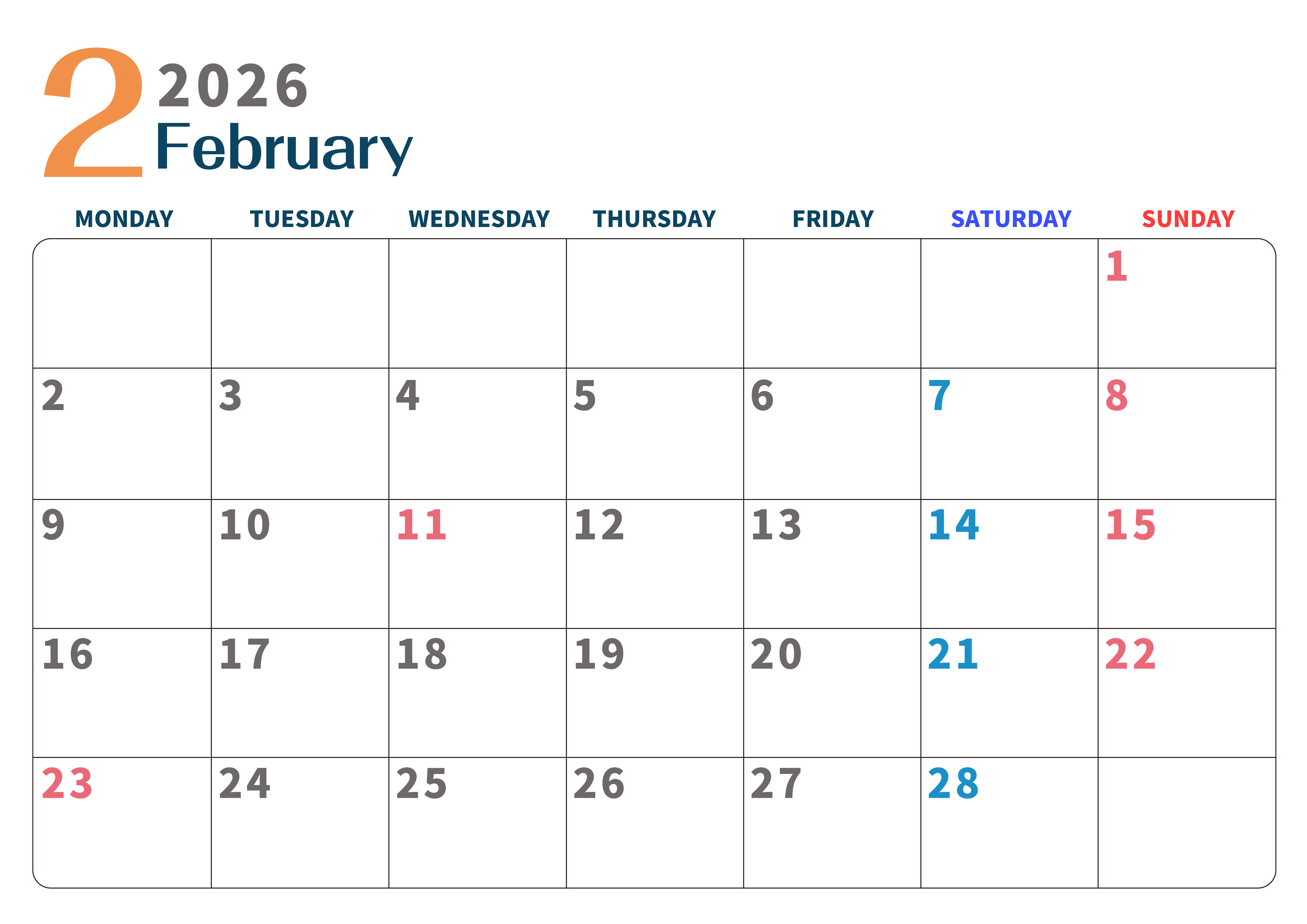 2026年・無料のカレンダーテンプレート 2026年2月横型月曜始まり 書き込みしやすい文字が大きなA4無料シンプルなカレンダー(2026-01090201) 素材状デザイン王 2025年4月8日 2026年2月横型月曜始まりの書き込みしやすい文字が大きなA4無料シンプルなカレンダーです。見やすいのでダウンロード利用をおすすめします。スケジュールを管理しやすいです。(2026-01090201) シンプル 2月 横型のカレンダー 月曜始まり