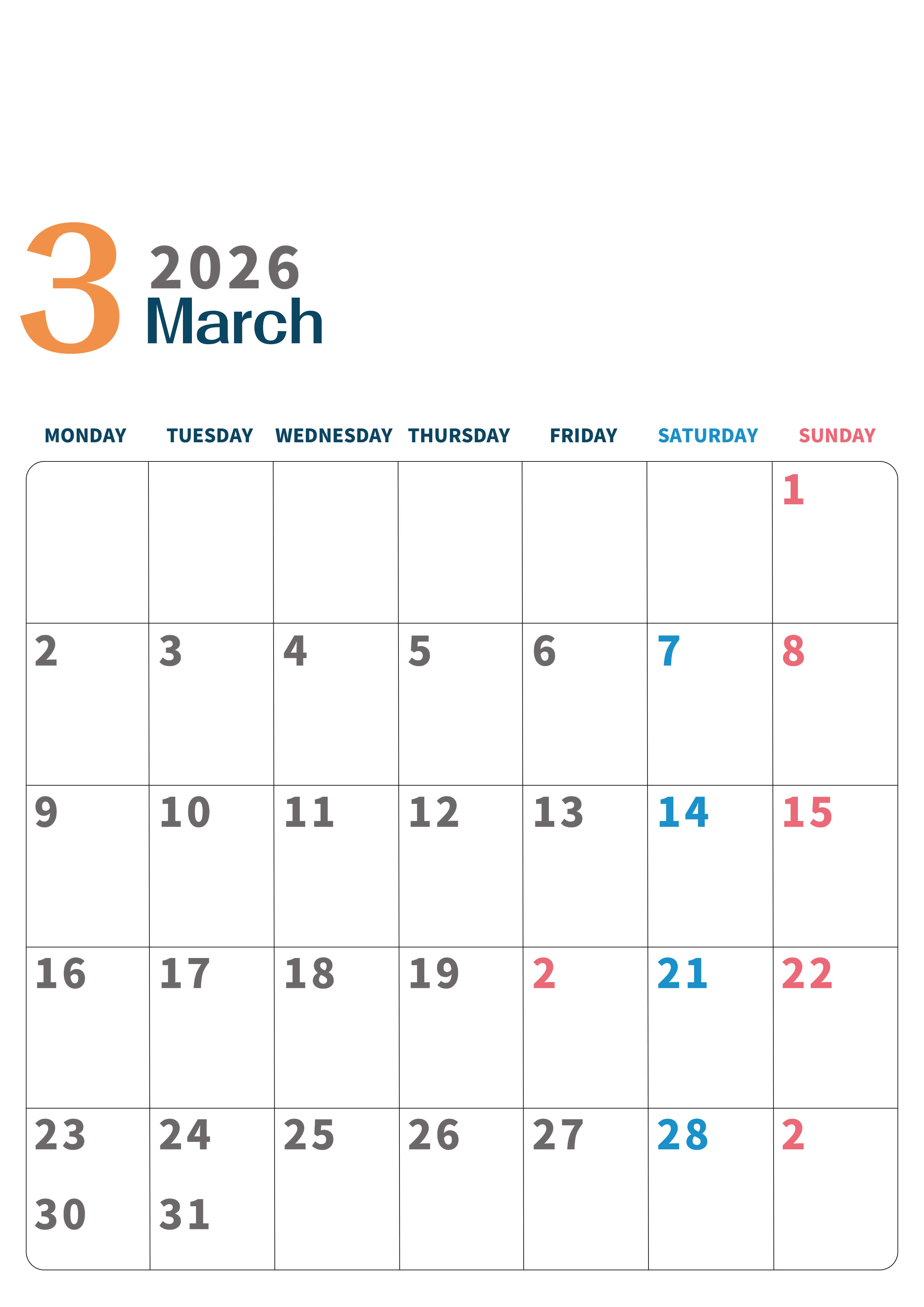 2026年・無料のカレンダーテンプレート 2026年3月縦型月曜始まり 書き込みしやすい文字が大きなA4無料シンプルなカレンダー(2026-01090311) 素材状デザイン王 2025年4月8日 2026年3月縦型月曜始まりの書き込みしやすい文字が大きなA4無料シンプルなカレンダーです。見やすいのでダウンロード利用をおすすめします。プランの整理にぴったりです。(2026-01090311) シンプル 3月 縦型のカレンダー 月曜始まり カレンダーデザイン-0109