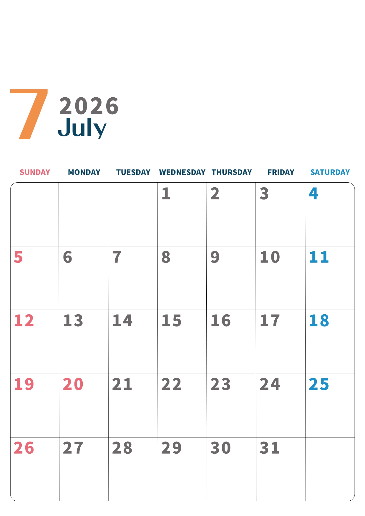 2026年7月縦型日曜始まりの書き込みしやすい文字が大きなA4無料シンプルなカレンダーです。見やすいのでダウンロード利用をおすすめします。計画を立てるのに最適です。(2026-01090710)