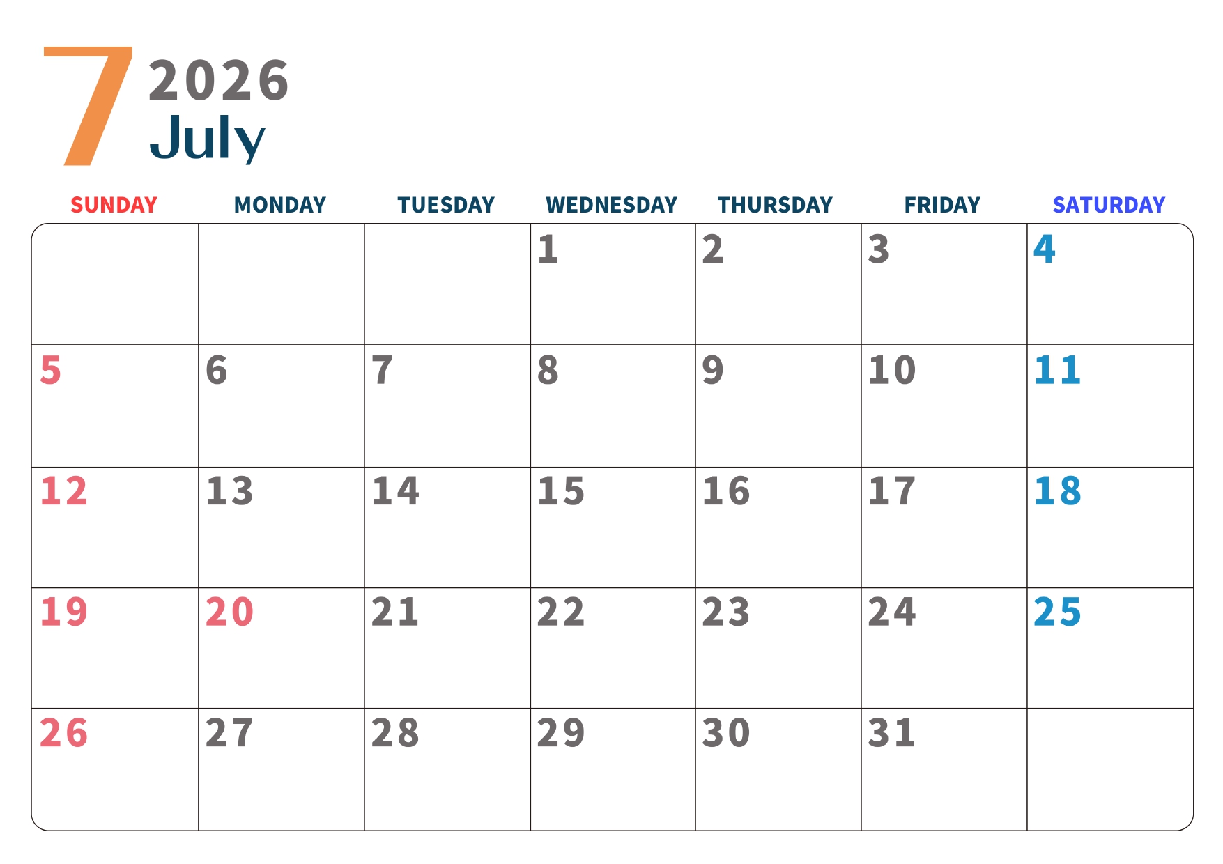 2026年・無料のカレンダーテンプレート 2026年7月横型日曜始まり 書き込みしやすい文字が大きなA4無料シンプルなカレンダー(2026-01090700) 素材状デザイン王 2025年4月8日 2026年7月横型日曜始まりの書き込みしやすい文字が大きなA4無料シンプルなカレンダーです。見やすいのでダウンロード利用をおすすめします。計画を立てるのに最適です。(2026-01090700) シンプル 7月 横型のカレンダー 日曜始まり