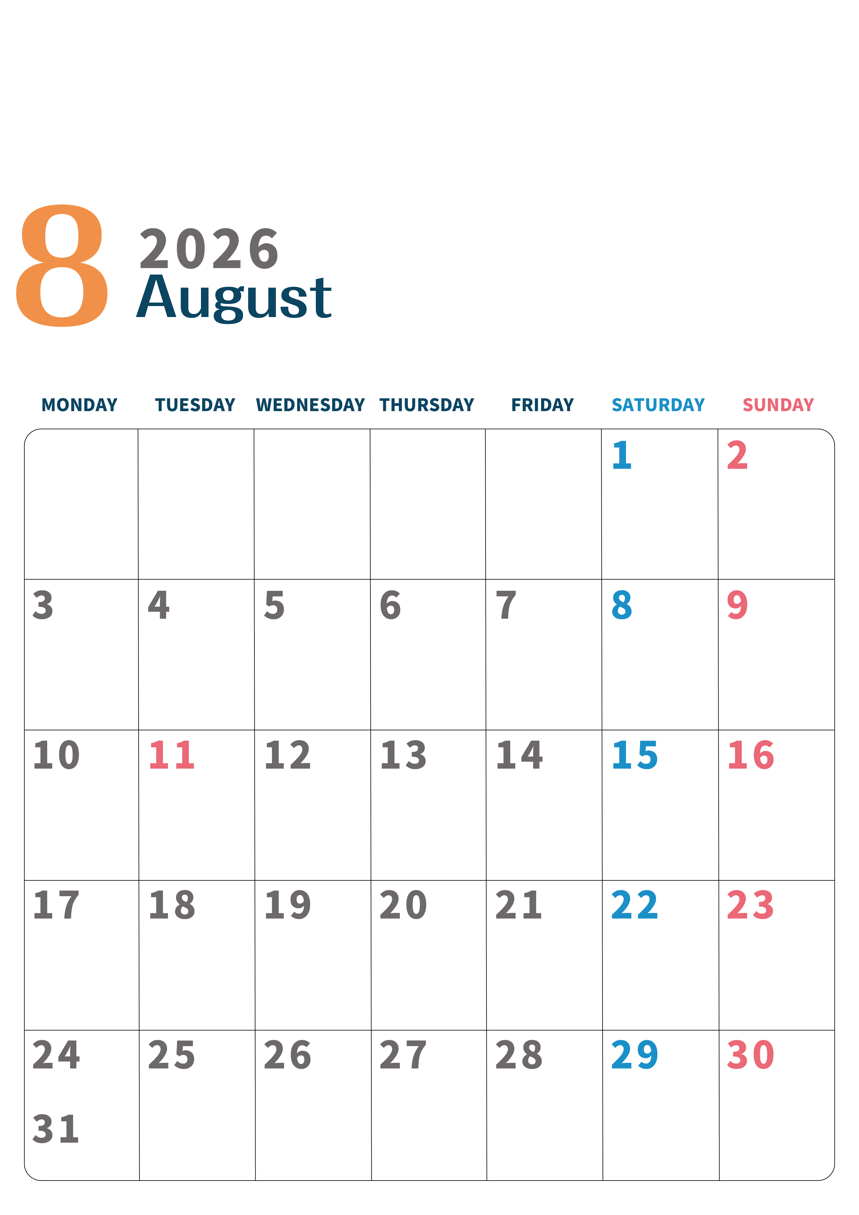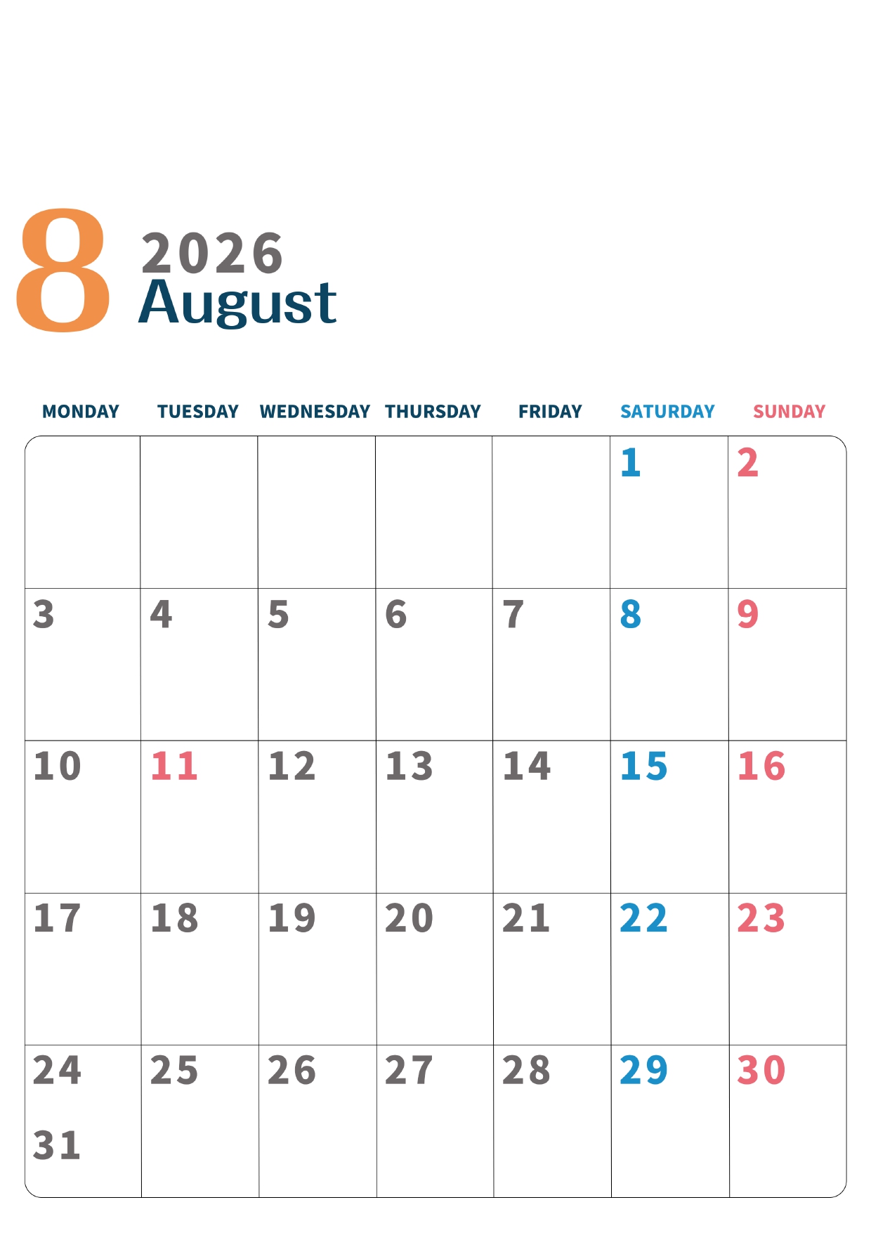 2026年8月縦型月曜始まりの書き込みしやすい文字が大きなA4無料シンプルなカレンダーです。見やすいのでダウンロード利用をおすすめします。スケジュールを管理しやすいです。(2026-01090811)