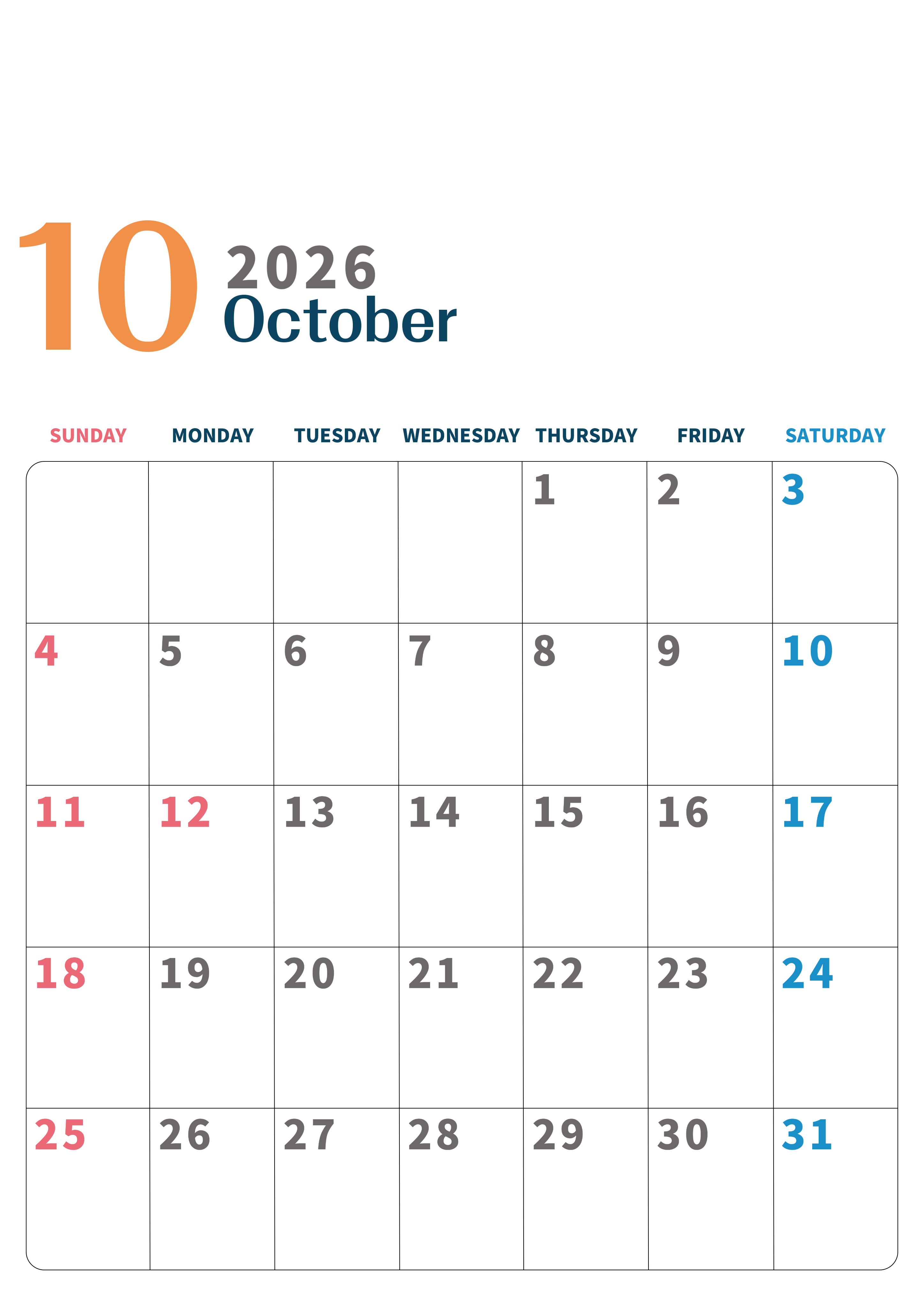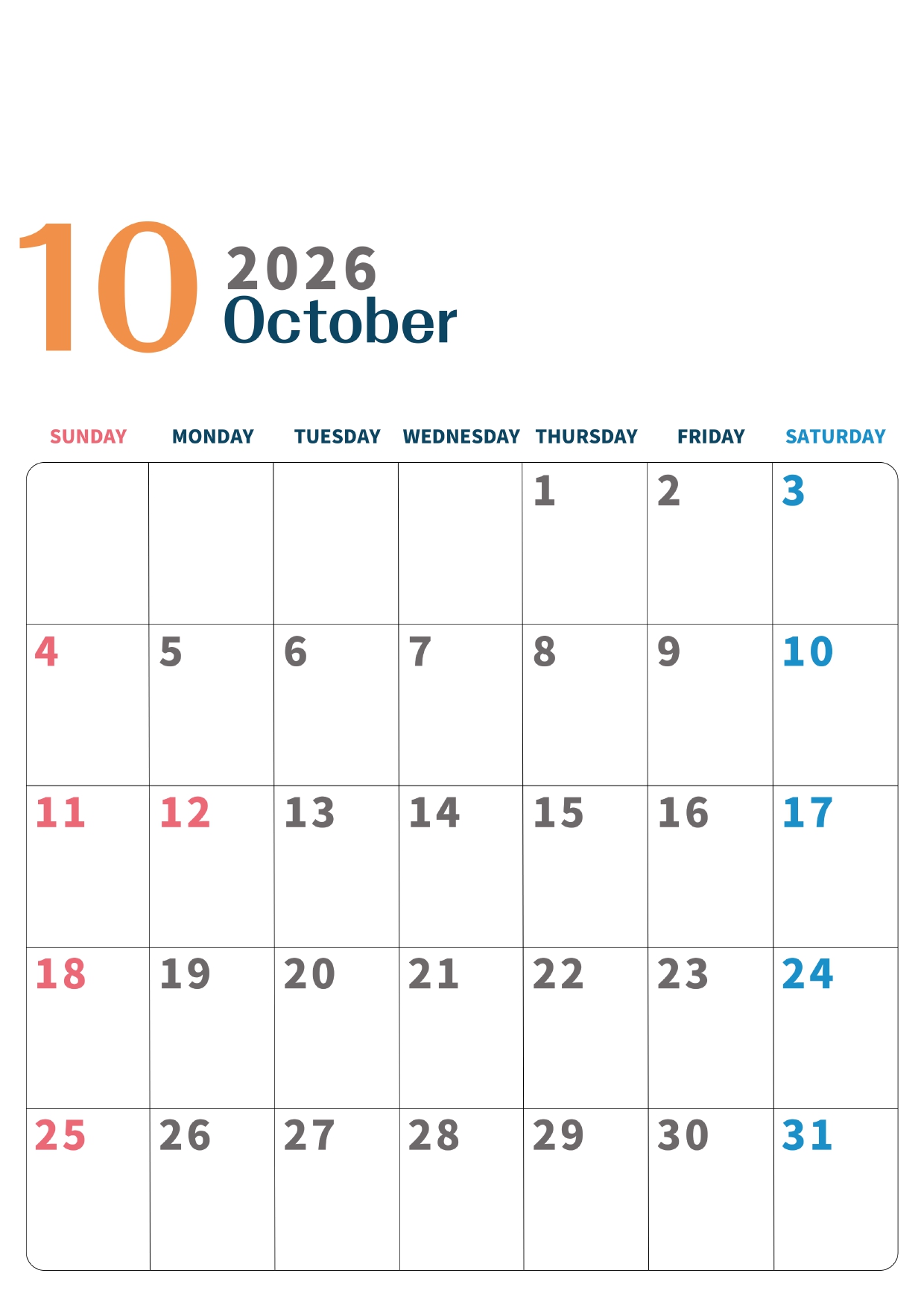2026年・無料のカレンダーテンプレート 2026年10月縦型日曜始まり 書き込みしやすい文字が大きなA4無料シンプルなカレンダー(2026-01091010) 素材状デザイン王 2025年4月8日 2026年10月縦型日曜始まりの書き込みしやすい文字が大きなA4無料シンプルなカレンダーです。見やすいのでダウンロード利用をおすすめします。計画を立てるのに最適です。(2026-01091010) シンプル 10月 縦型のカレンダー 日曜始まり カレンダーデザイン-0109