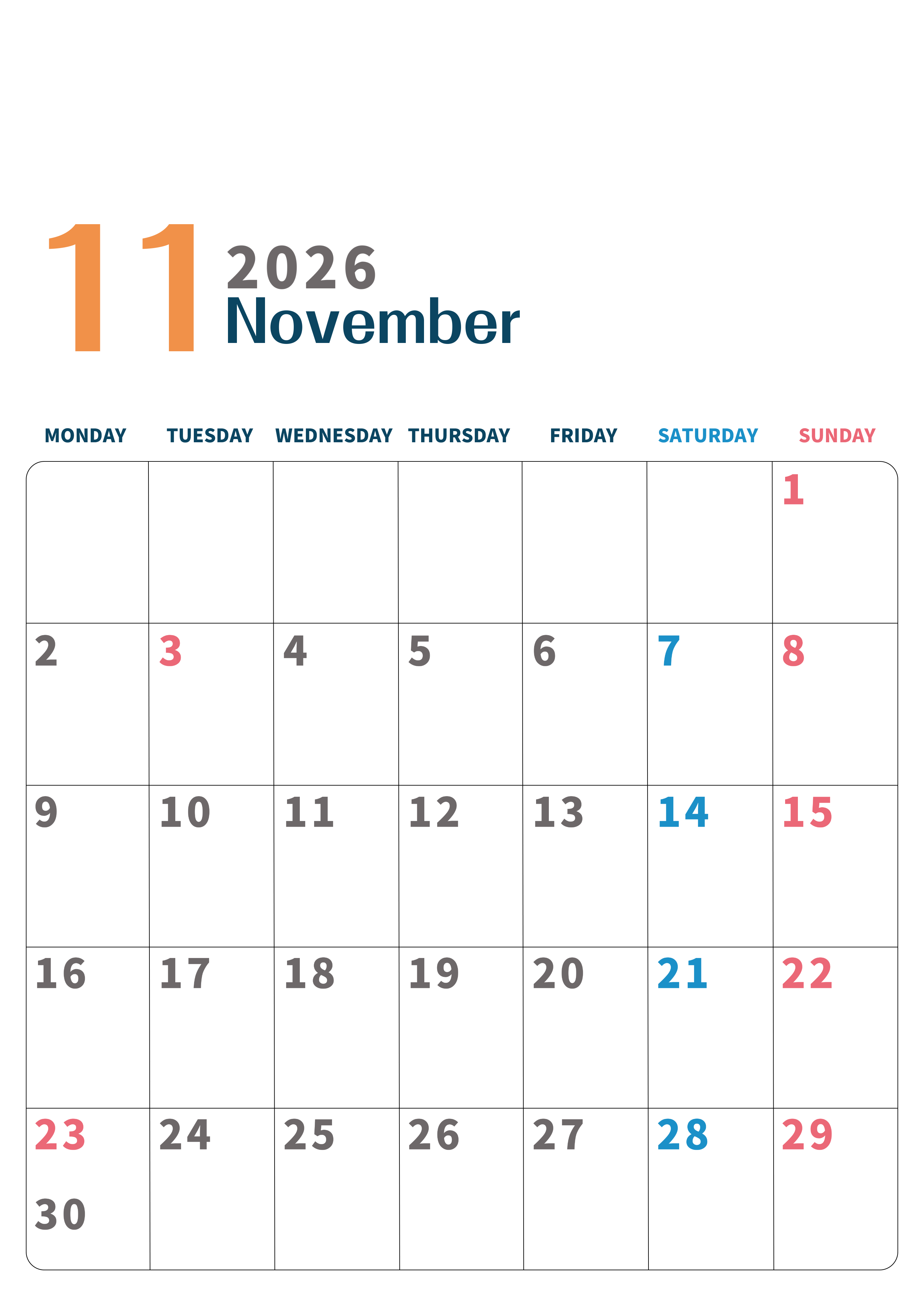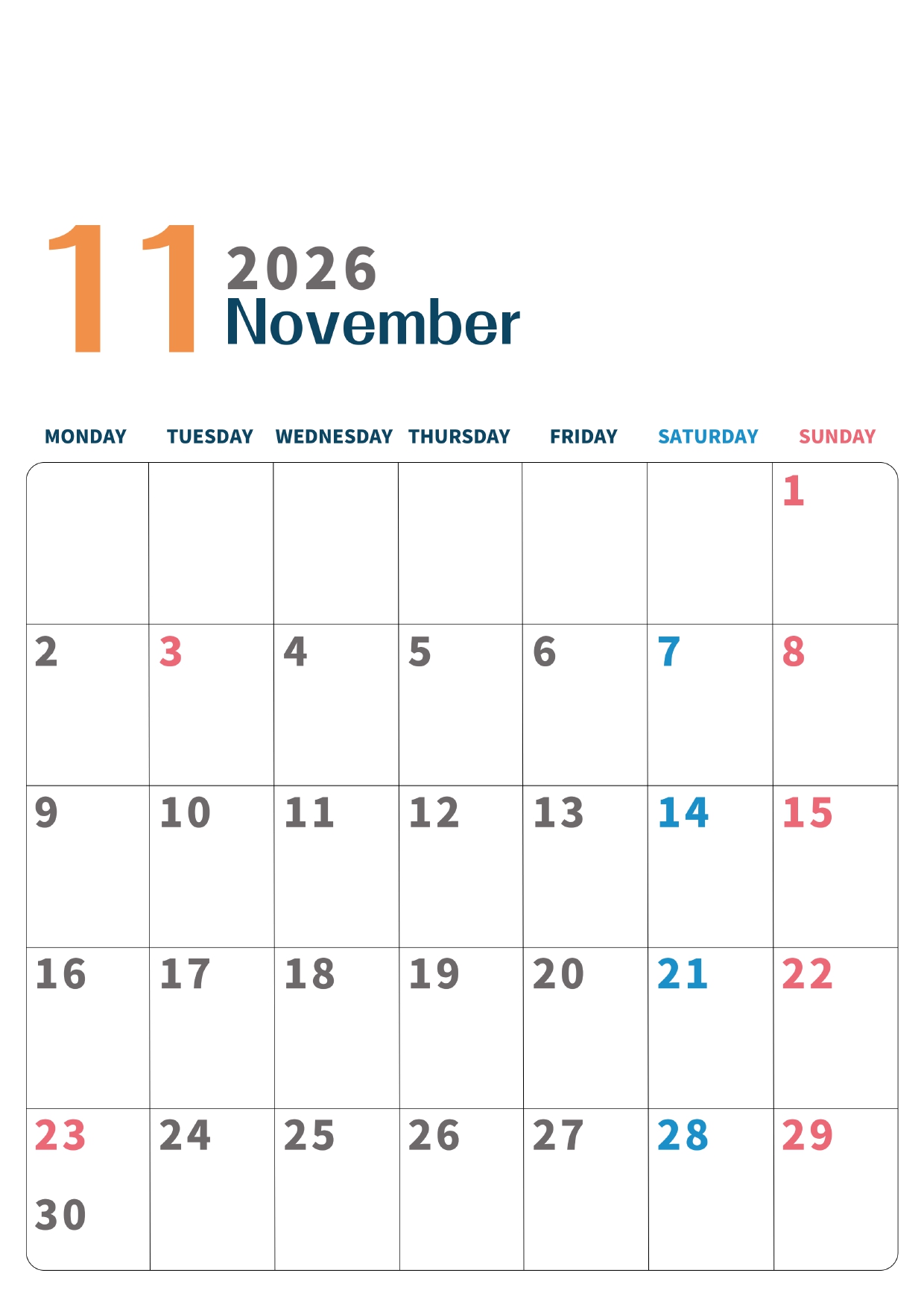 2026年11月縦型月曜始まりの書き込みしやすい文字が大きなA4無料シンプルなカレンダーです。見やすいのでダウンロード利用をおすすめします。スケジュールを管理しやすいです。(2026-01091111)