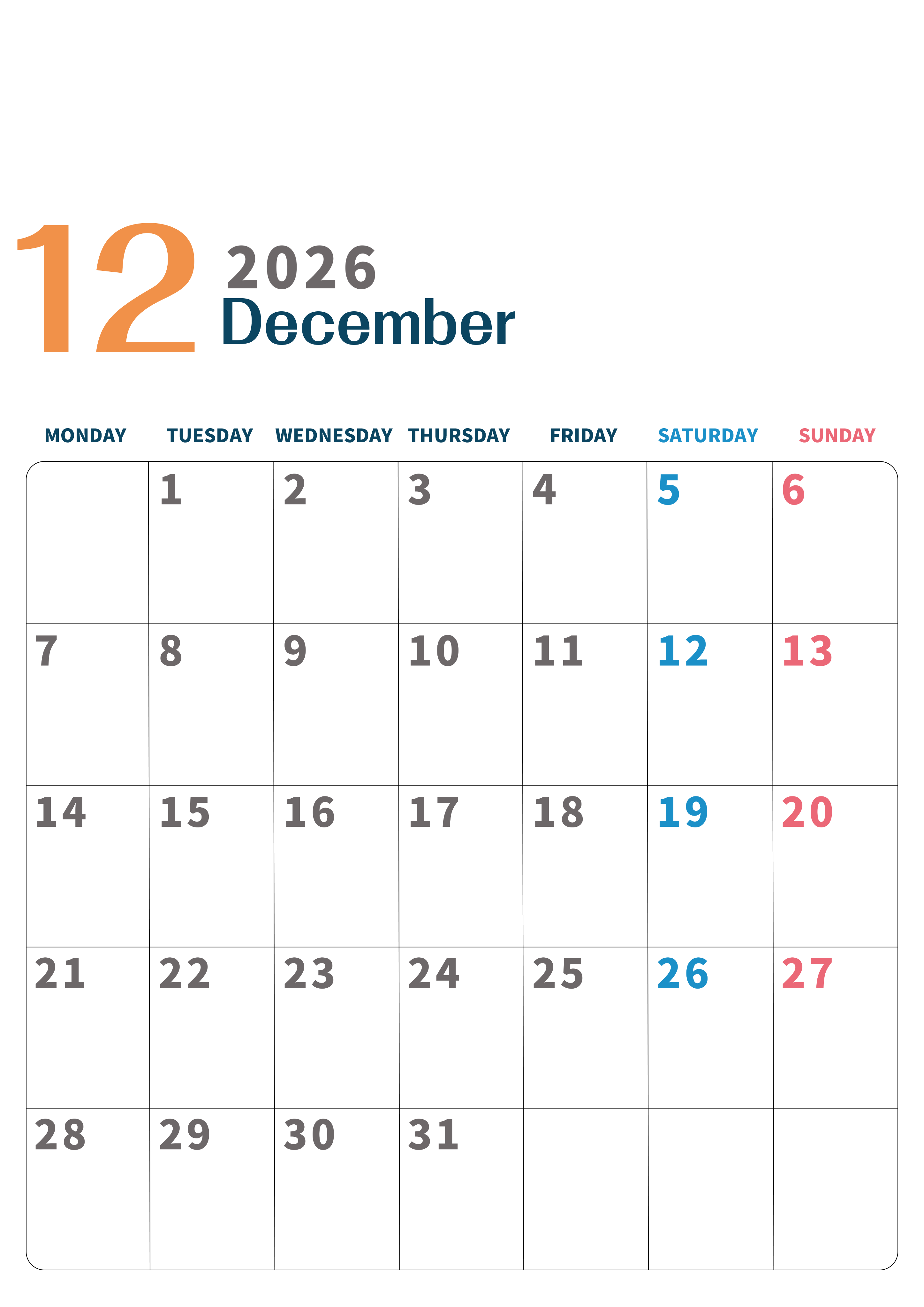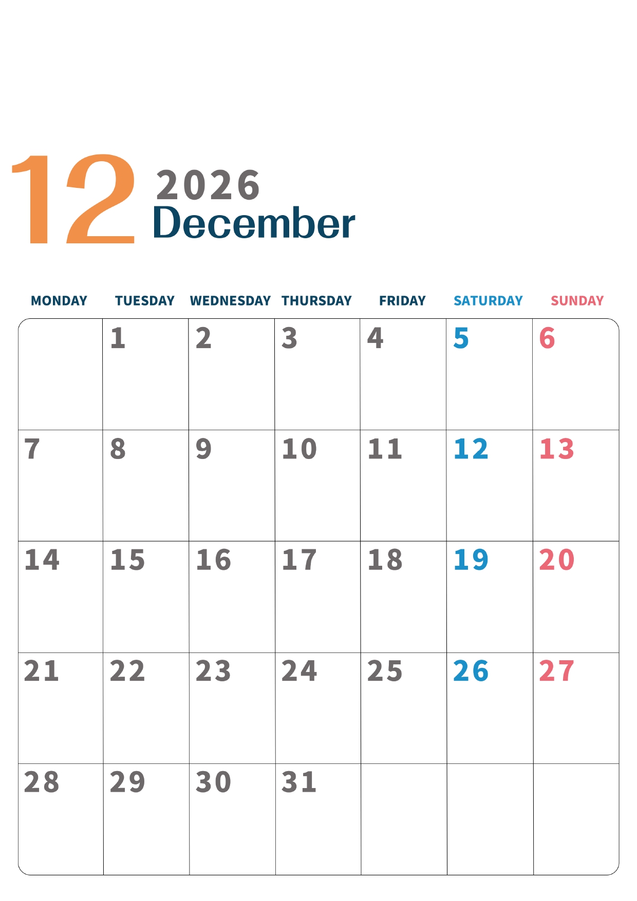 2026年・無料のカレンダーテンプレート 2026年12月縦型月曜始まり 書き込みしやすい文字が大きなA4無料シンプルなカレンダー(2026-01091211) 素材状デザイン王 2025年4月8日 2026年12月縦型月曜始まりの書き込みしやすい文字が大きなA4無料シンプルなカレンダーです。見やすいのでダウンロード利用をおすすめします。プランの整理にぴったりです。(2026-01091211) シンプル 12月 縦型のカレンダー 月曜始まり カレンダーデザイン-0109