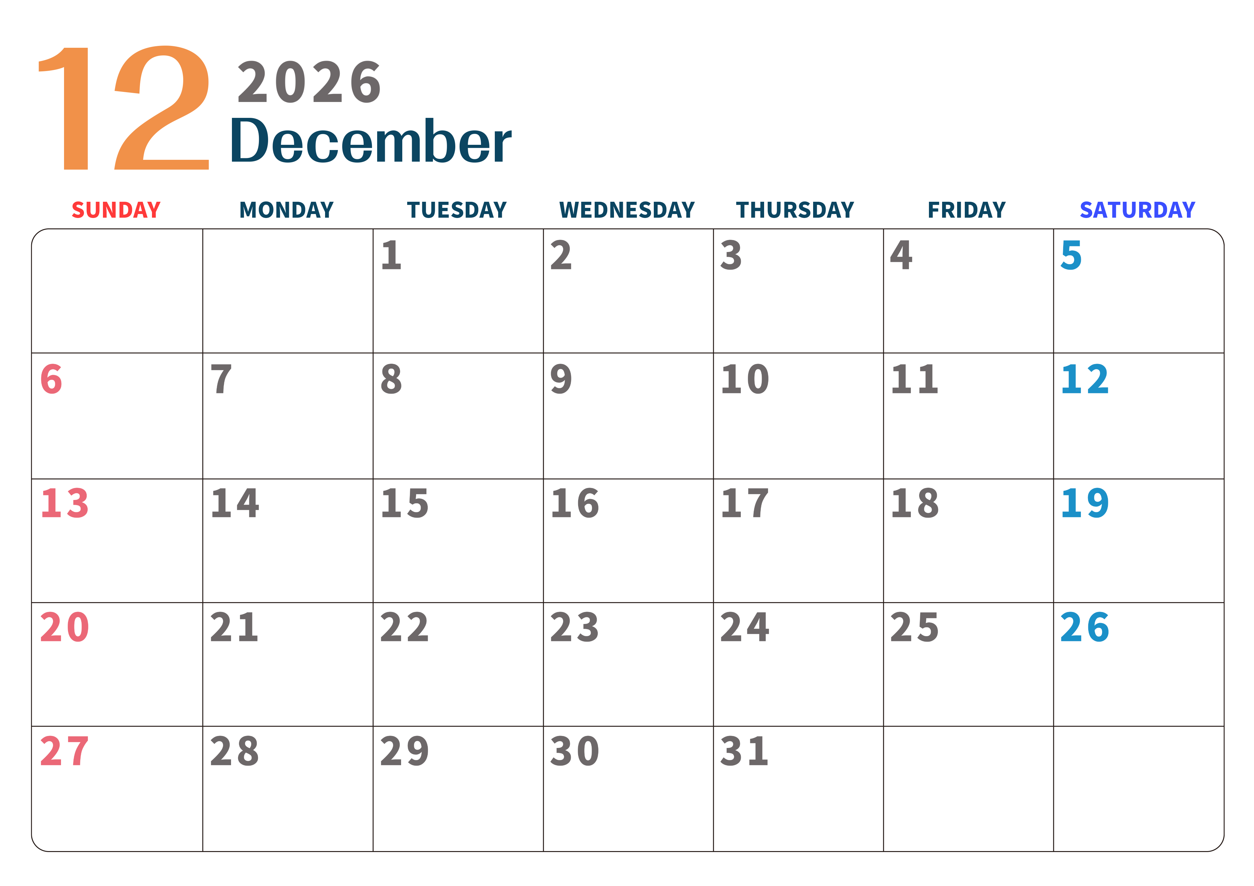 2026年・無料のカレンダーテンプレート 2026年12月横型日曜始まり 書き込みしやすい文字が大きなA4無料シンプルなカレンダー(2026-01091200) 素材状デザイン王 2025年4月8日 2026年12月横型日曜始まりの書き込みしやすい文字が大きなA4無料シンプルなカレンダーです。見やすいのでダウンロード利用をおすすめします。プランの整理にぴったりです。(2026-01091200) シンプル 12月 横型のカレンダー 日曜始まり