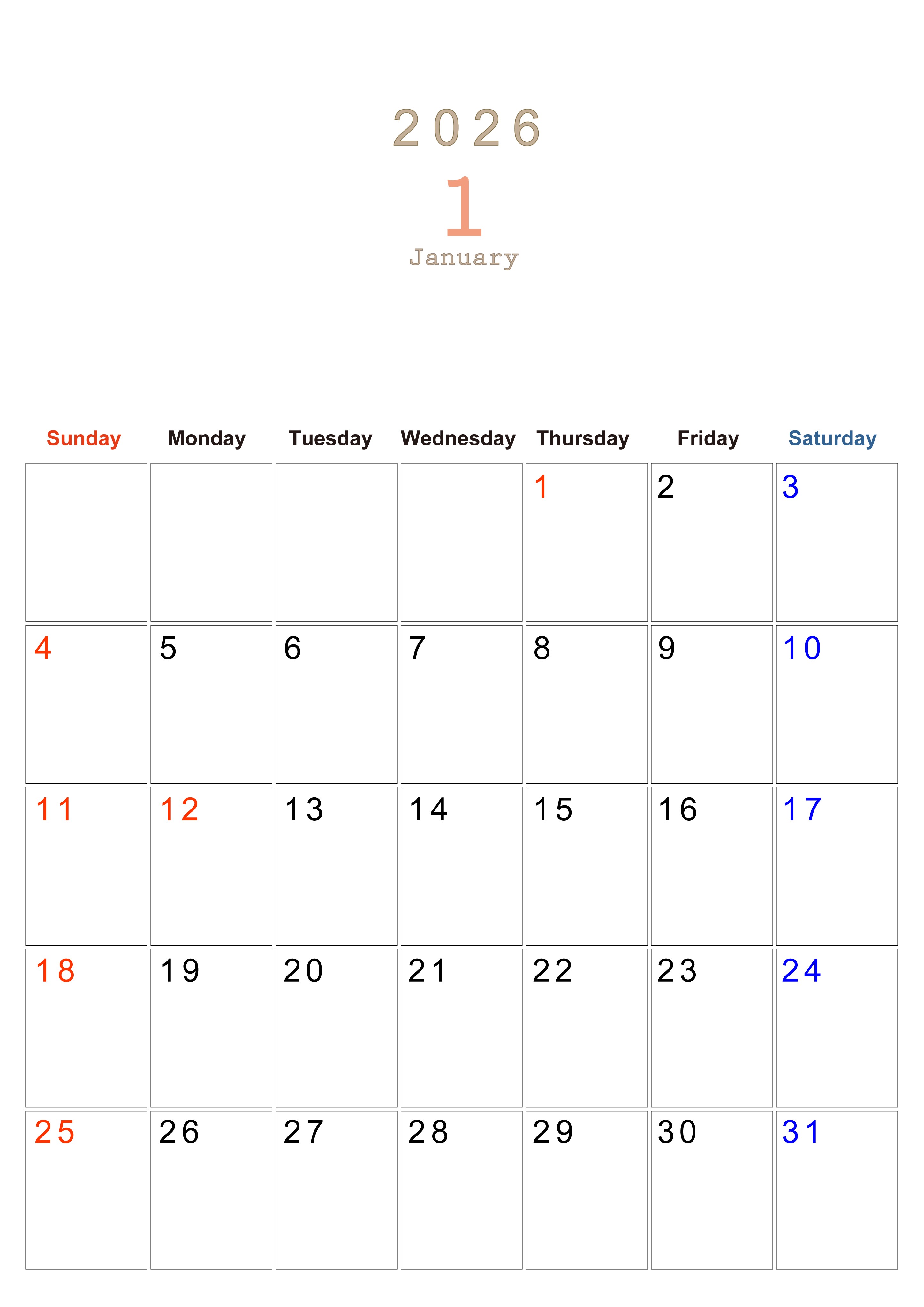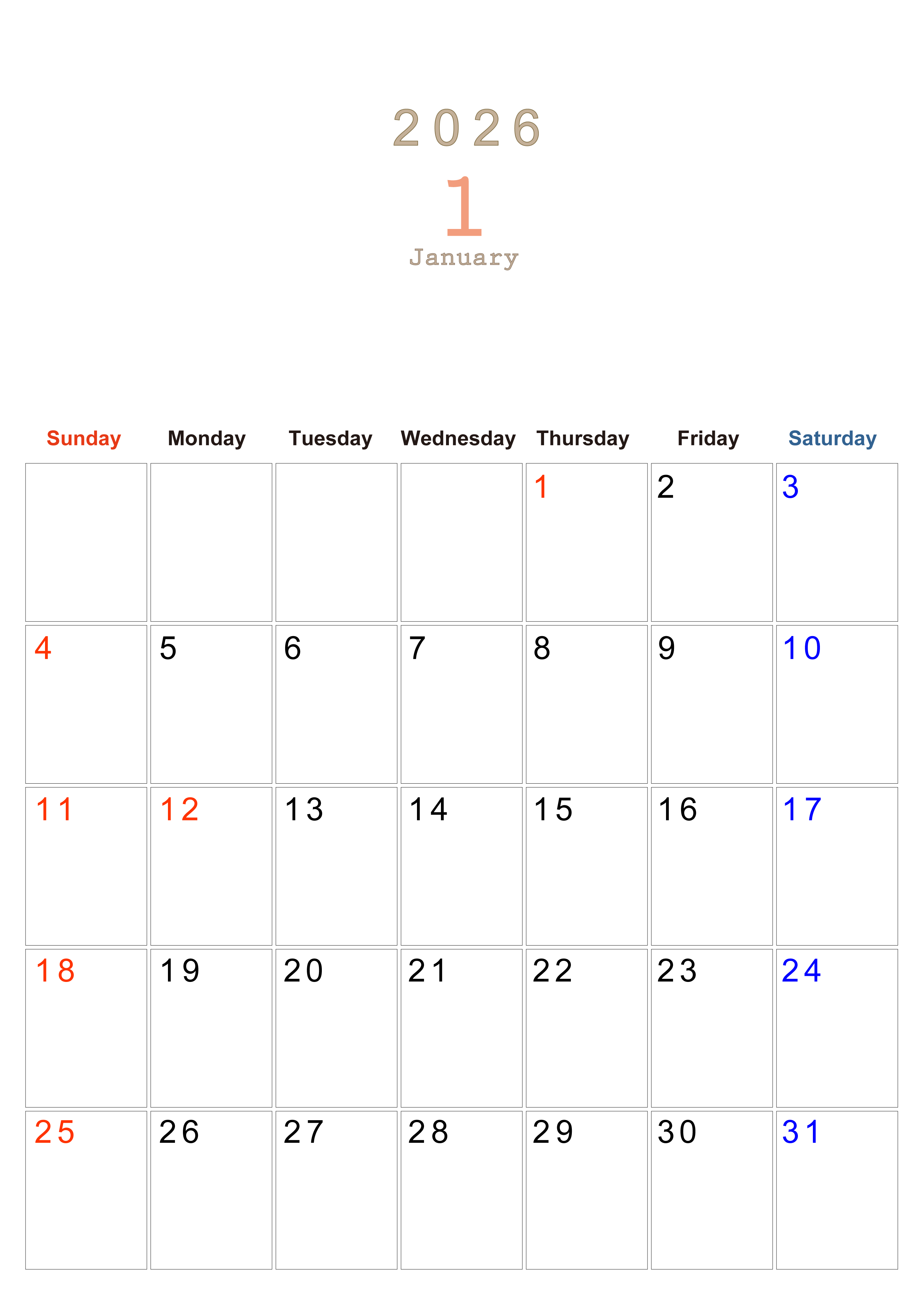 2026年・無料のカレンダーテンプレート 2026年1月縦型日曜始まり 大きい文字が見やすく書き込みも楽なA4無料シンプルカレンダー(2026-01100110) 素材状デザイン王 2025年4月8日 2026年1月縦型日曜始まりの大きい文字が見やすく書き込みも楽なA4無料シンプルカレンダーです。スケジュールの整理におすすめのフリー素材です。計画を効率的に立てましょう。(2026-01100110) シンプル 1月 縦型のカレンダー 日曜始まり カレンダーデザイン-0110