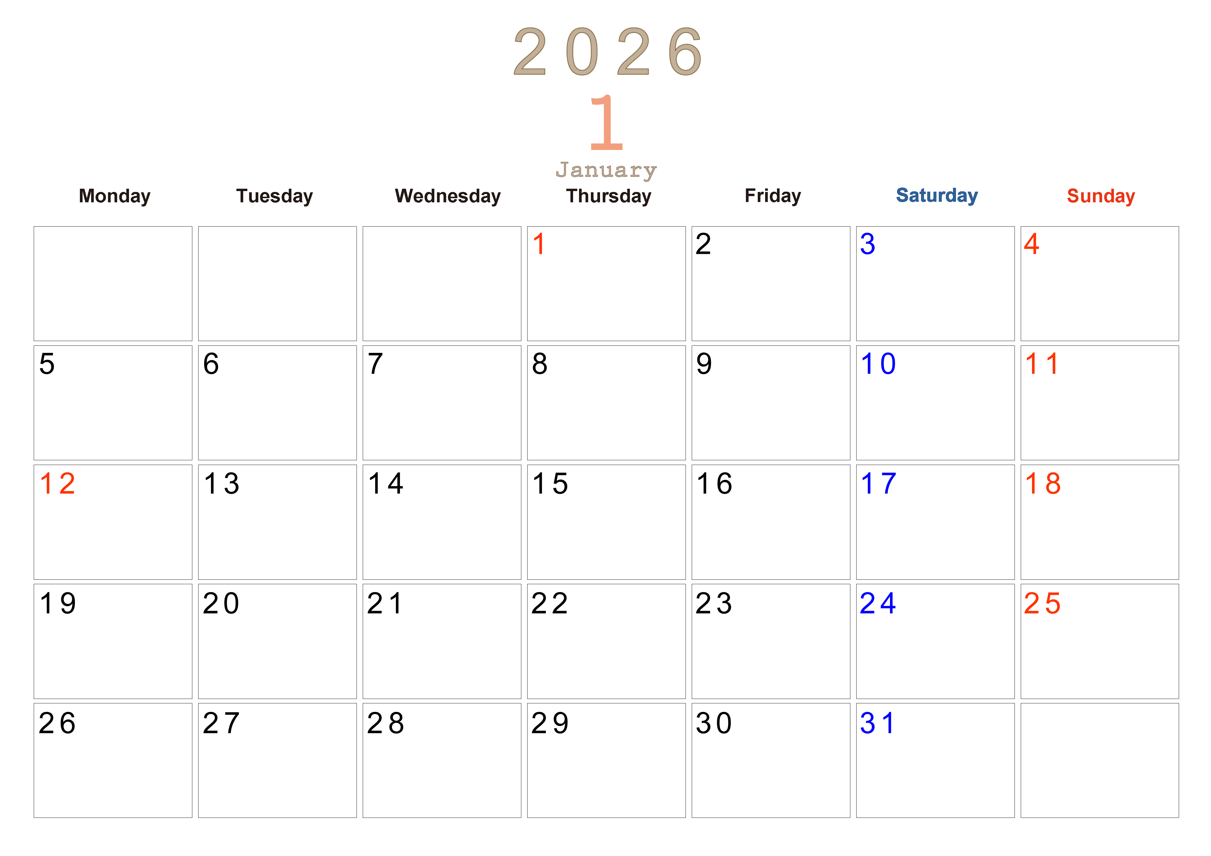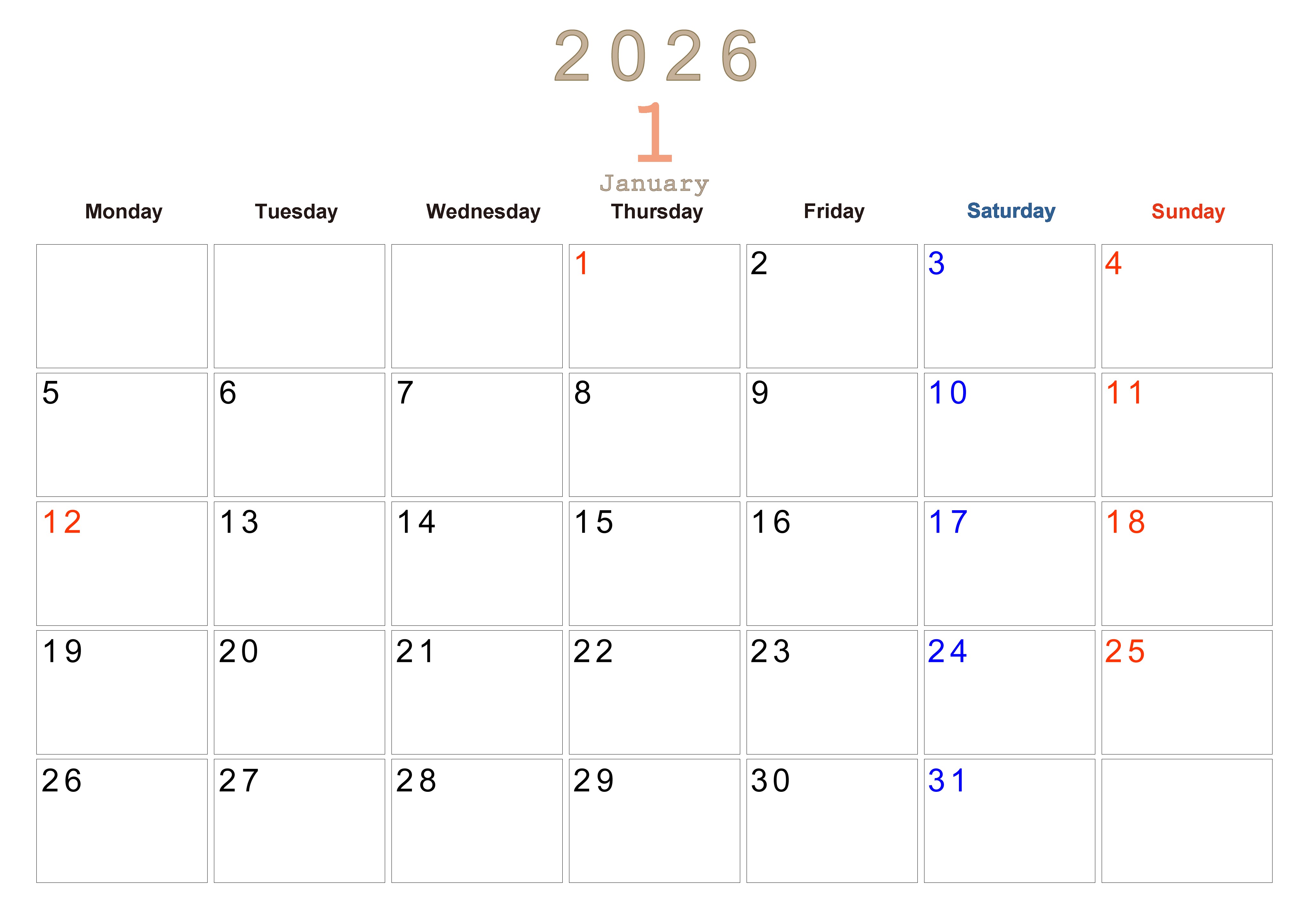 2026年・無料のカレンダーテンプレート 2026年1月横型月曜始まり 大きい文字が見やすく書き込みも楽なA4無料シンプルカレンダー(2026-01100101) 素材状デザイン王 2025年4月8日 2026年1月横型月曜始まりの大きい文字が見やすく書き込みも楽なA4無料シンプルカレンダーです。スケジュールの整理におすすめのフリー素材です。計画を効率的に立てましょう。(2026-01100101) シンプル 1月 横型のカレンダー 月曜始まり カレンダーデザイン-0110