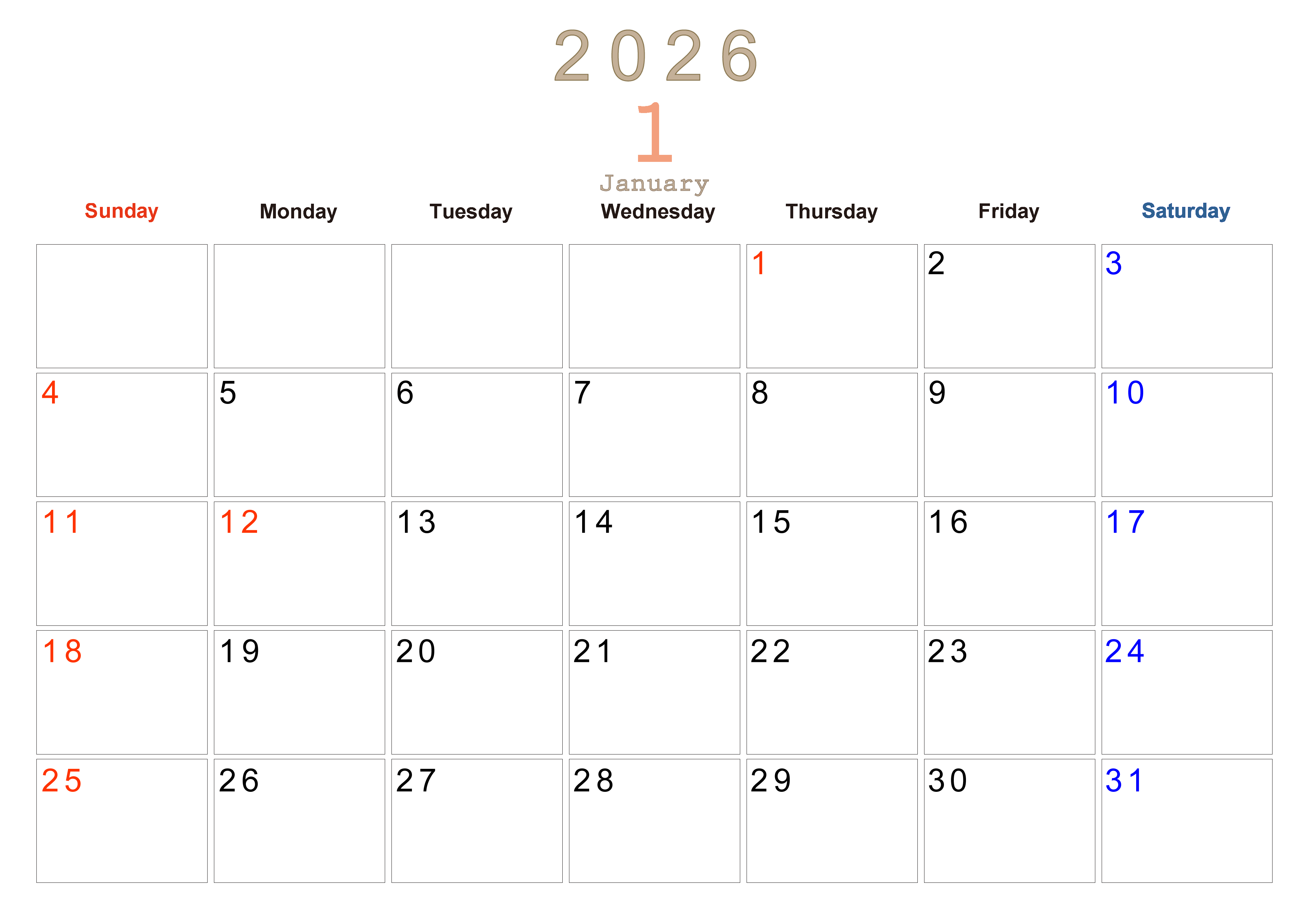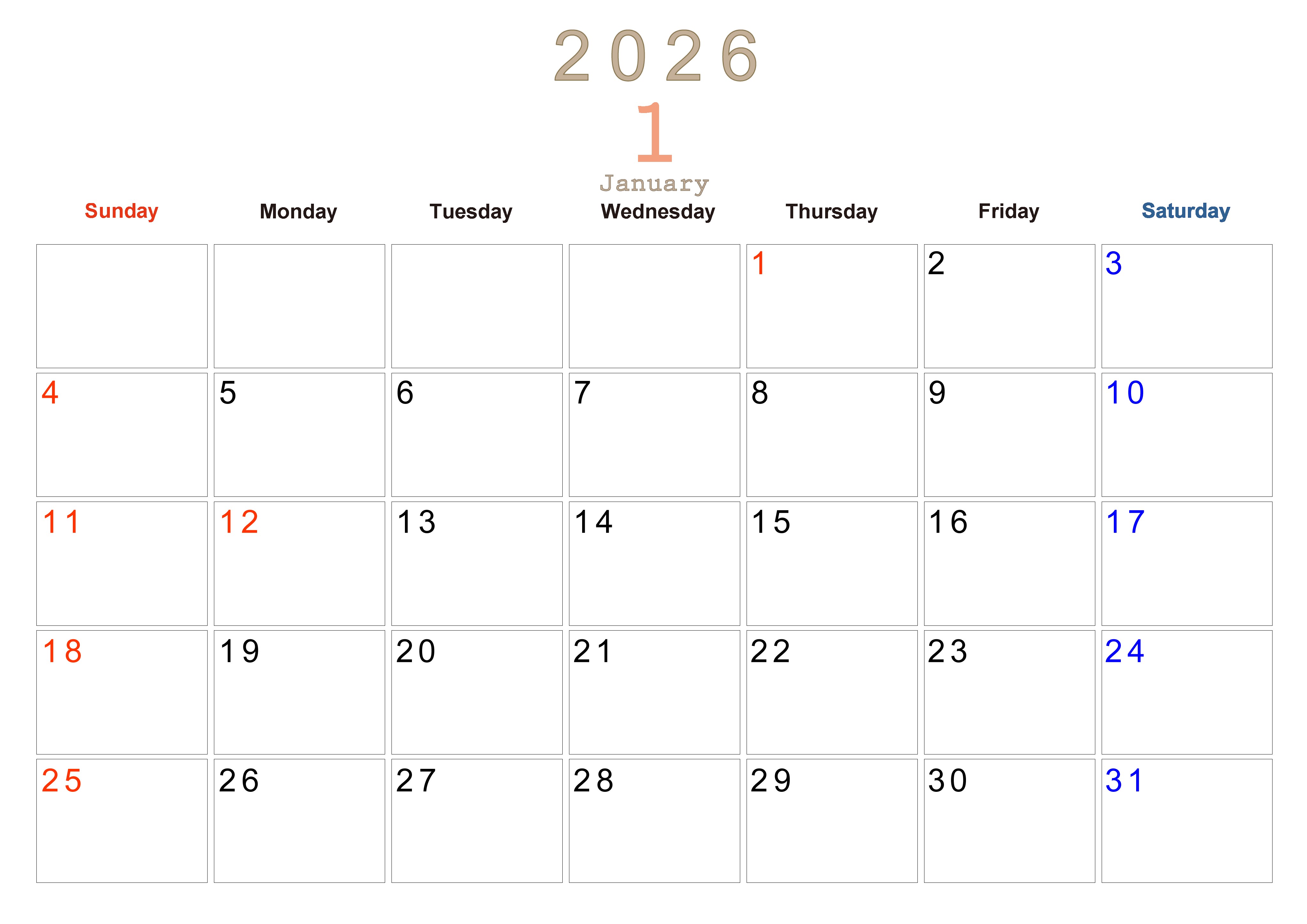 2026年・無料のカレンダーテンプレート 2026年1月横型日曜始まり 大きい文字が見やすく書き込みも楽なA4無料シンプルカレンダー(2026-01100100) 素材状デザイン王 2025年4月8日 2026年1月横型日曜始まりの大きい文字が見やすく書き込みも楽なA4無料シンプルカレンダーです。見やすいのでダウンロード利用をおすすめします。計画を効率的に立てましょう。(2026-01100100) シンプル 1月 横型のカレンダー 日曜始まり カレンダーデザイン-0110