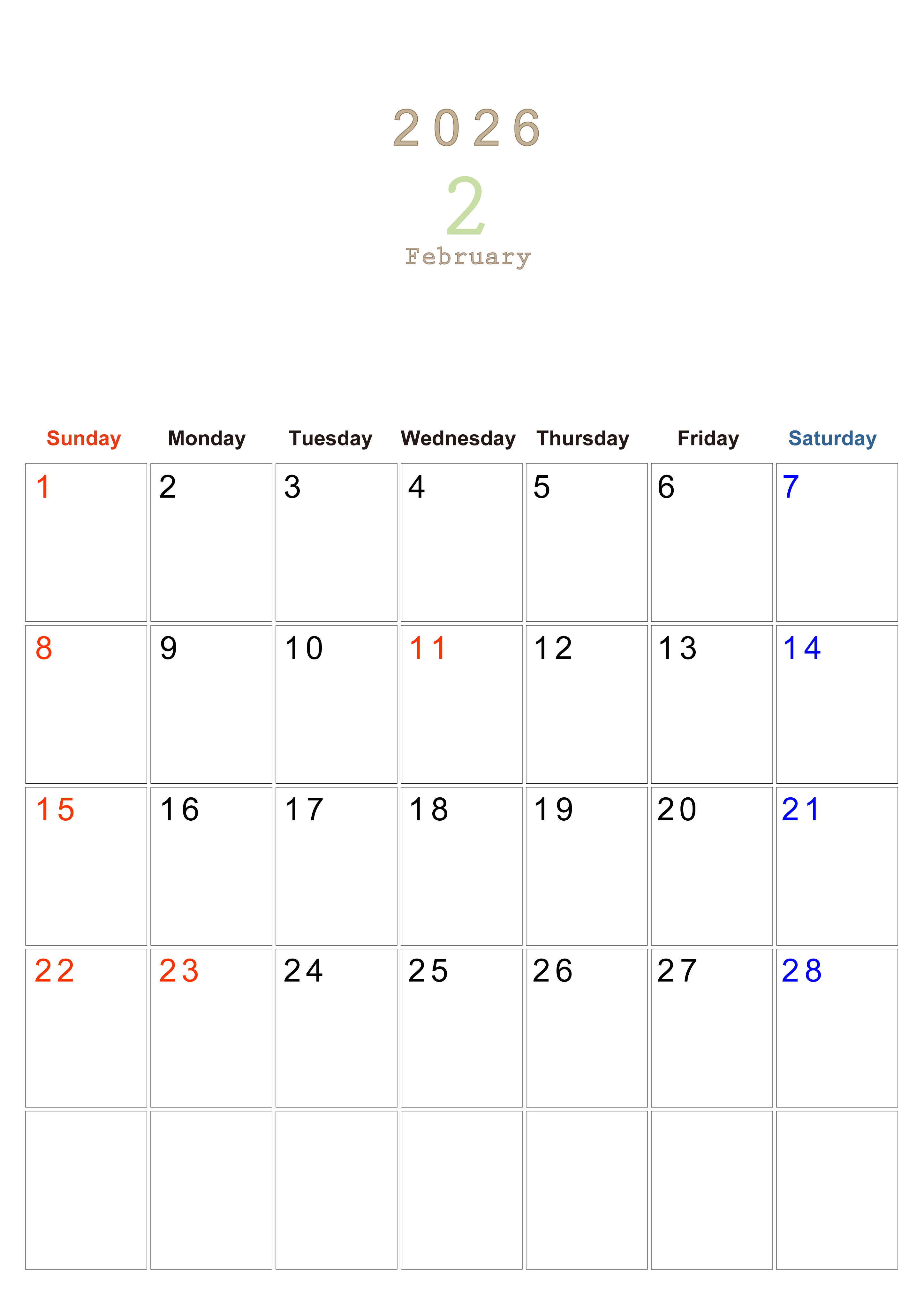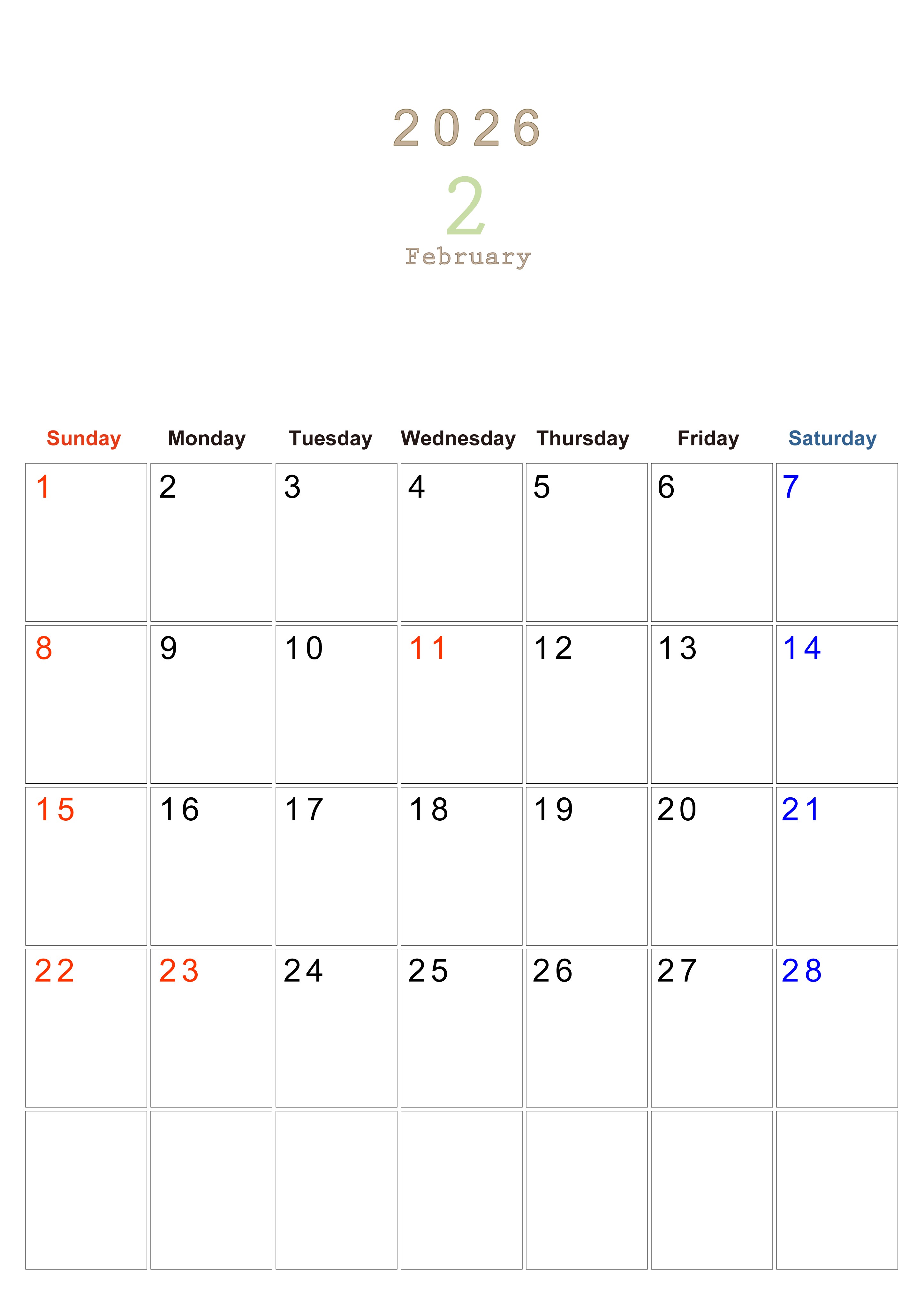 2026年・無料のカレンダーテンプレート 2026年2月縦型日曜始まり 大きい文字が見やすく書き込みも楽なA4無料シンプルカレンダー(2026-01100210) 素材状デザイン王 2025年4月8日 2026年2月縦型日曜始まりの大きい文字が見やすく書き込みも楽なA4無料シンプルカレンダーです。スケジュールの整理におすすめのフリー素材です。忙しいスケジュールを簡単にまとめて書き込みましょう。(2026-01100210) シンプル 2月 縦型のカレンダー 日曜始まり カレンダーデザイン-0110