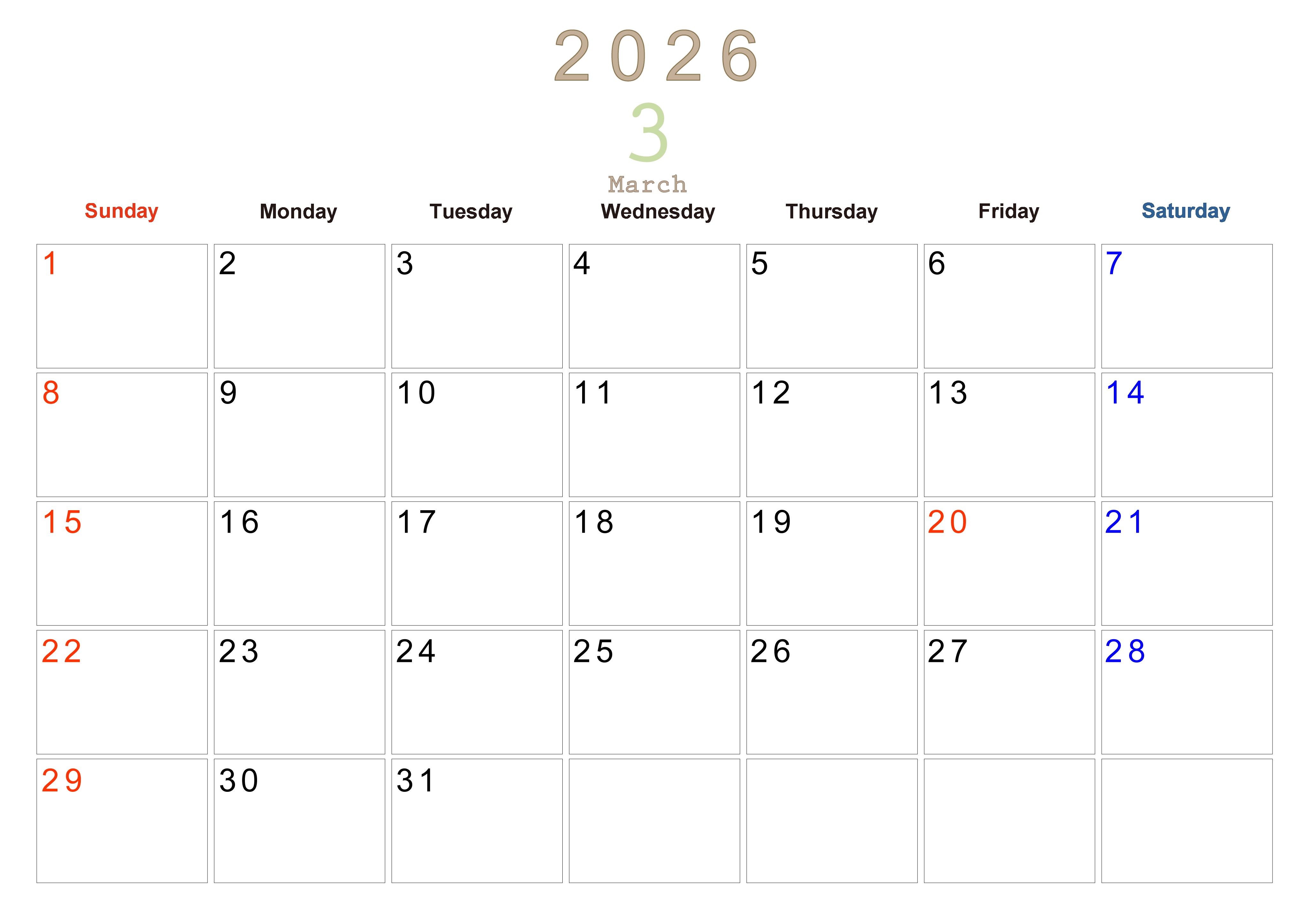 2026年3月横型日曜始まり 大きい文字が見やすく書き込みも楽なA4無料シンプルカレンダー(2026-01100300)