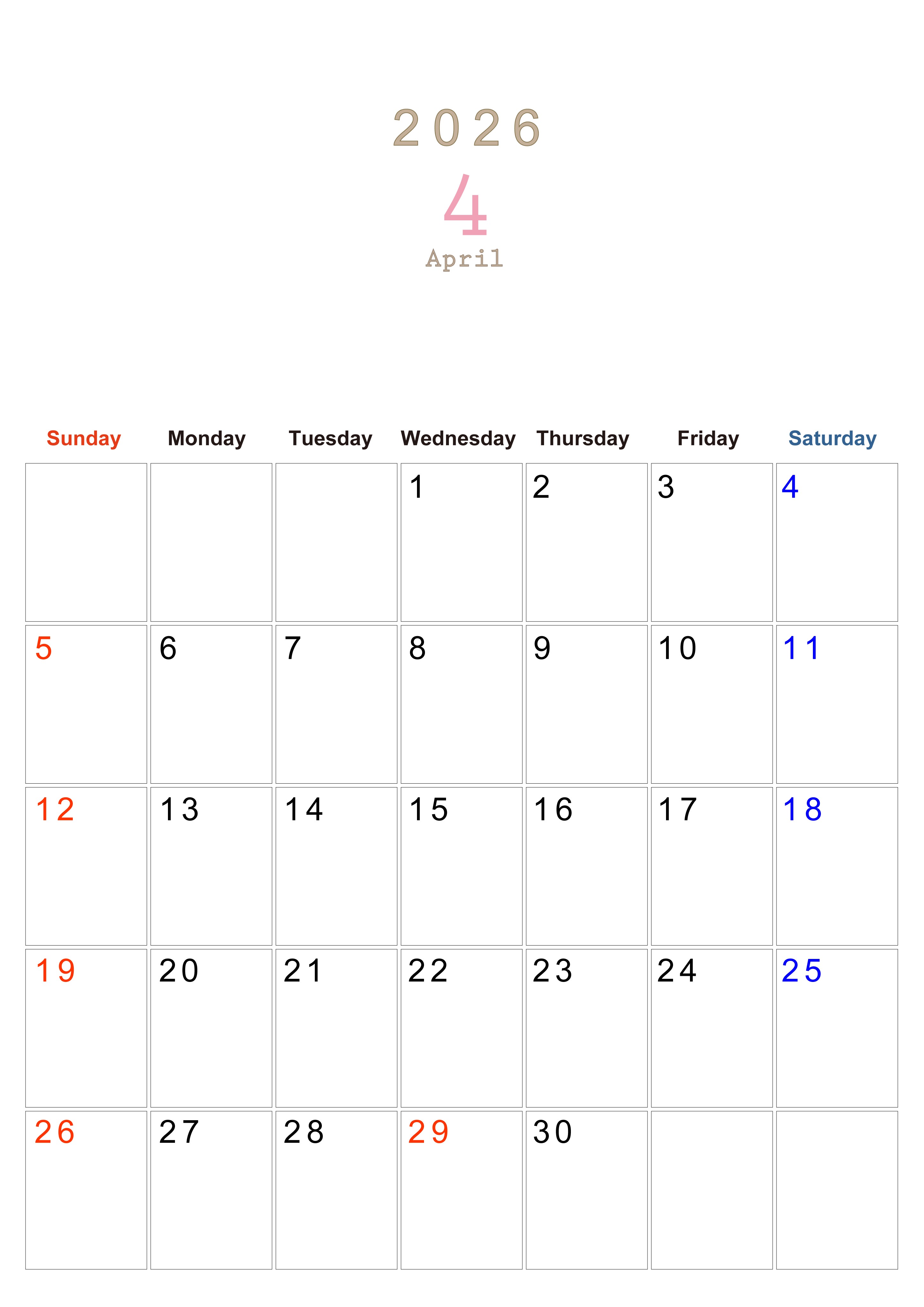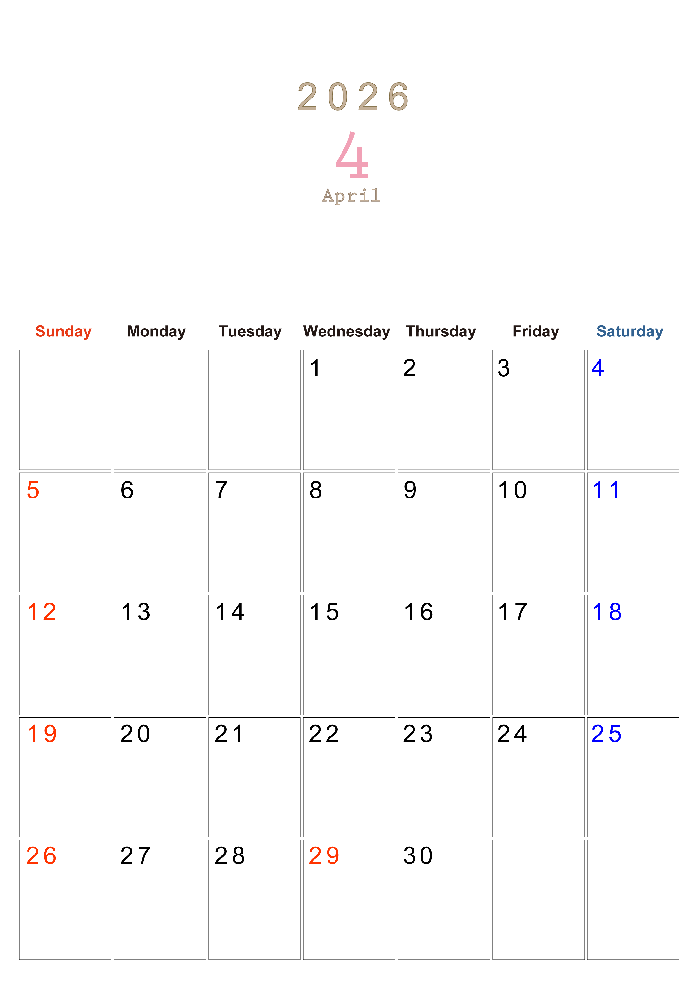 2026年・無料のカレンダーテンプレート 2026年4月縦型日曜始まり 大きい文字が見やすく書き込みも楽なA4無料シンプルカレンダー(2026-01100410) 素材状デザイン王 2025年4月8日 2026年4月縦型日曜始まりの大きい文字が見やすく書き込みも楽なA4無料シンプルカレンダーです。スケジュールの整理におすすめのフリー素材です。計画を効率的に立てましょう。(2026-01100410) シンプル 4月 縦型のカレンダー 日曜始まり カレンダーデザイン-0110