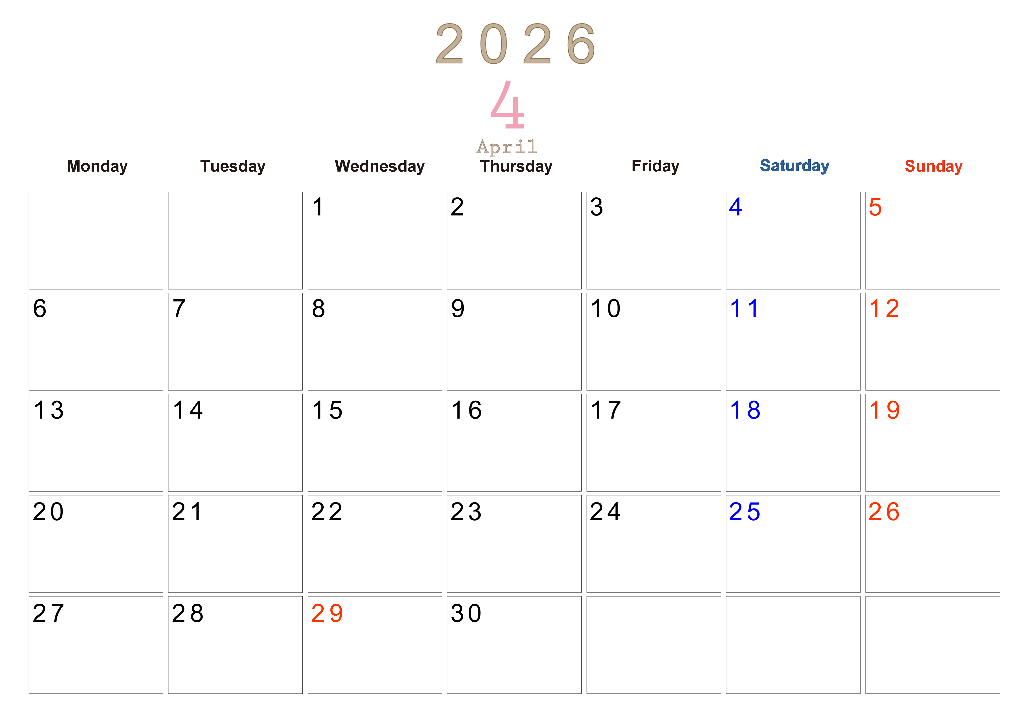 2026年・無料のカレンダーテンプレート 2026年4月横型月曜始まり 大きい文字が見やすく書き込みも楽なA4無料シンプルカレンダー(2026-01100401) 素材状デザイン王 2025年4月8日 2026年4月横型月曜始まりの大きい文字が見やすく書き込みも楽なA4無料シンプルカレンダーです。スケジュールの整理におすすめのフリー素材です。計画を効率的に立てましょう。(2026-01100401) シンプル 4月 横型のカレンダー 月曜始まり カレンダーデザイン-0110