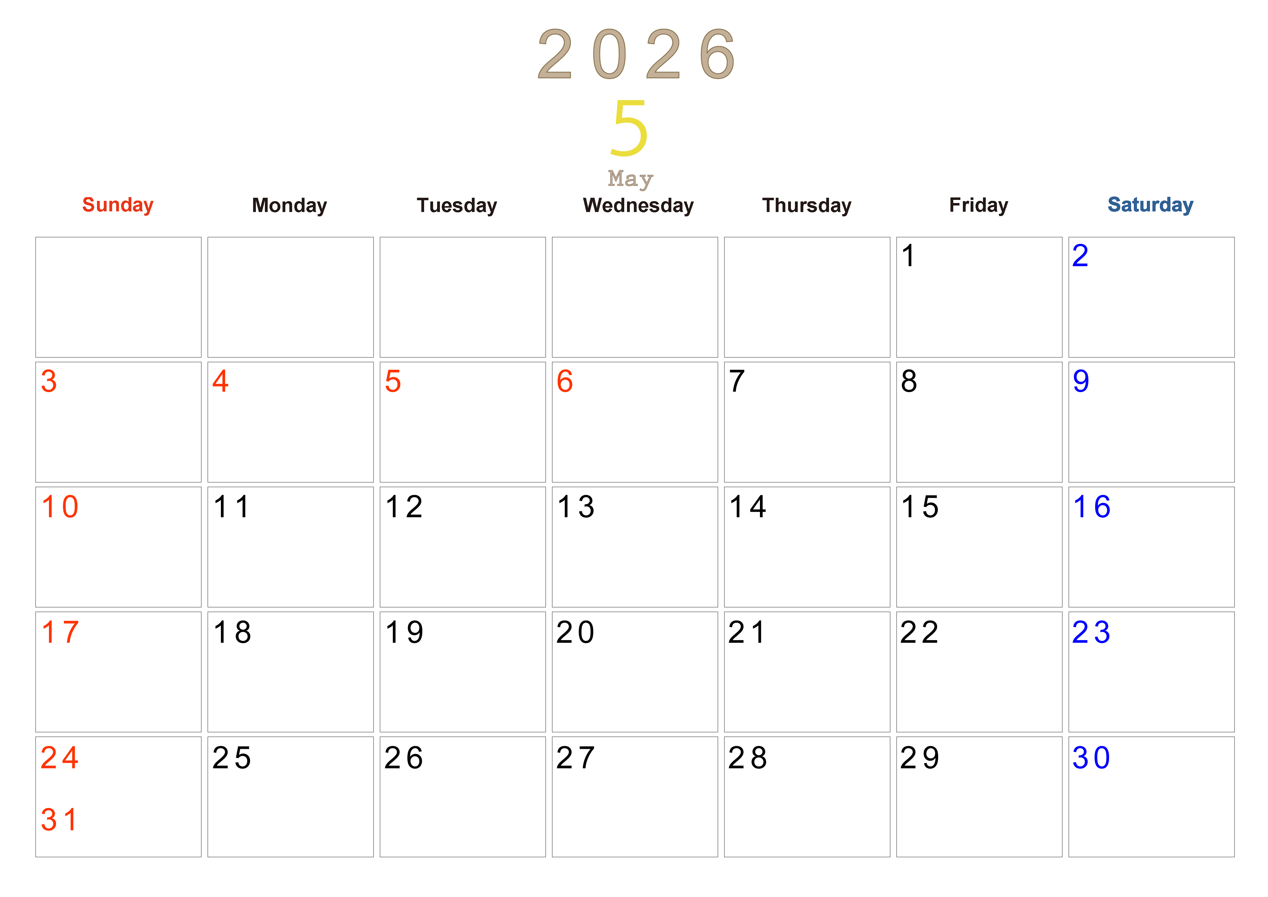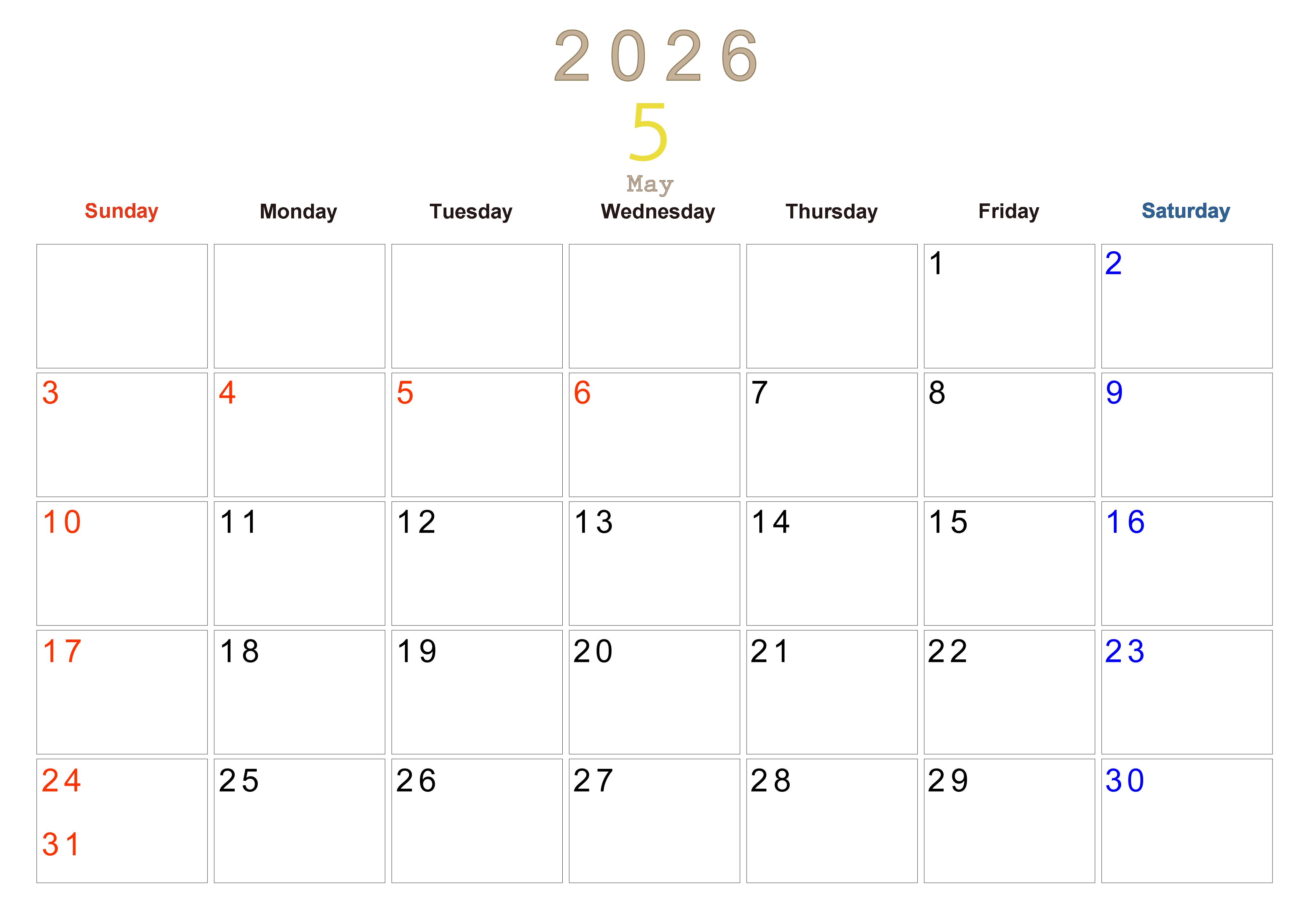 2026年5月横型日曜始まりの大きい文字が見やすく書き込みも楽なA4無料シンプルカレンダーです。スケジュールの整理におすすめのフリー素材です。忙しいスケジュールを簡単にまとめて書き込みましょう。(2026-01100500)