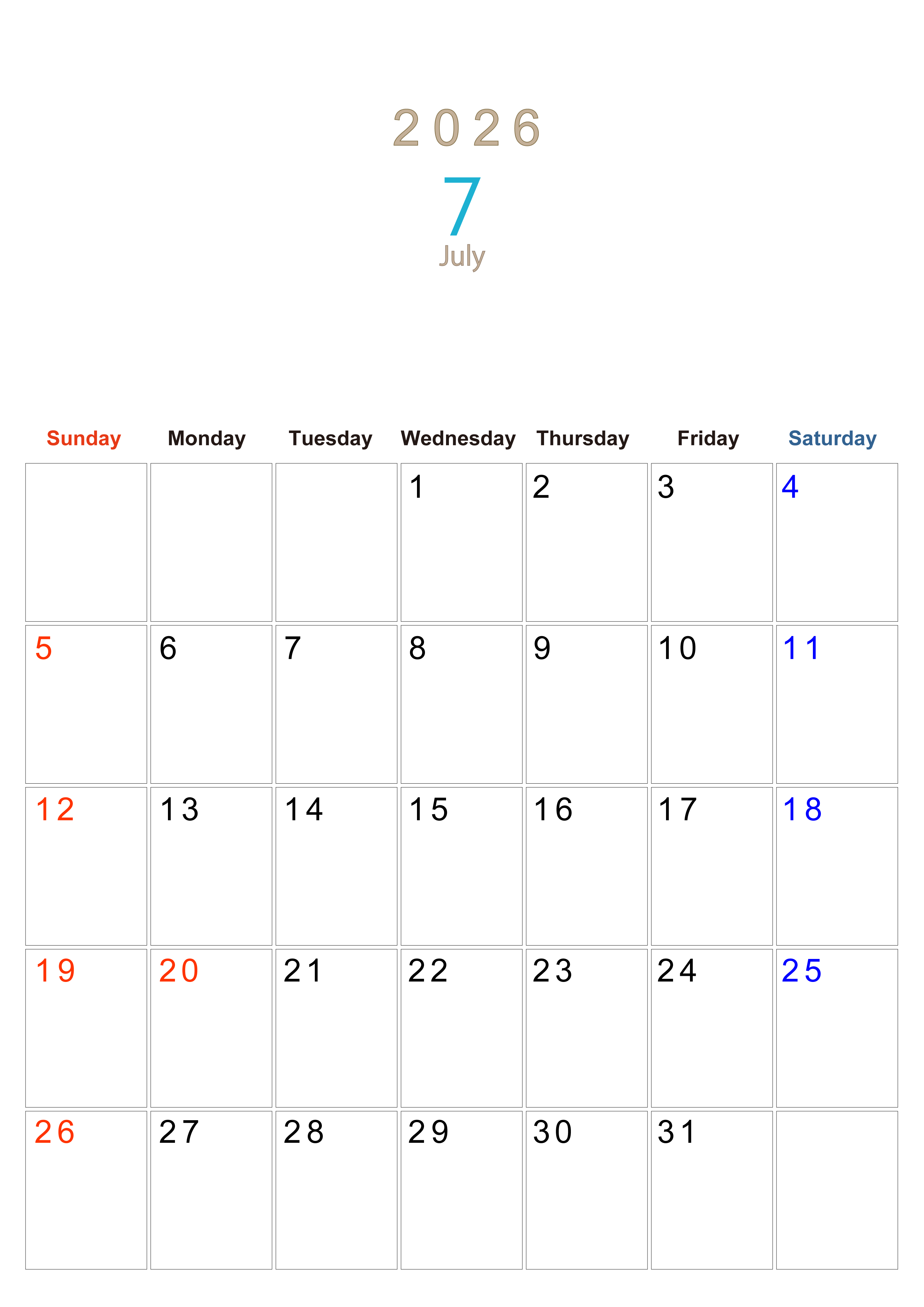 2026年・無料のカレンダーテンプレート 2026年7月縦型日曜始まり 大きい文字が見やすく書き込みも楽なA4無料シンプルカレンダー(2026-01100710) 素材状デザイン王 2025年4月8日 2026年7月縦型日曜始まりの大きい文字が見やすく書き込みも楽なA4無料シンプルカレンダーです。スケジュールの整理におすすめのフリー素材です。計画を効率的に立てましょう。(2026-01100710) シンプル 7月 縦型のカレンダー 日曜始まり カレンダーデザイン-0110