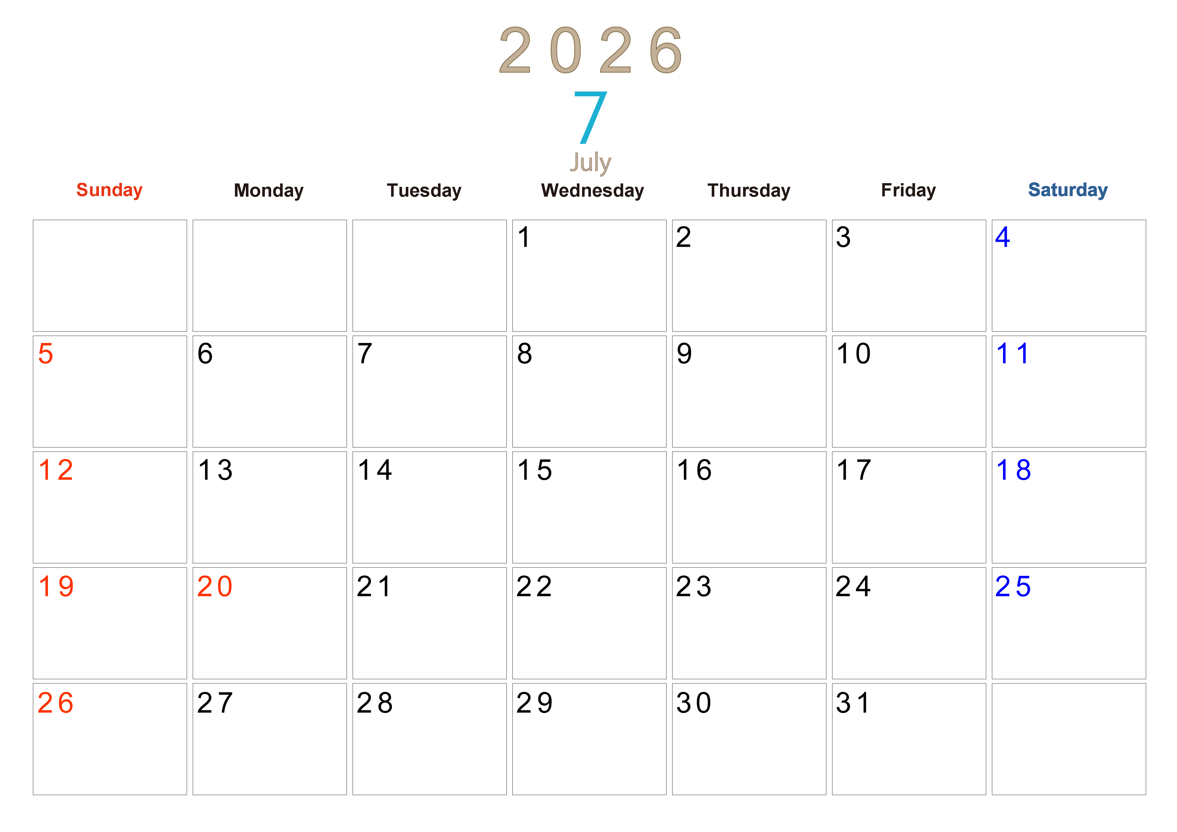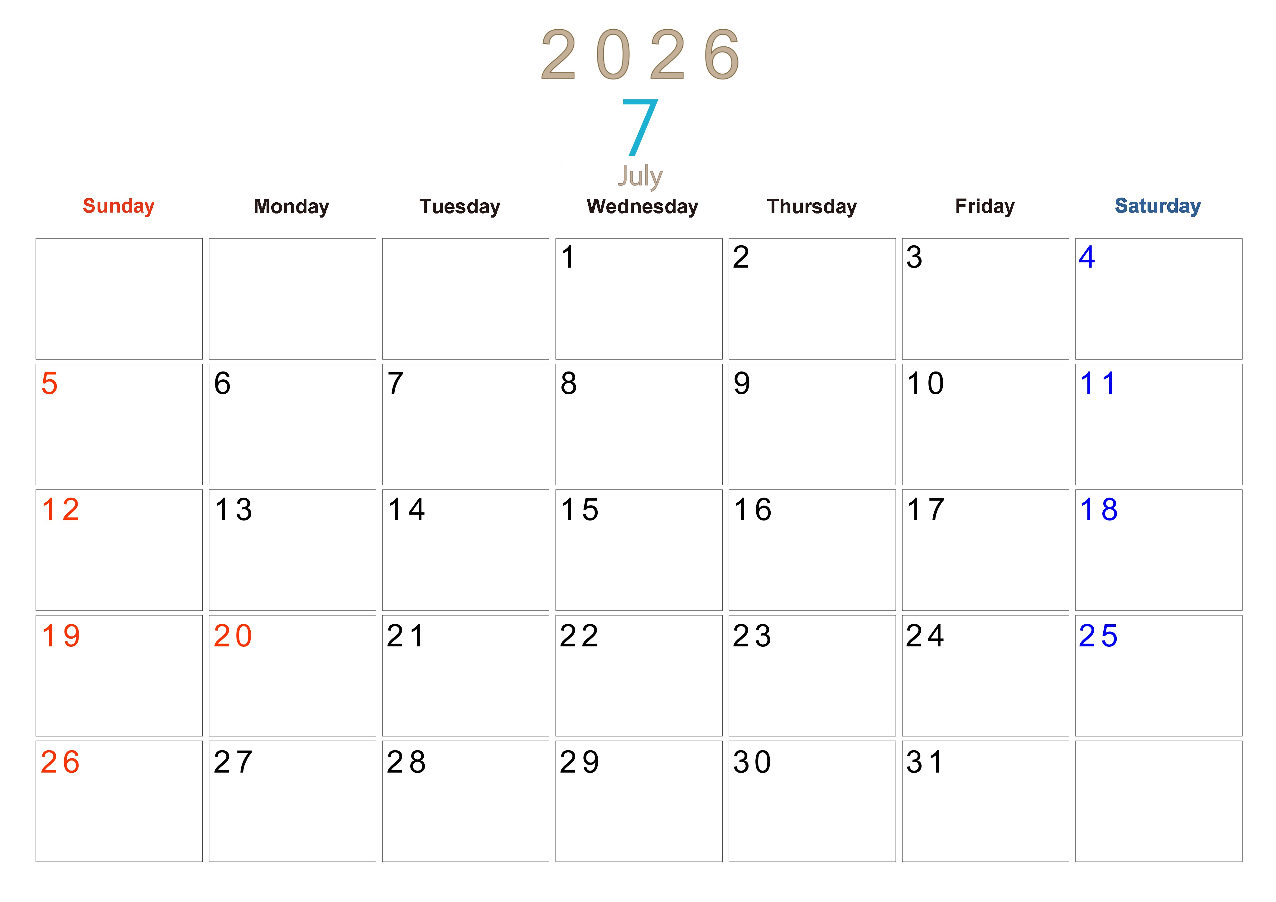 2026年7月横型日曜始まりの大きい文字が見やすく書き込みも楽なA4無料シンプルカレンダーです。スケジュールの整理におすすめのフリー素材です。計画を効率的に立てましょう。(2026-01100700)