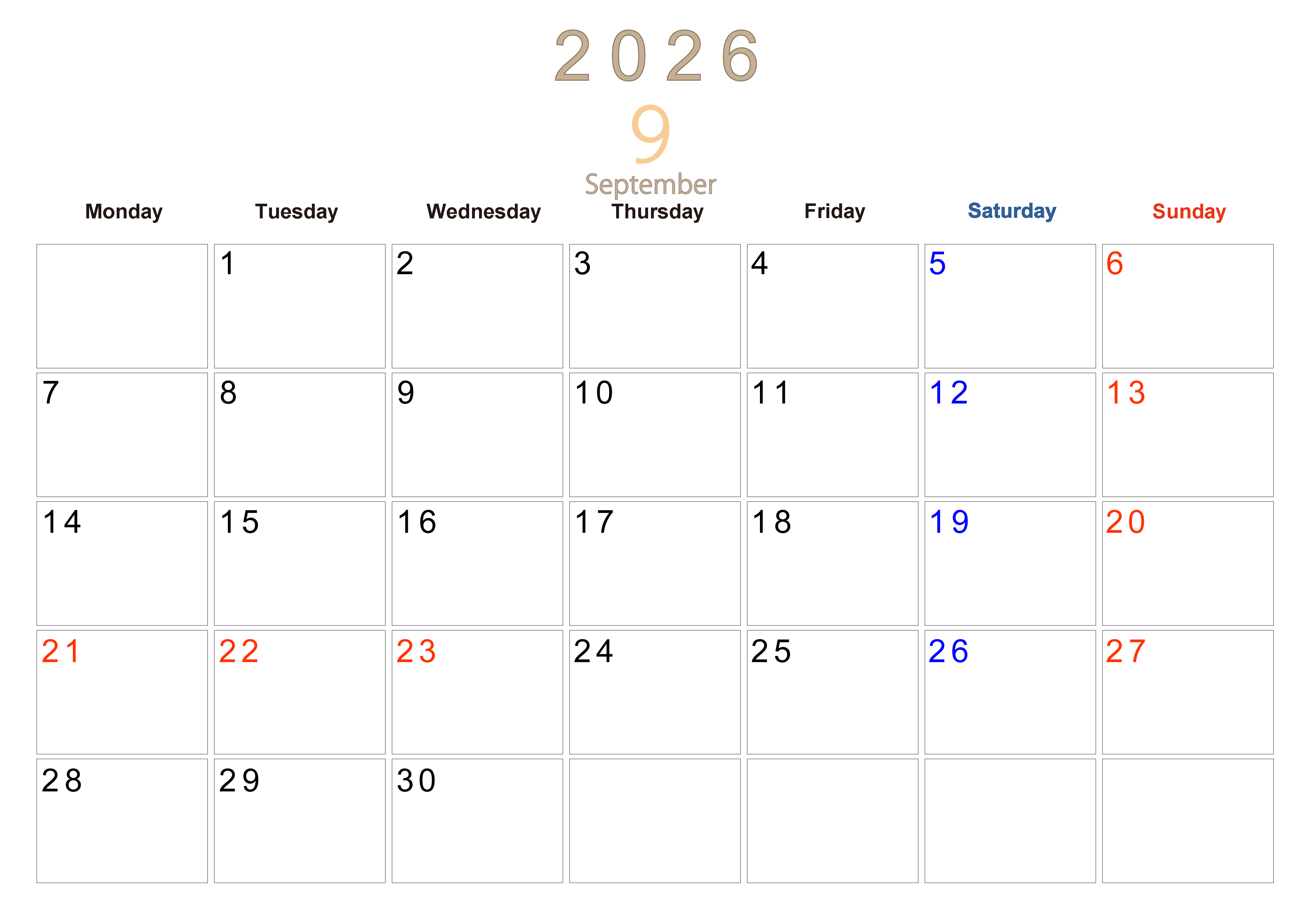 2026年9月横型月曜始まりの大きい文字が見やすく書き込みも楽なA4無料シンプルカレンダーです。スケジュールの整理におすすめのフリー素材です。多忙なプランの可視化に役立ちます。(2026-01100901)