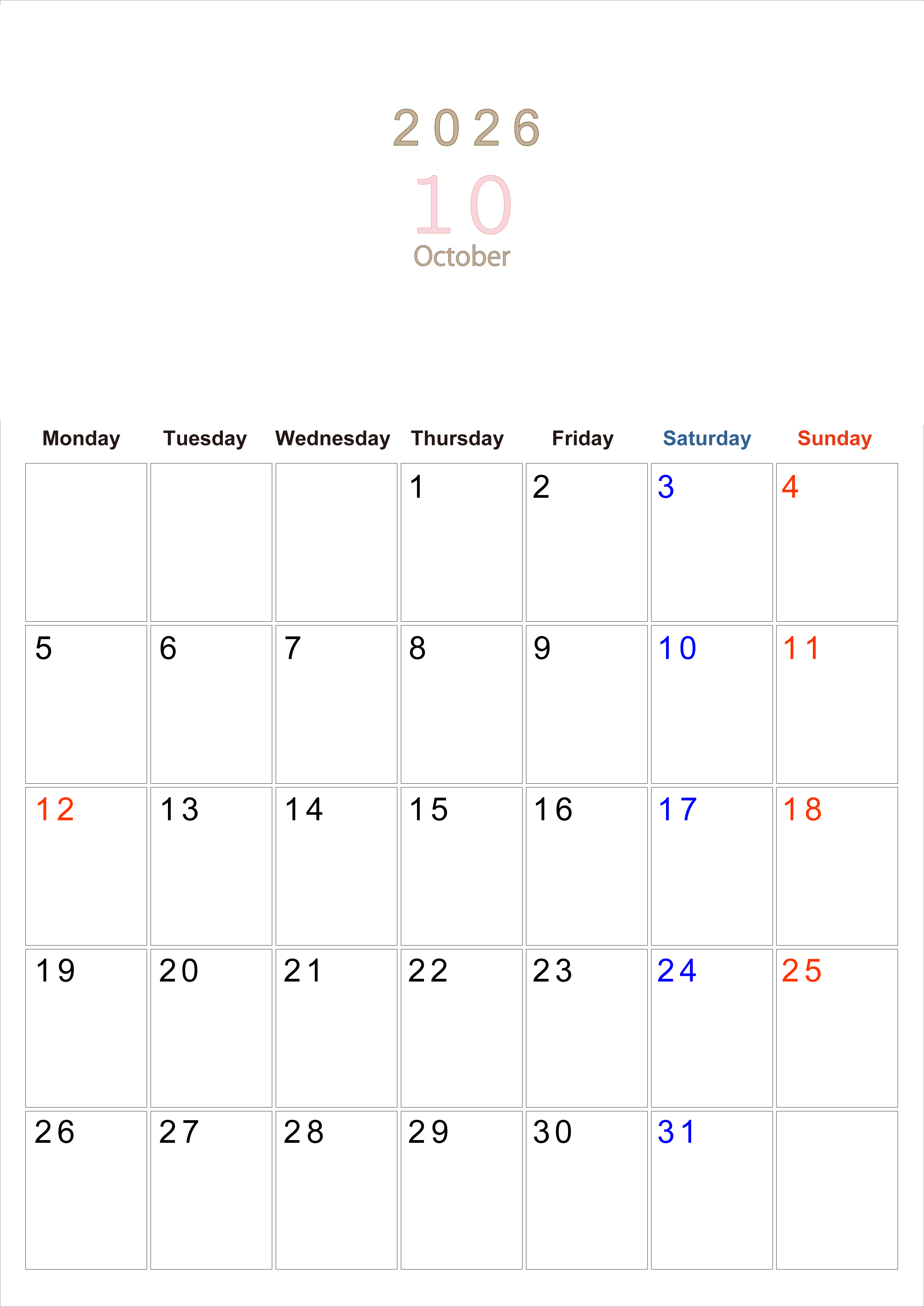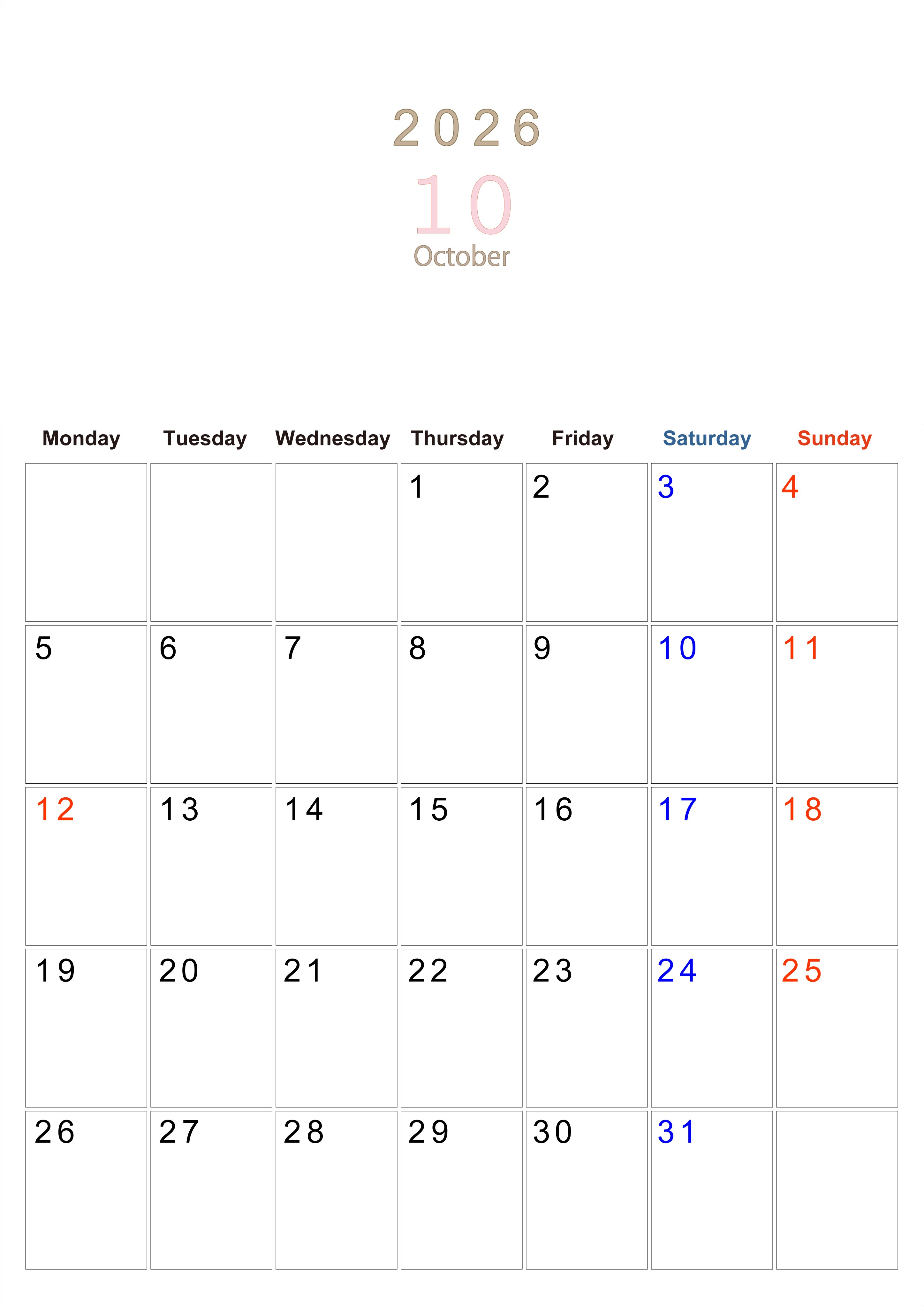 2026年・無料のカレンダーテンプレート 2026年10月縦型月曜始まり 大きい文字が見やすく書き込みも楽なA4無料シンプルカレンダー(2026-01101011) 素材状デザイン王 2025年4月8日 2026年10月縦型月曜始まりの大きい文字が見やすく書き込みも楽なA4無料シンプルカレンダーです。スケジュールの整理におすすめのフリー素材です。計画を効率的に立てましょう。(2026-01101011) シンプル 10月 縦型のカレンダー 月曜始まり カレンダーデザイン-0110