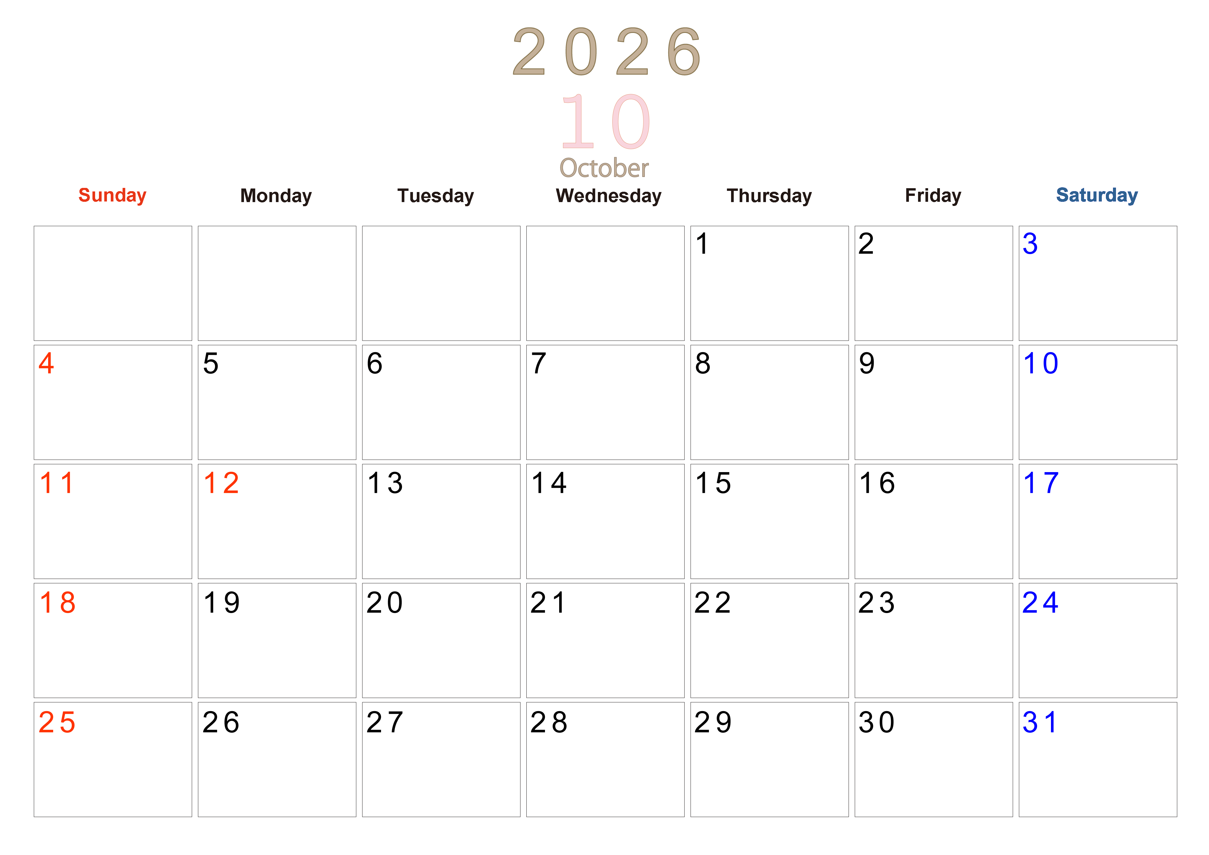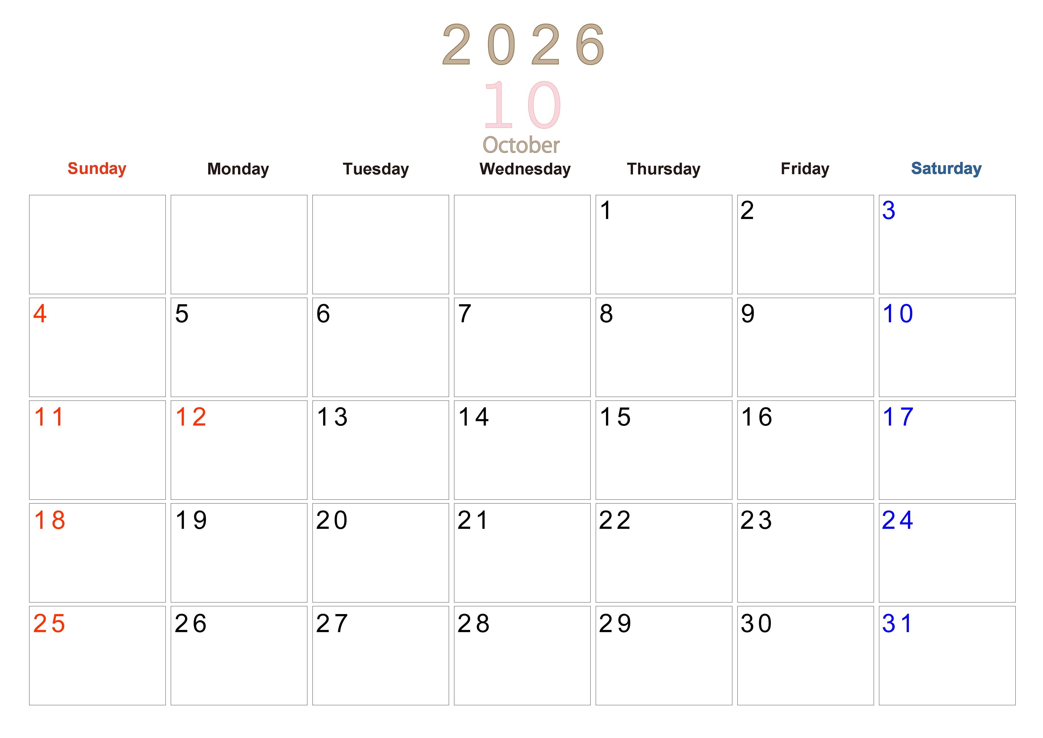 2026年・無料のカレンダーテンプレート 2026年10月横型日曜始まり 大きい文字が見やすく書き込みも楽なA4無料シンプルカレンダー(2026-01101000) 素材状デザイン王 2025年4月8日 2026年10月横型日曜始まりの大きい文字が見やすく書き込みも楽なA4無料シンプルカレンダーです。スケジュールの整理におすすめのフリー素材です。計画を効率的に立てましょう。(2026-01101000) シンプル 10月 横型のカレンダー 日曜始まり カレンダーデザイン-0110