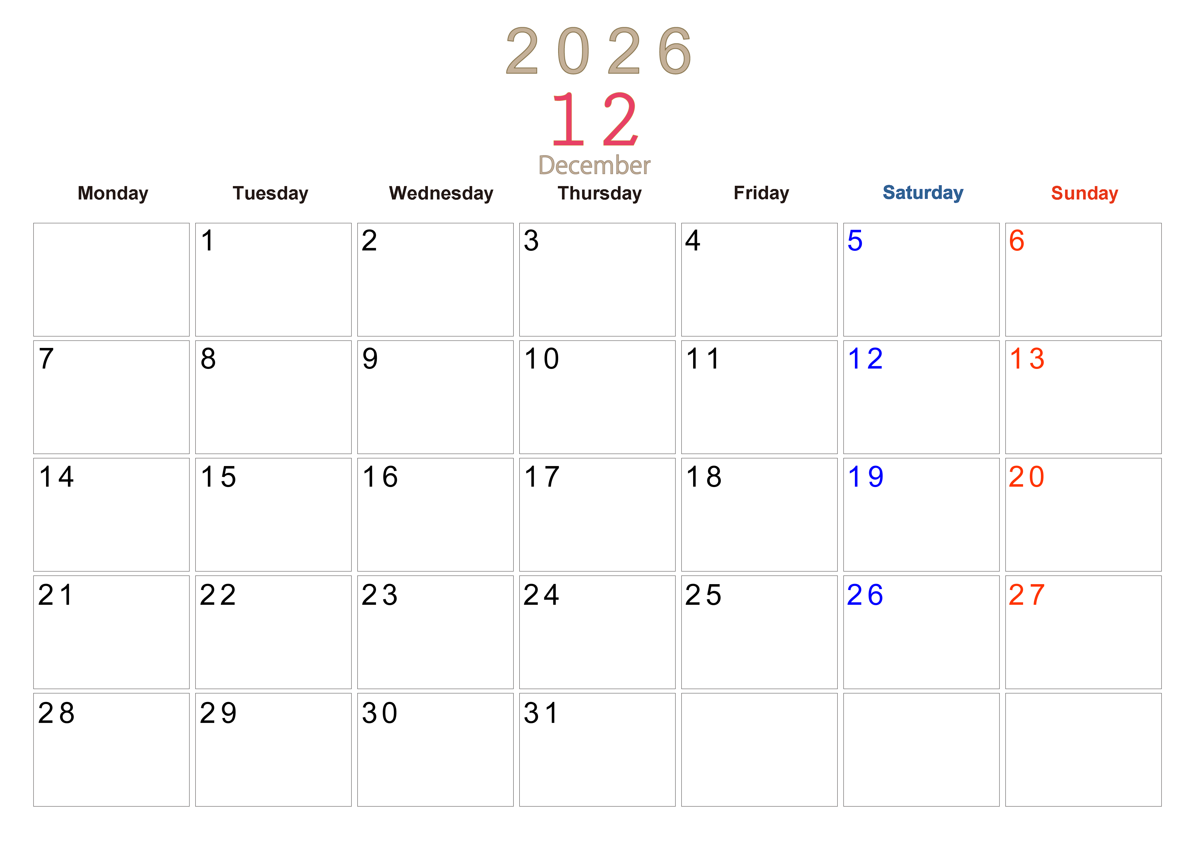 2026年12月横型月曜始まりの大きい文字が見やすく書き込みも楽なA4無料シンプルカレンダーです。スケジュールの整理におすすめのフリー素材です。多忙なプランの可視化に役立ちます。(2026-01101201)