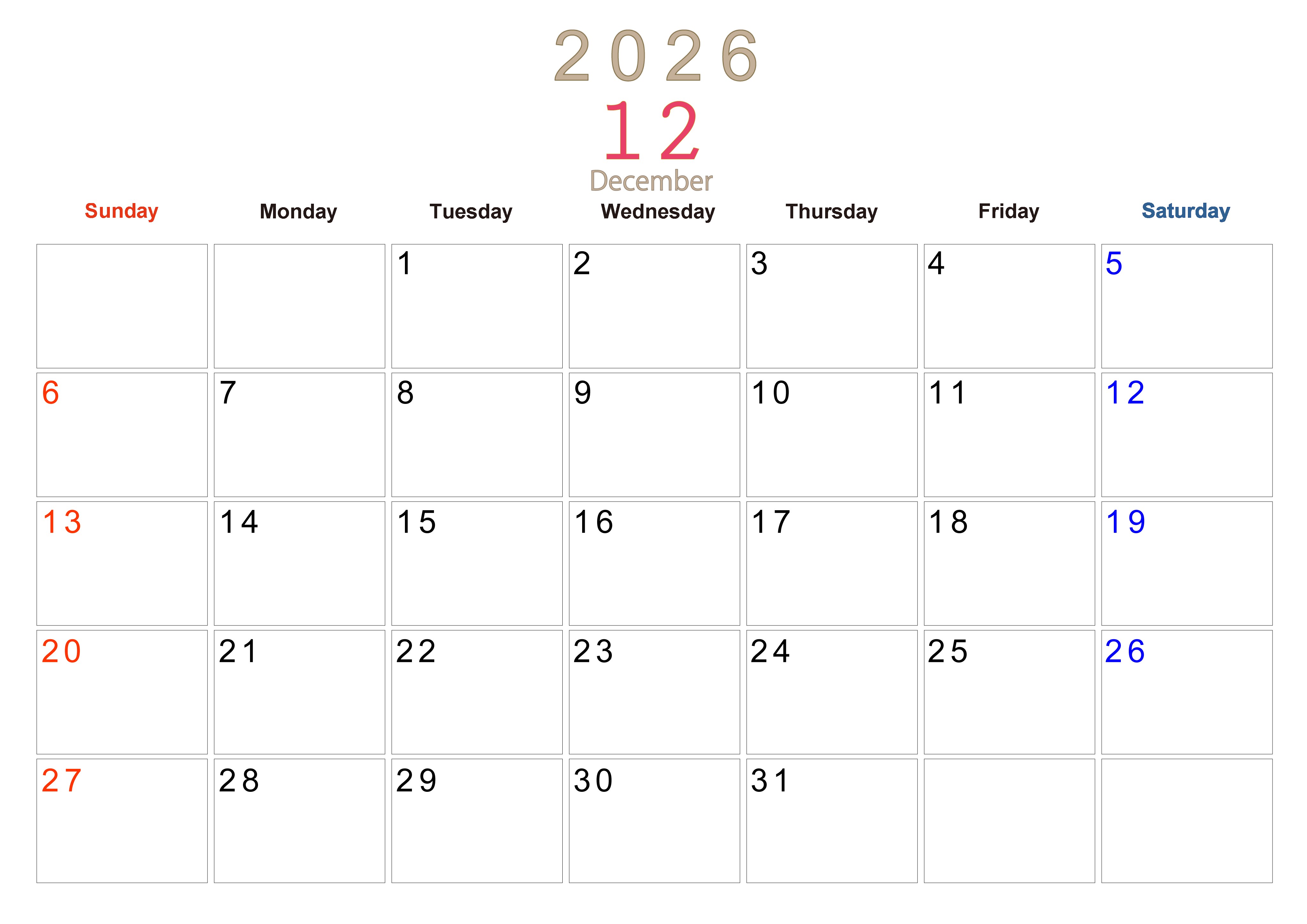 2026年・無料のカレンダーテンプレート 2026年12月横型日曜始まり 大きい文字が見やすく書き込みも楽なA4無料シンプルカレンダー(2026-01101200) 素材状デザイン王 2025年4月8日 2026年12月横型日曜始まりの大きい文字が見やすく書き込みも楽なA4無料シンプルカレンダーです。スケジュールの整理におすすめのフリー素材です。多忙なプランの可視化に役立ちます。(2026-01101200) シンプル 12月 横型のカレンダー 日曜始まり カレンダーデザイン-0110