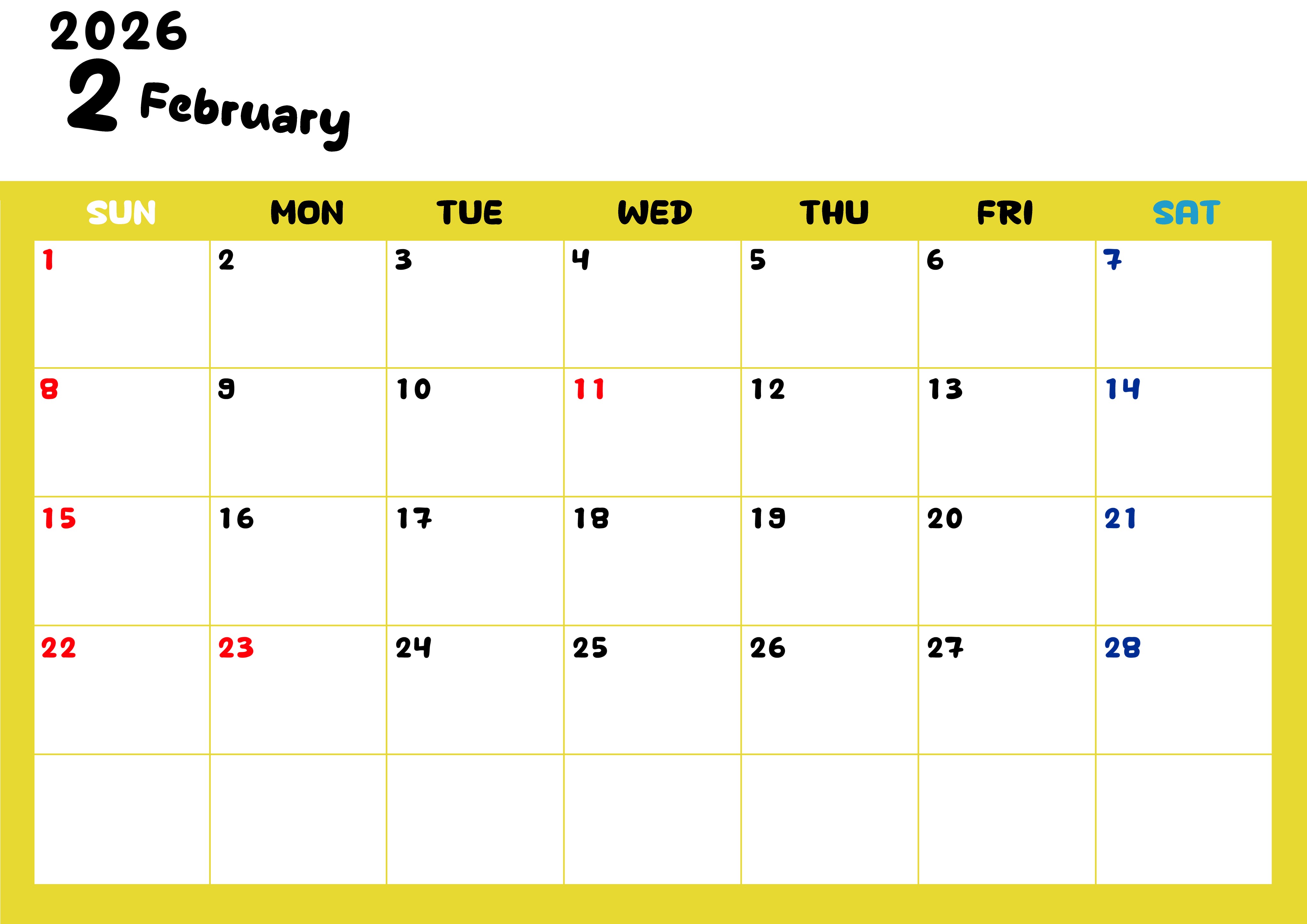2026年・無料のカレンダーテンプレート 2026年2月横型日曜始まり 書き込みしやすい文字が大きなA4無料シンプルなカレンダー(2026-01110200) 素材状デザイン王 2025年4月8日 2026年2月横型日曜始まりの書き込みしやすい文字が大きなA4無料シンプルなカレンダーです。見やすいのでダウンロード利用をおすすめします。スケジュールを管理しやすいです。(2026-01110200) シンプル 2月 横型のカレンダー 日曜始まり カレンダーデザイン-0111