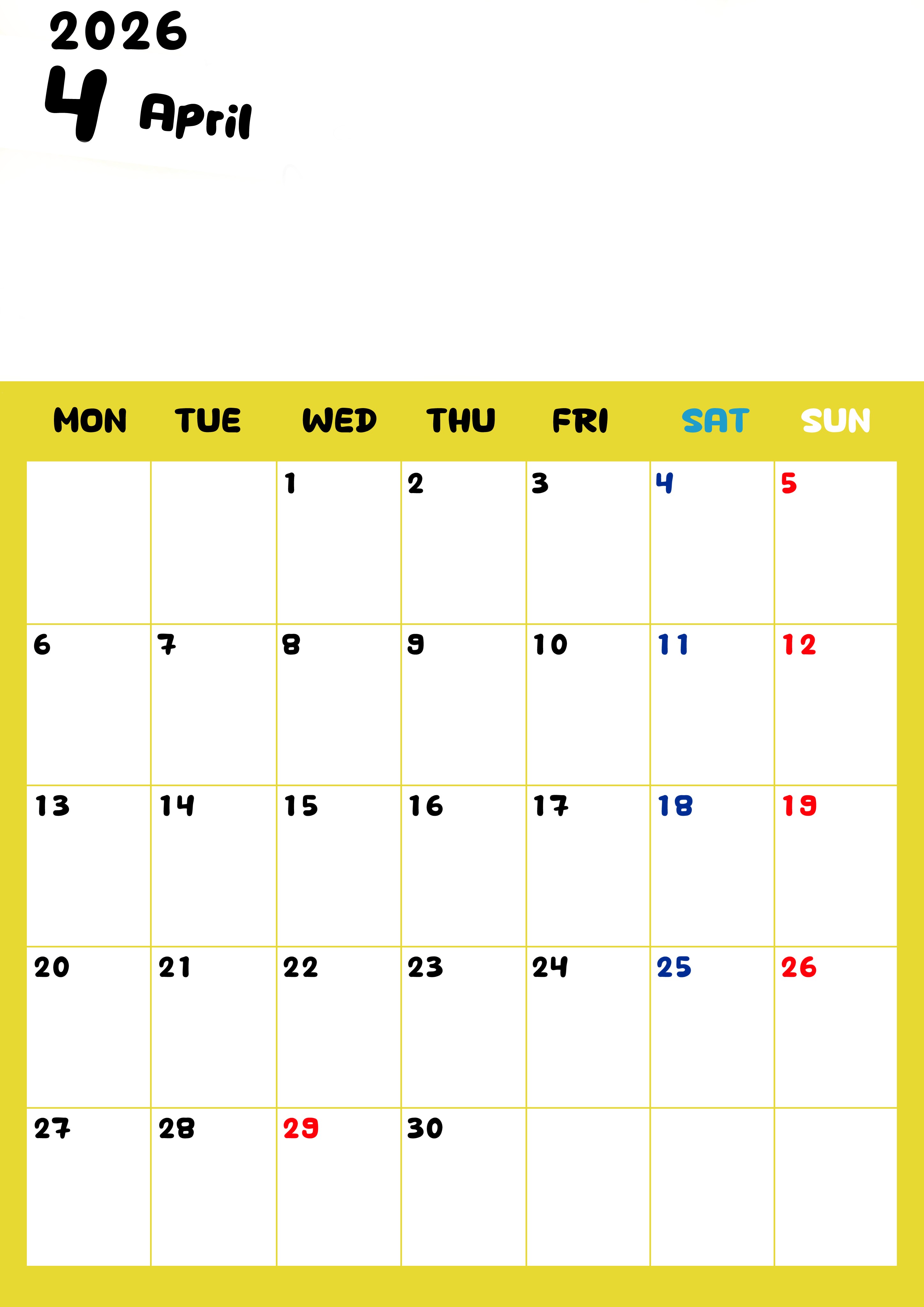 2026年4月縦型月曜始まりの書き込みしやすい文字が大きなA4無料シンプルなカレンダーです。見やすいのでダウンロード利用をおすすめします。計画を立てるのに最適です。(2026-01110411)